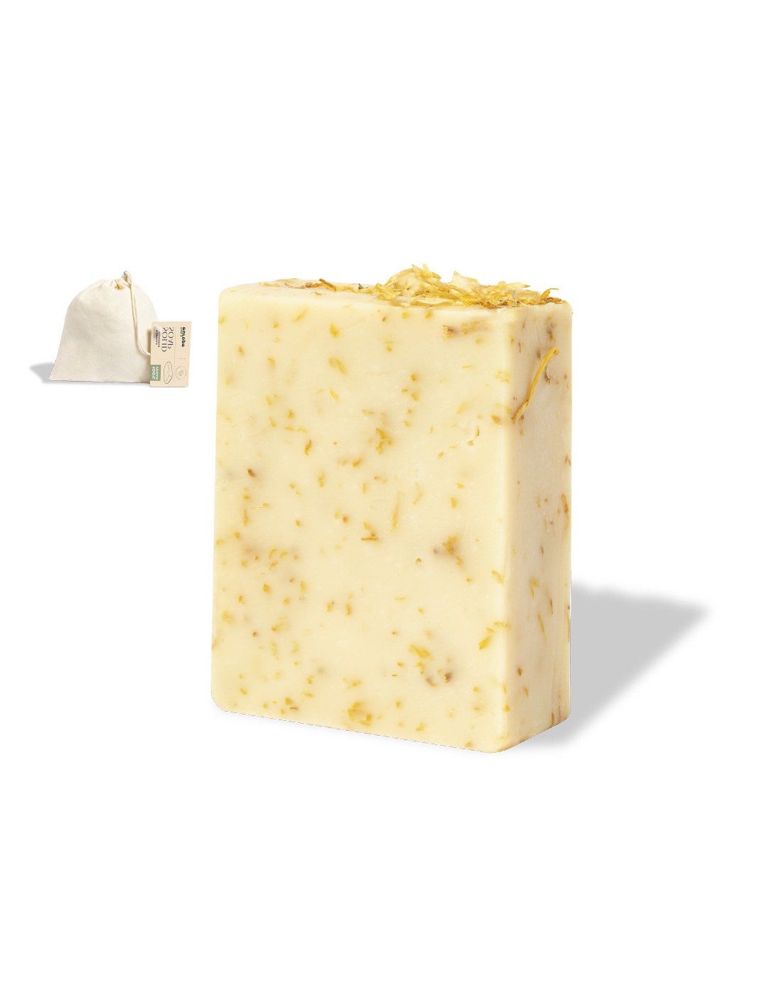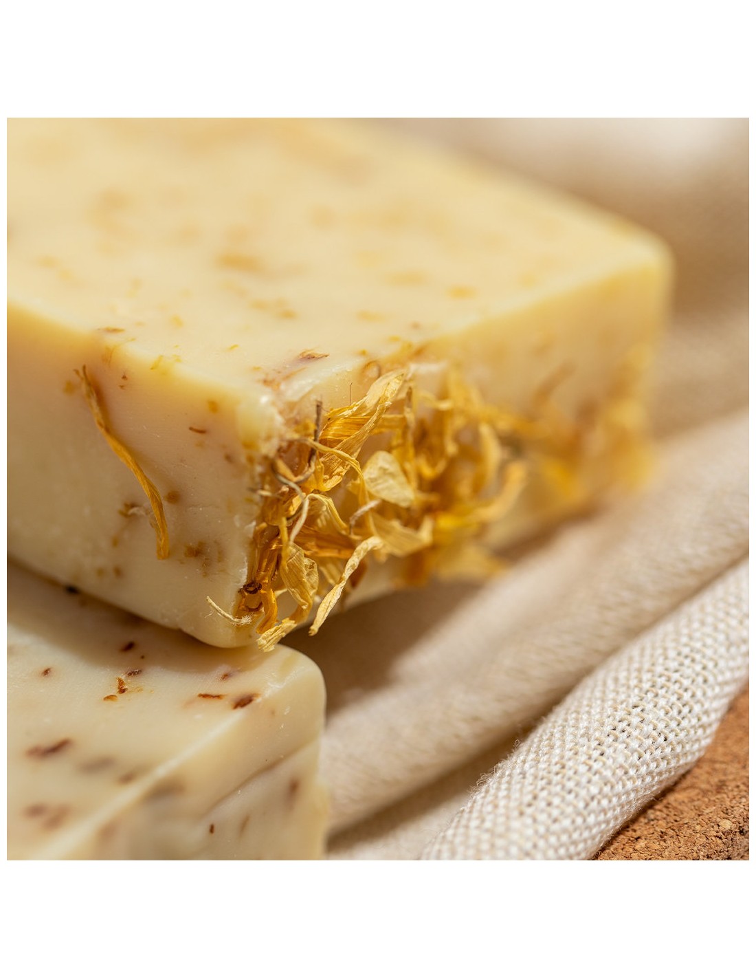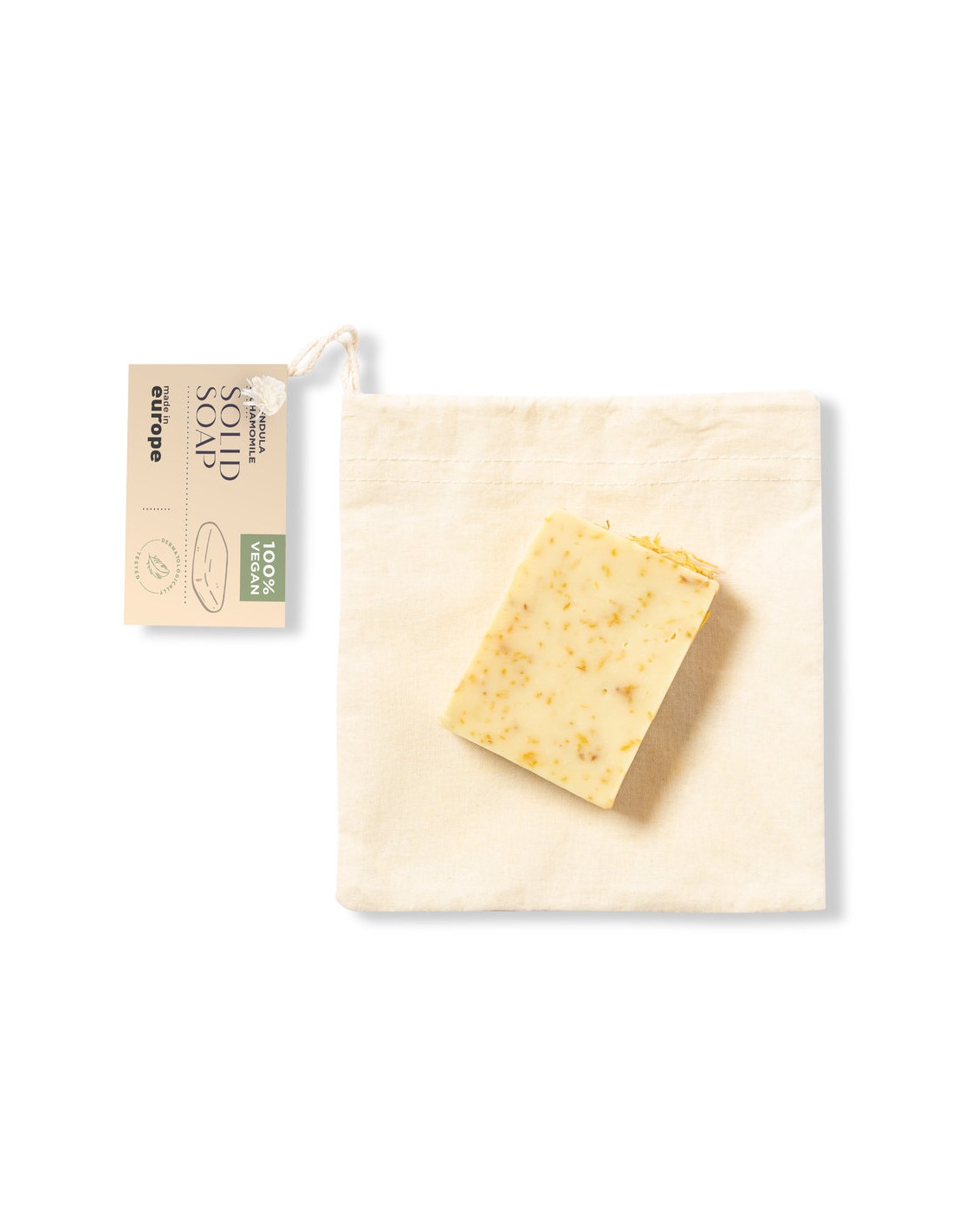 Pastilla de jabón vegano de 100 gr. Aroma de caléndula y manzanilla con propiedades calmantes, hidratantes y reparadoras. Dermatológicamente testado y de fabricación europea. Presentación en bolsa individual de algodón, con cierre de cordón y etiqueta distintiva. Producto sostenible y 100% vegano, sin ingredientes de procedencia animal. Además, no se han realizado pruebas de estos productos en animales, promoviendo el cuidado y respeto de todos ellos.