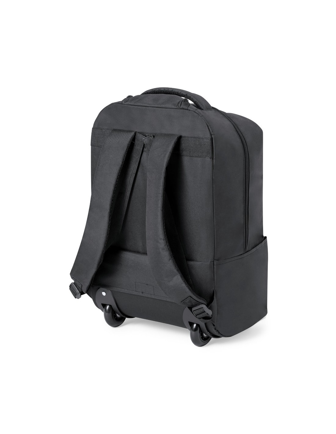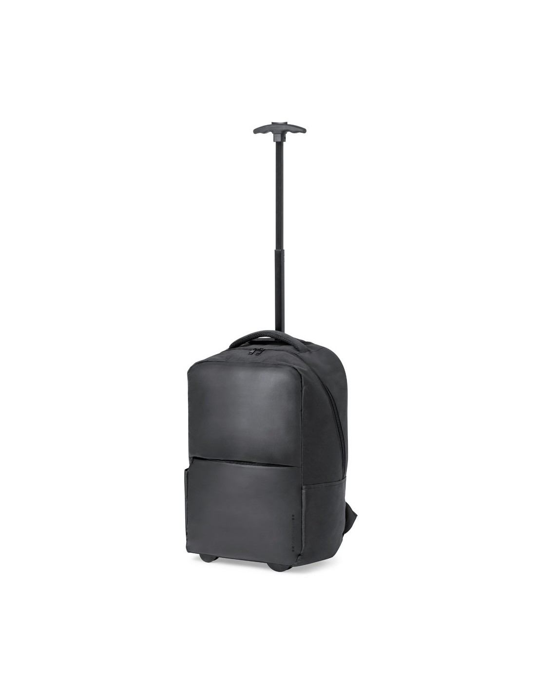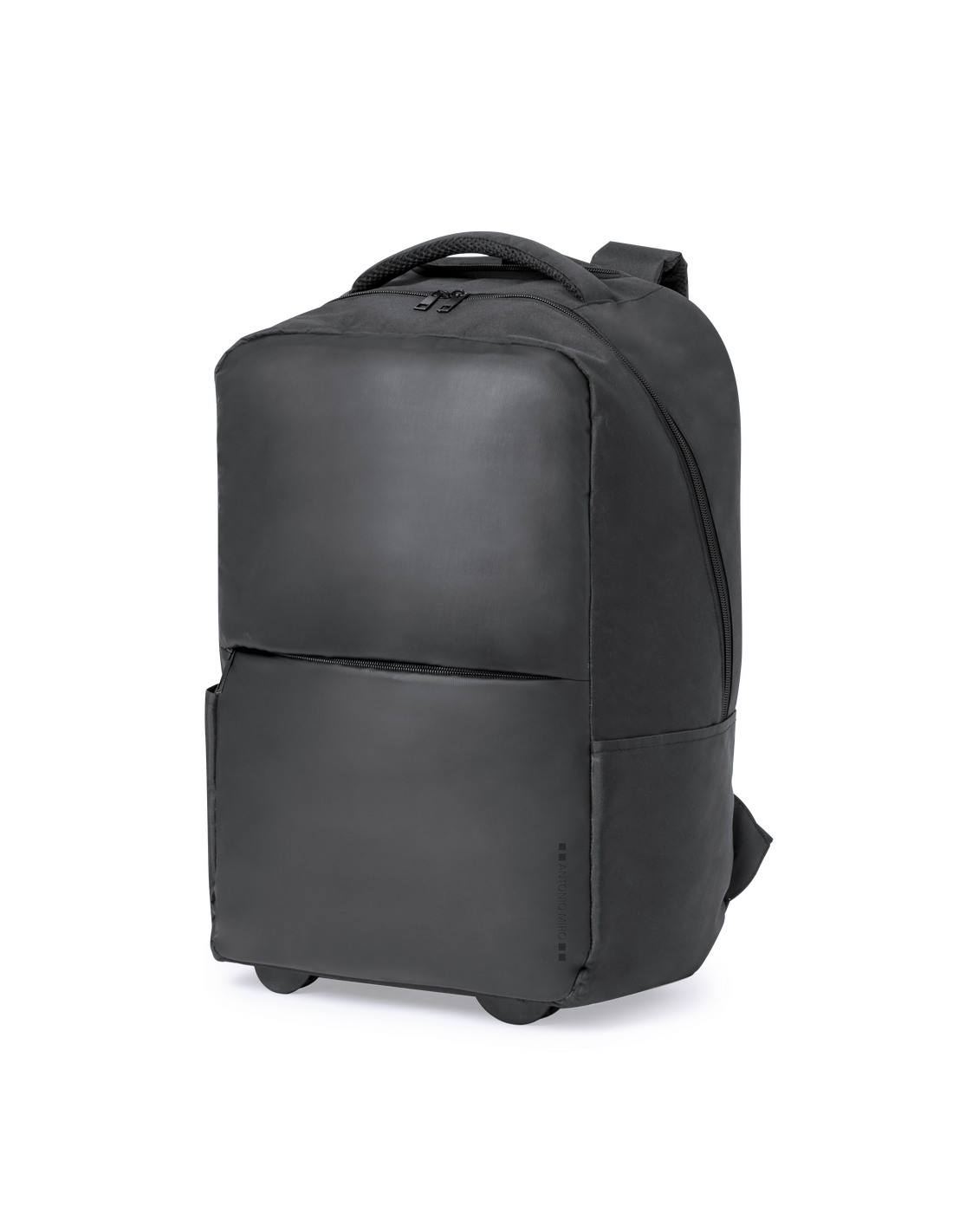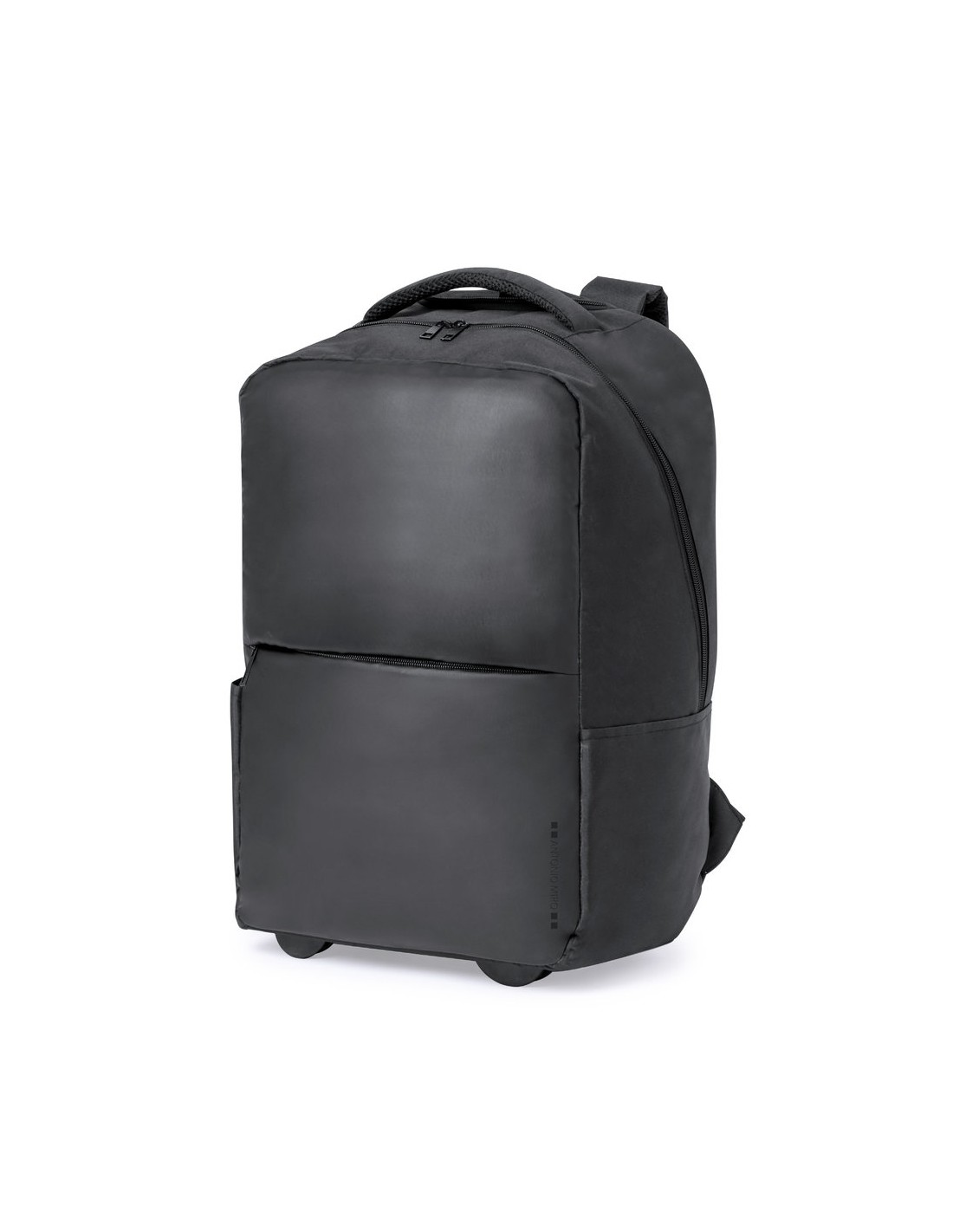 Mochila trolley de Antonio Miró, fabricada en resistente poliéster 300D con acabados en negro. Compartimento principal y bolsillo exterior con cierre de cremallera a juego, asa de transporte acolchada y bolsillos laterales con logotipo de la marca en un lado. Compartimento interior acolchado para ordenador portátil de hasta 15 pulgadas y bolsillo para tablet de hasta 11 pulgadas. Cintas para hombros acolchadas y ajustables.