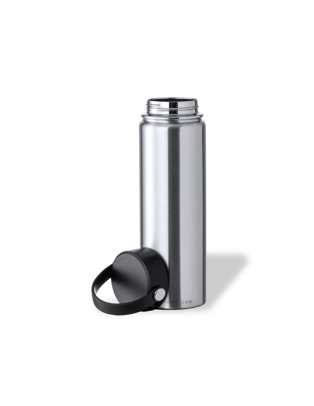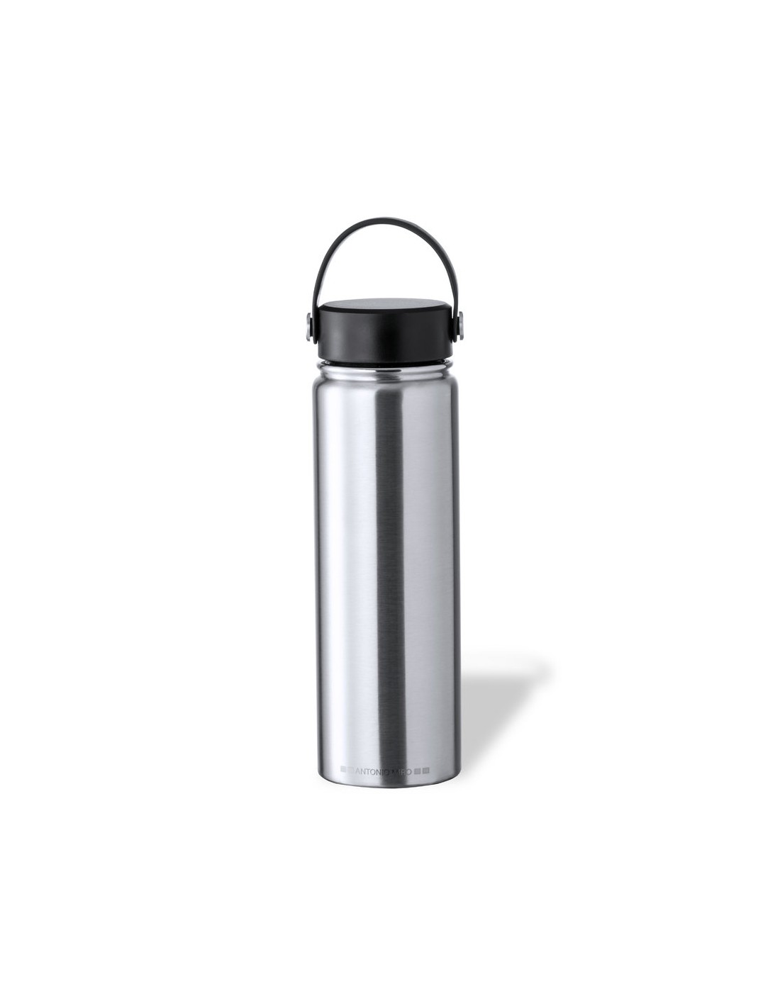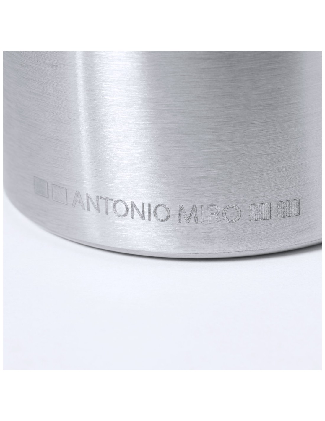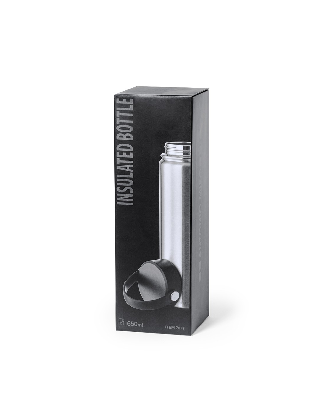Bidón térmico de Antonio Miró y 650 ml de capacidad. Fabricado en acero inox de doble pared y acabado satinado. Con tapón a rosca en negro y cinta de transporte a juego en silicona. Con logotipo Antonio Miró en cuerpo y presentado en caja individual negra con logotipo de la marca.Disponible manual de instrucciones en español e inglés.