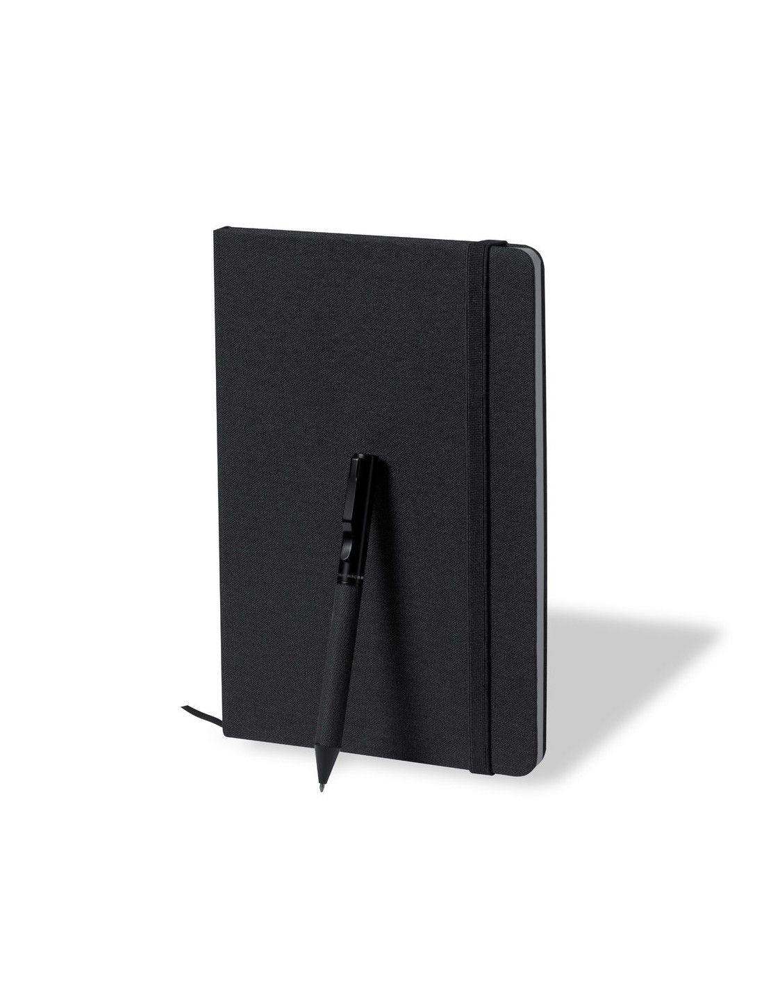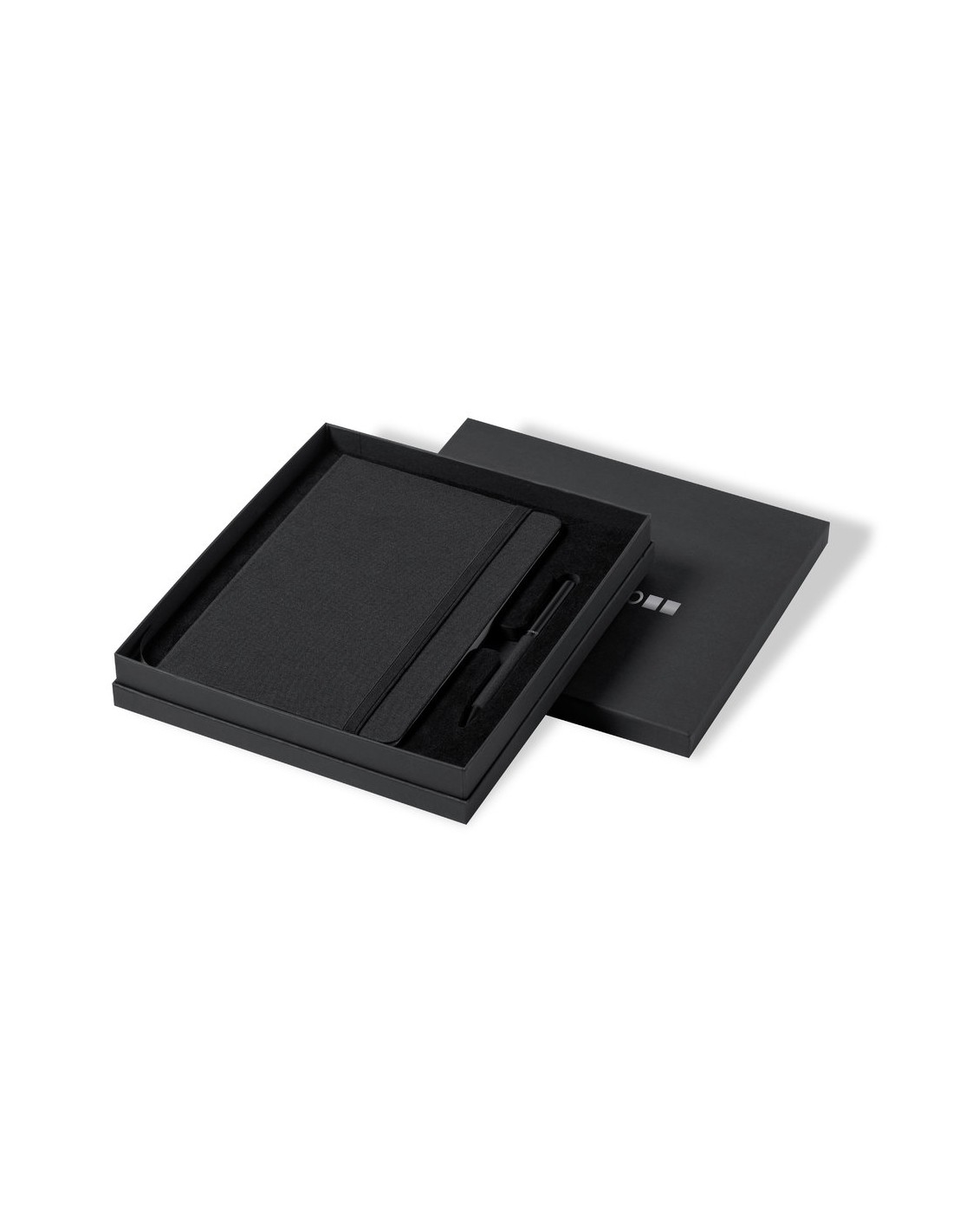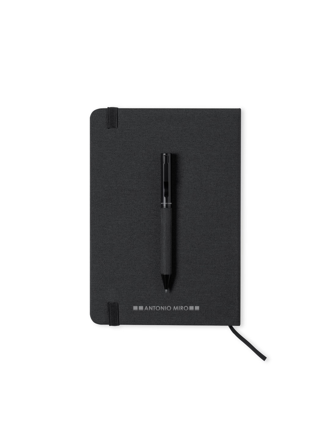 Set de bloc de notas y bolígrafo de Antonio Miró. Incluye: Bloc de notas de elegante acabado en negro, fabricado en resistente poliéster 300D, con tapas rígidas y elástico de sujeción a juego. Interior con 100 hojas de disposición a una raya. Bolígrafo metálico de mecanismo giratorio y en tinta azul. Con cuerpo y detalles en negro, clip metálico y logotipo de la marca. Set presentado en elegante y resistente caja individual negra con logotipo Antonio Miró y funda de protección a juego.