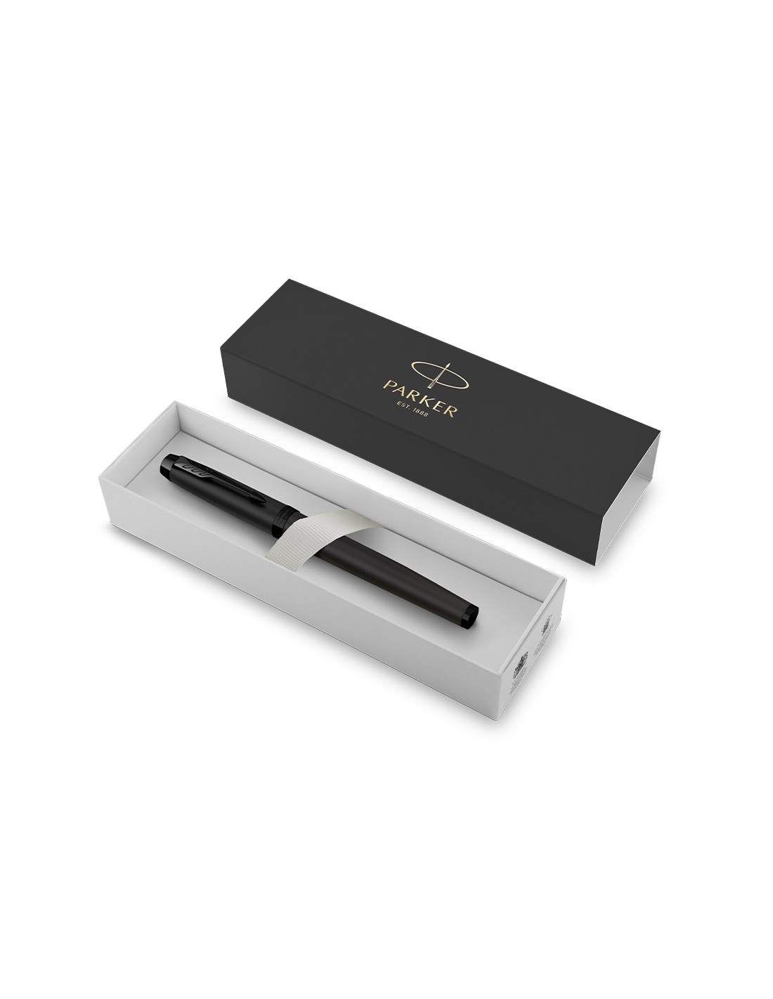 Roller Parker IM Achromatic, fabricado en acero inox de acabado lacado en negro mate y en tinta negra. Con adornos negros e inconfundible clip con la forma icónica en punta de flecha de la marca en la capucha. Un diseño elegante, refinado y de eficacia probada, complementado con una silueta moderna. Presentación en estuche individual negro con logotipo Parker. Parker IM es la gama de entrada al universo Parker, cuidada en cada detalle y pensada para el uso intensivo diario. Con tinta Parker Quink, que ofrece una escritura fluida y fiable sobre el papel.