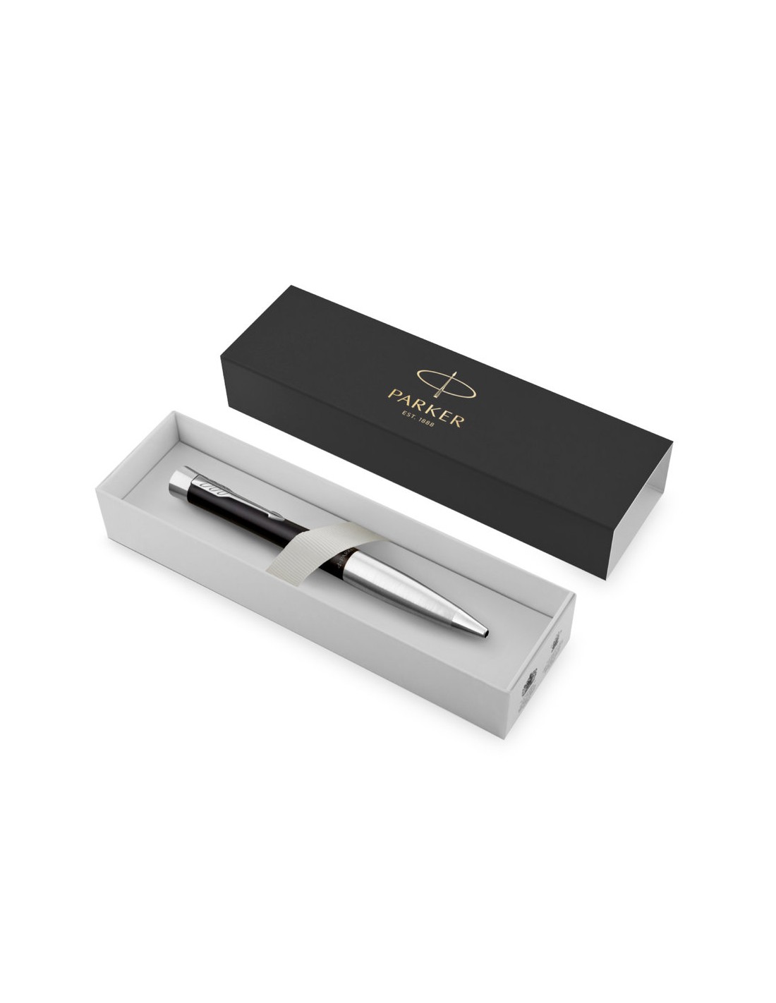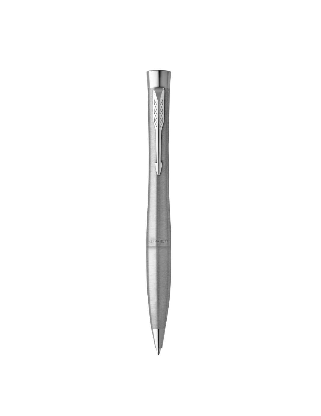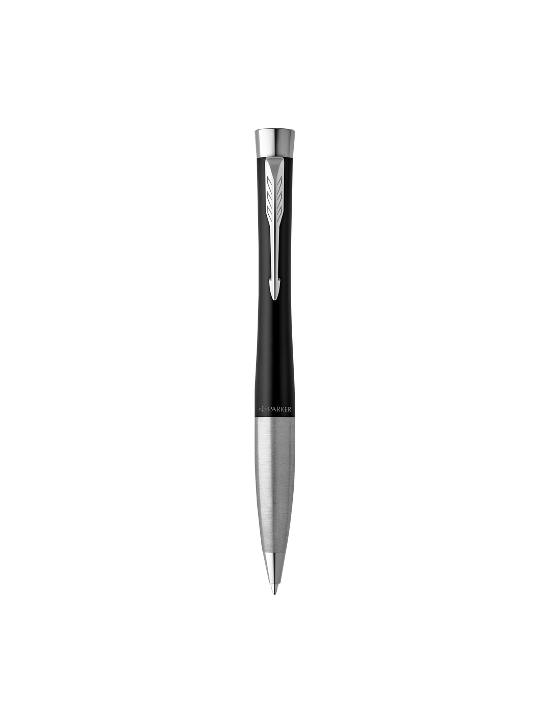 Bolígrafo Parker Urban Twist, fabricado en metal, con adornos cromados, y el inconfundible clip con la forma icónica en punta de flecha de la marca. De mecanismo giratorio y en tinta azul, con elegantes curvas en forma de reloj de arena que le dan un aspecto llamativo y moderno. Presentación en estuche individual negro con logotipo Parker. Con tinta Parker QuinkFlow, que ofrece una escritura fluida y fiable sobre el papel.
