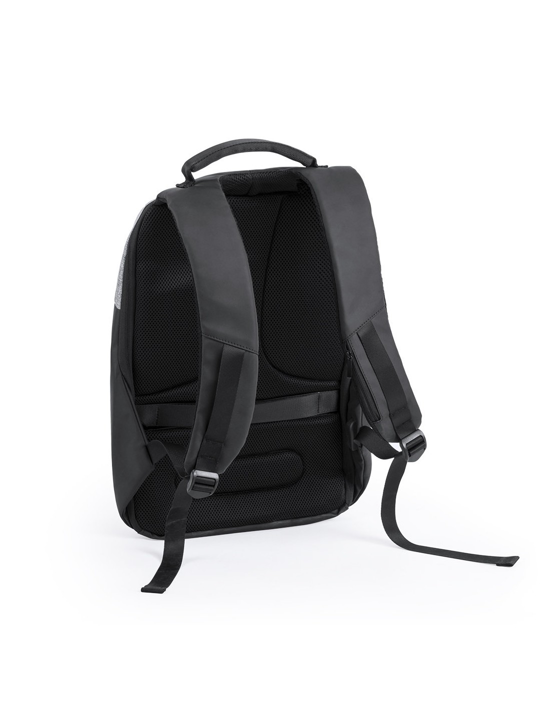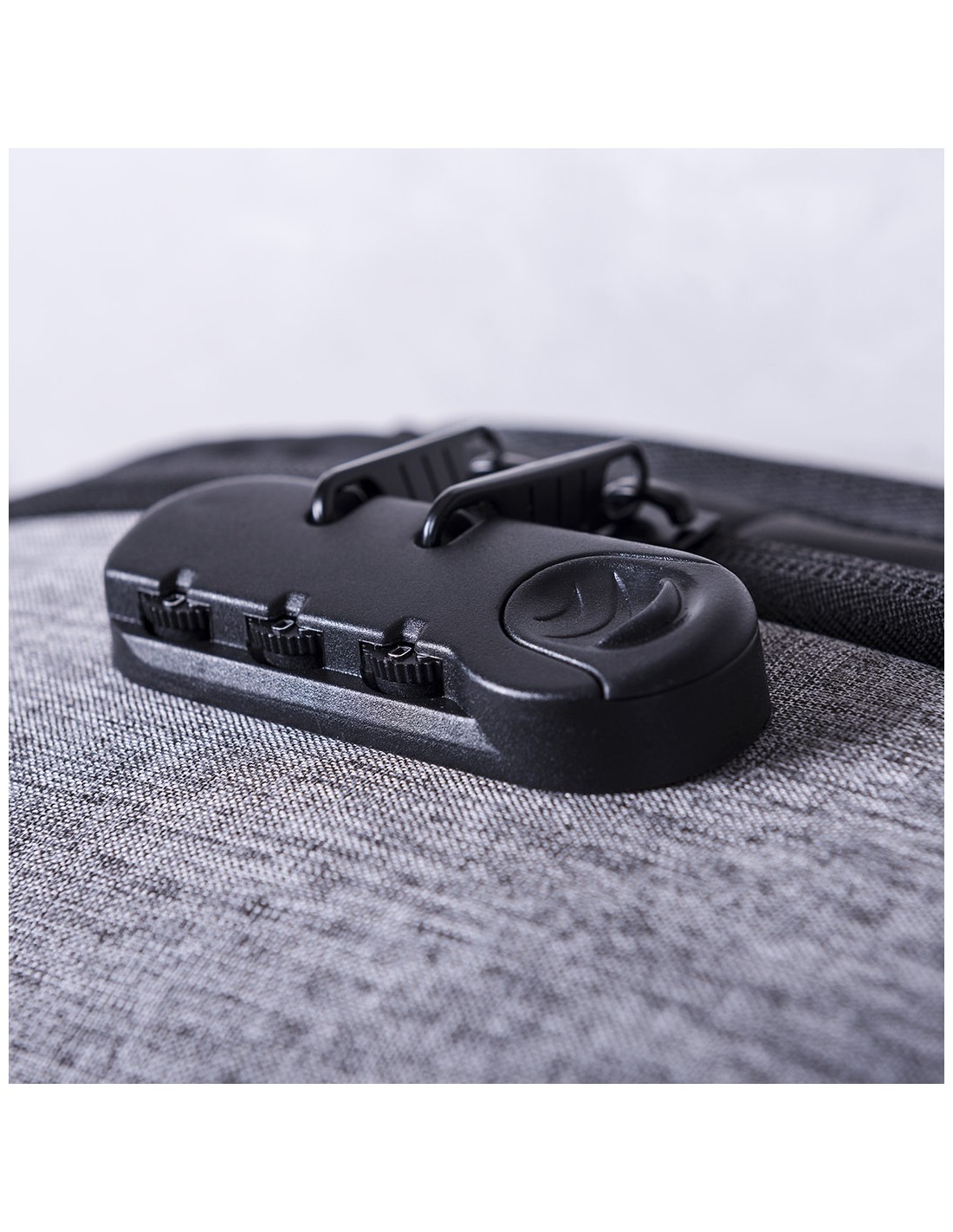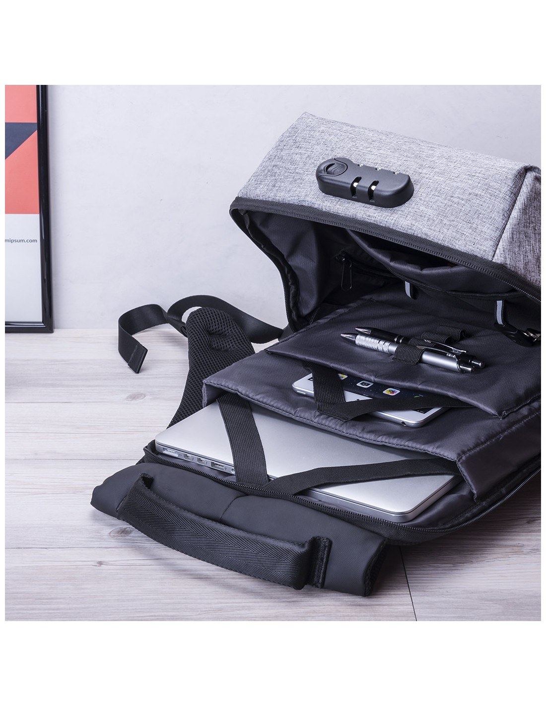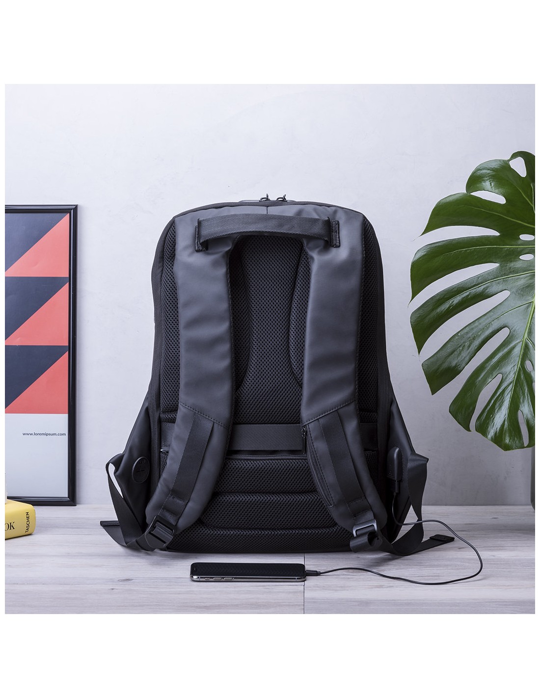 Mochila de negocios antirrobo repelente al agua en poliéster de alta calidad, resistente a cortes y a roces. Con candado de seguridad por contraseña, cinta reflectante trasera y accesorio para acople en trolley. Bolsillo antirrobo en la espalda para guardar objetos de valor. Compartimento interior con salida USB para conexión de powerbank -no incluido-, con cable micro USB de 1 metro de largo para total comodidad en la carga de cualquier dispositivo móvil. Salida para auriculares y bolsillo en cinta derecha con fácil acceso para tarjeta de transporte y otros documents de uso frecuente. Apertura total 180º para fácil acceso al interior de la mochila. Dos compartimento interiores independientes y acolchados para ordenador portátil de hasta 15 pulgadas y para tablets de hasta 10 pulgadas. Con multitud de bolsillos interiores y exteriores. Cintas de hombros y espalda con acolchado ergonómico.