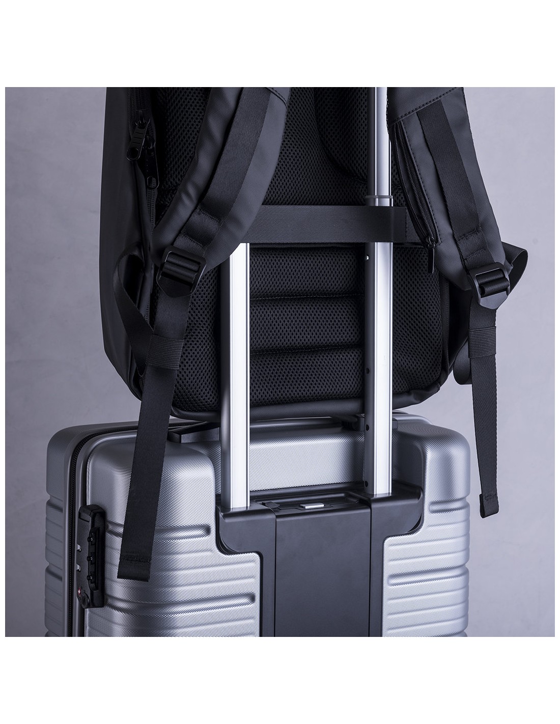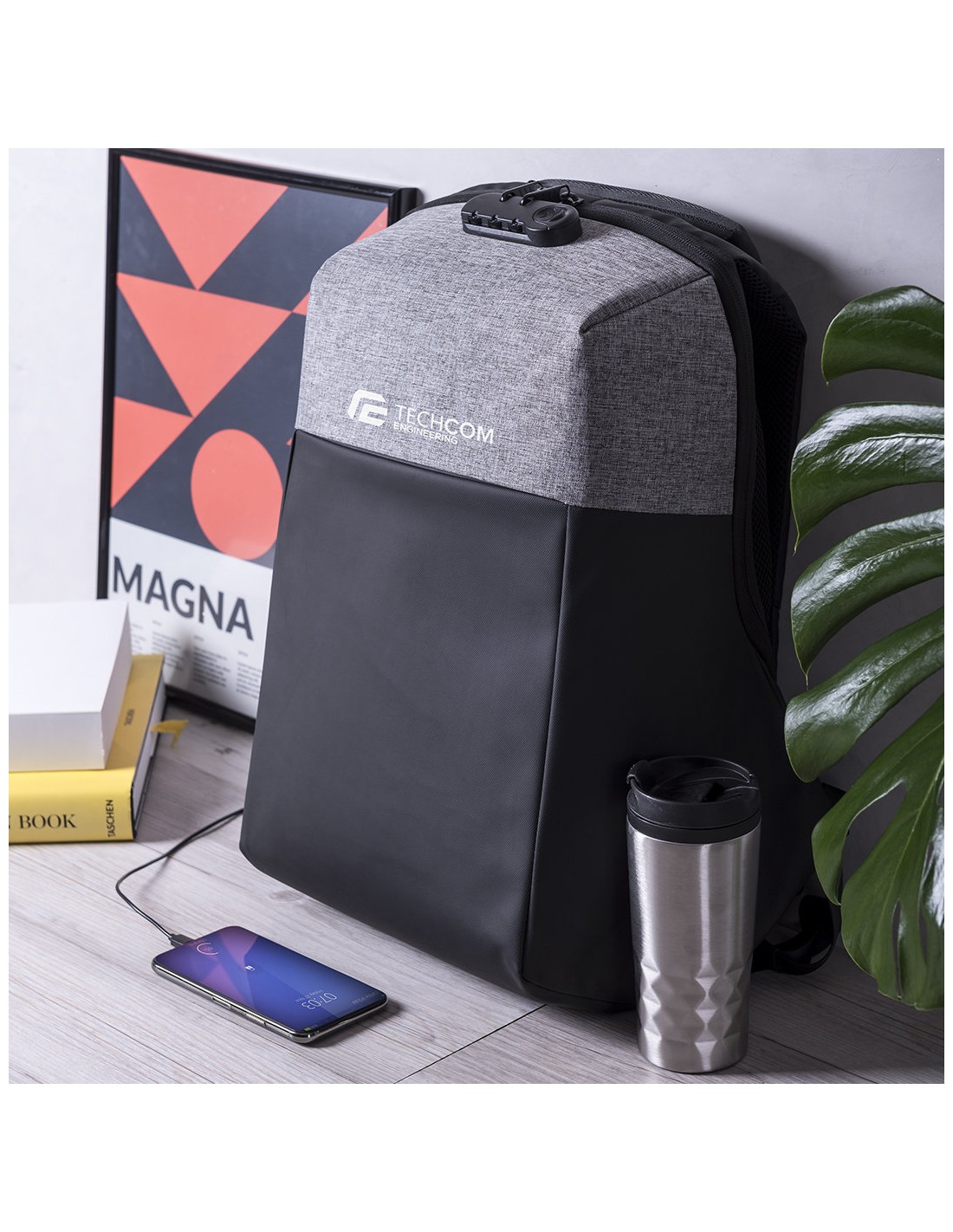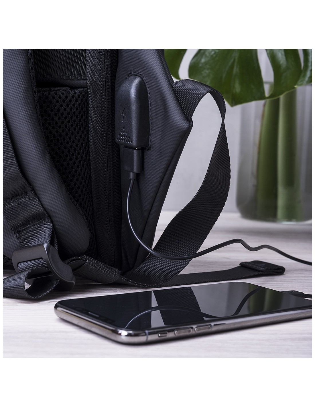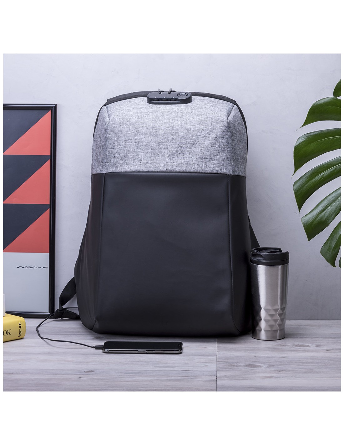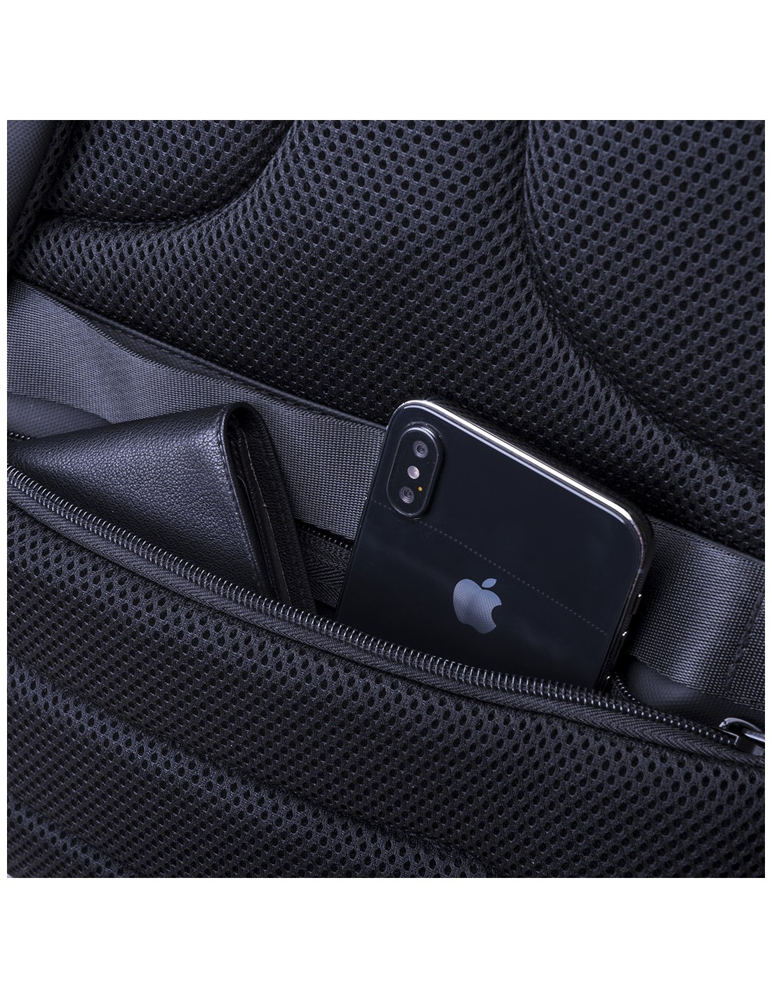 Mochila de negocios antirrobo repelente al agua en poliéster de alta calidad, resistente a cortes y a roces. Con candado de seguridad por contraseña, cinta reflectante trasera y accesorio para acople en trolley. Bolsillo antirrobo en la espalda para guardar objetos de valor. Compartimento interior con salida USB para conexión de powerbank -no incluido-, con cable micro USB de 1 metro de largo para total comodidad en la carga de cualquier dispositivo móvil. Salida para auriculares y bolsillo en cinta derecha con fácil acceso para tarjeta de transporte y otros documents de uso frecuente. Apertura total 180º para fácil acceso al interior de la mochila. Dos compartimento interiores independientes y acolchados para ordenador portátil de hasta 15 pulgadas y para tablets de hasta 10 pulgadas. Con multitud de bolsillos interiores y exteriores. Cintas de hombros y espalda con acolchado ergonómico.