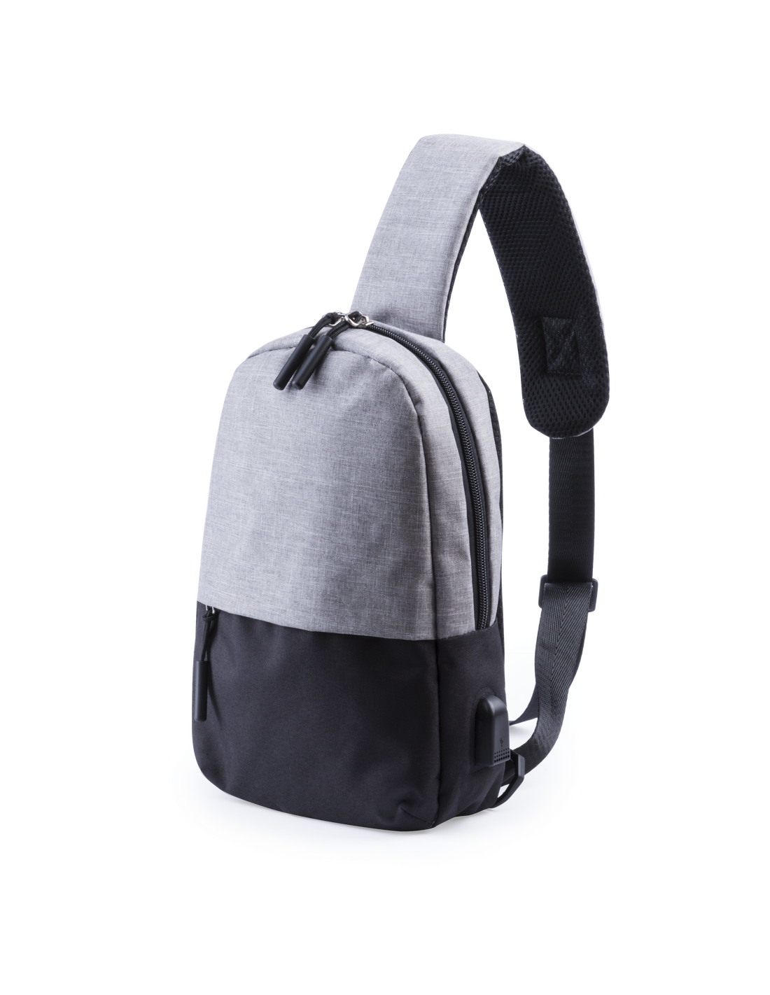Bandolera multiusos en resistente poliéster 300D. De atractivo diseño urbano, en combinación de colores gris denim y negro. Con conexión USB para carga -powerbank y cable no incluídos- y bolsillo acolchado para tablet de hasta 10 pulgadas. Espalda y cinta acolchadas, con cinta de ajuste regulable. Bolsillo principal de fácil apertura, con cierre de cremallera y resistentes tiradores.