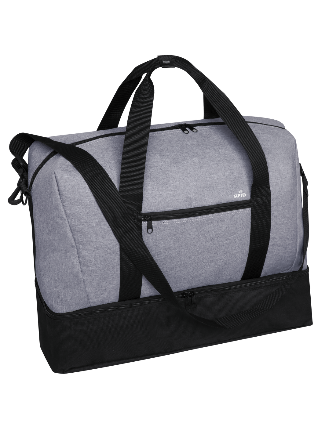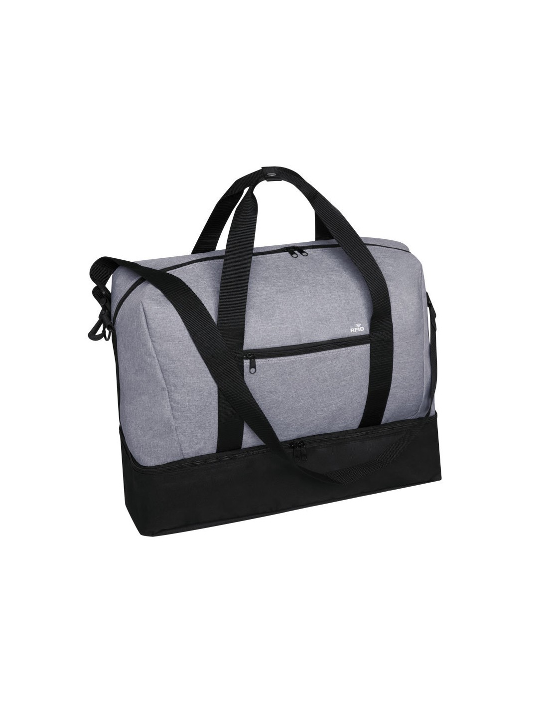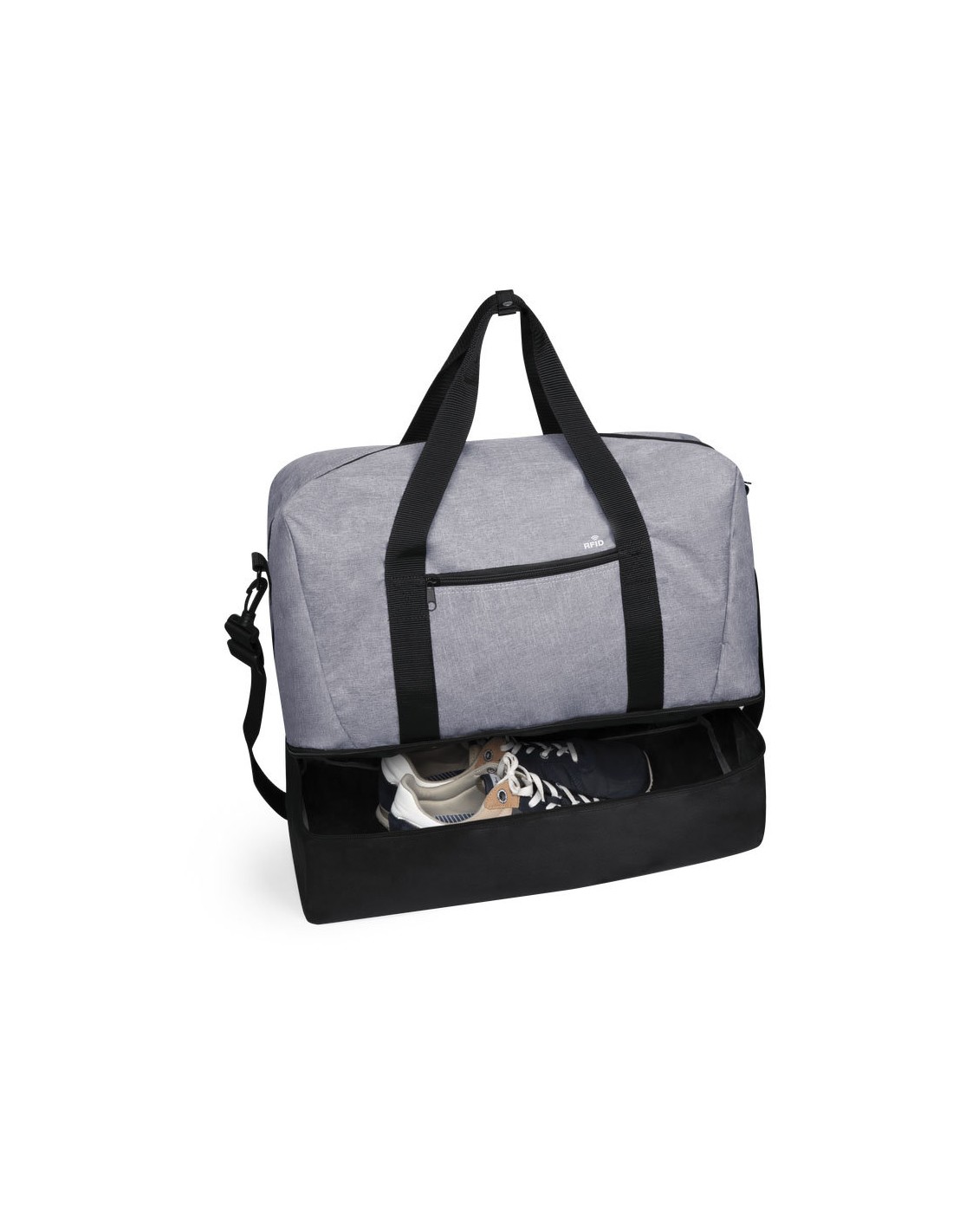 Bolso multiusos en resistente poliéster 600D de acabado denim. De diseño urbano, incluye bolsillo con tecnología de seguridad RFID (Identificación por Radio Frecuencia) que mantiene seguros tus dispositivos de transmisión de identidad. Compartimento independiente de cierre de cremallera para el calzado y bolsillo lateral de cremallera. Compartimento principal con cierre de cremallera de doble tirador y asas de transporte reforzadas, con cierre de botón. Refuerzo de nylon alrededor del cuerpo y cinta bandolera ajustable.