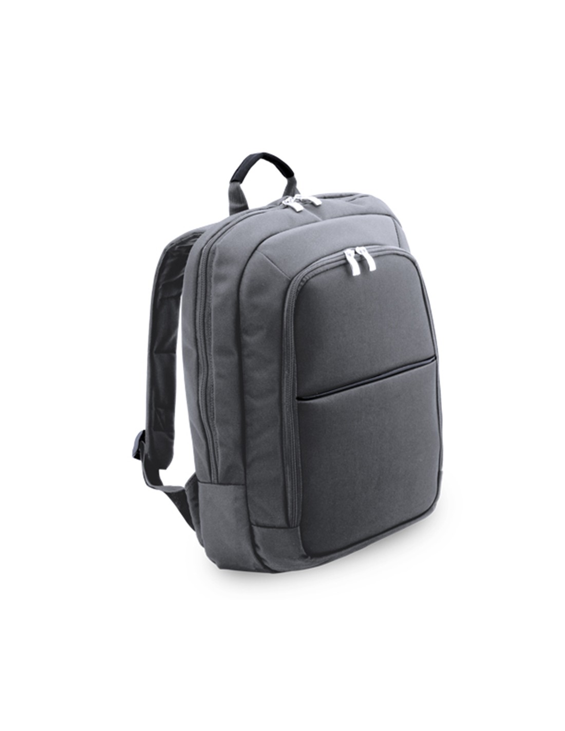 Mochila de resistente nylon 900D de sobrio diseño con cierre de cremallera, bolsillo frontal y asa reforzada. Con acolchado en espalda y cintas de hombros, incluye compartimento interior acolchado para ordenador portátil de hasta 14 pulgadas.