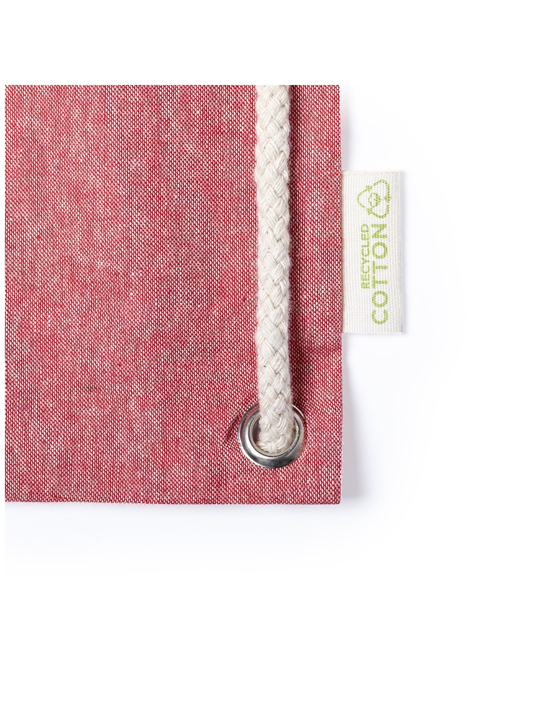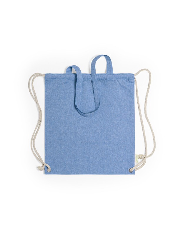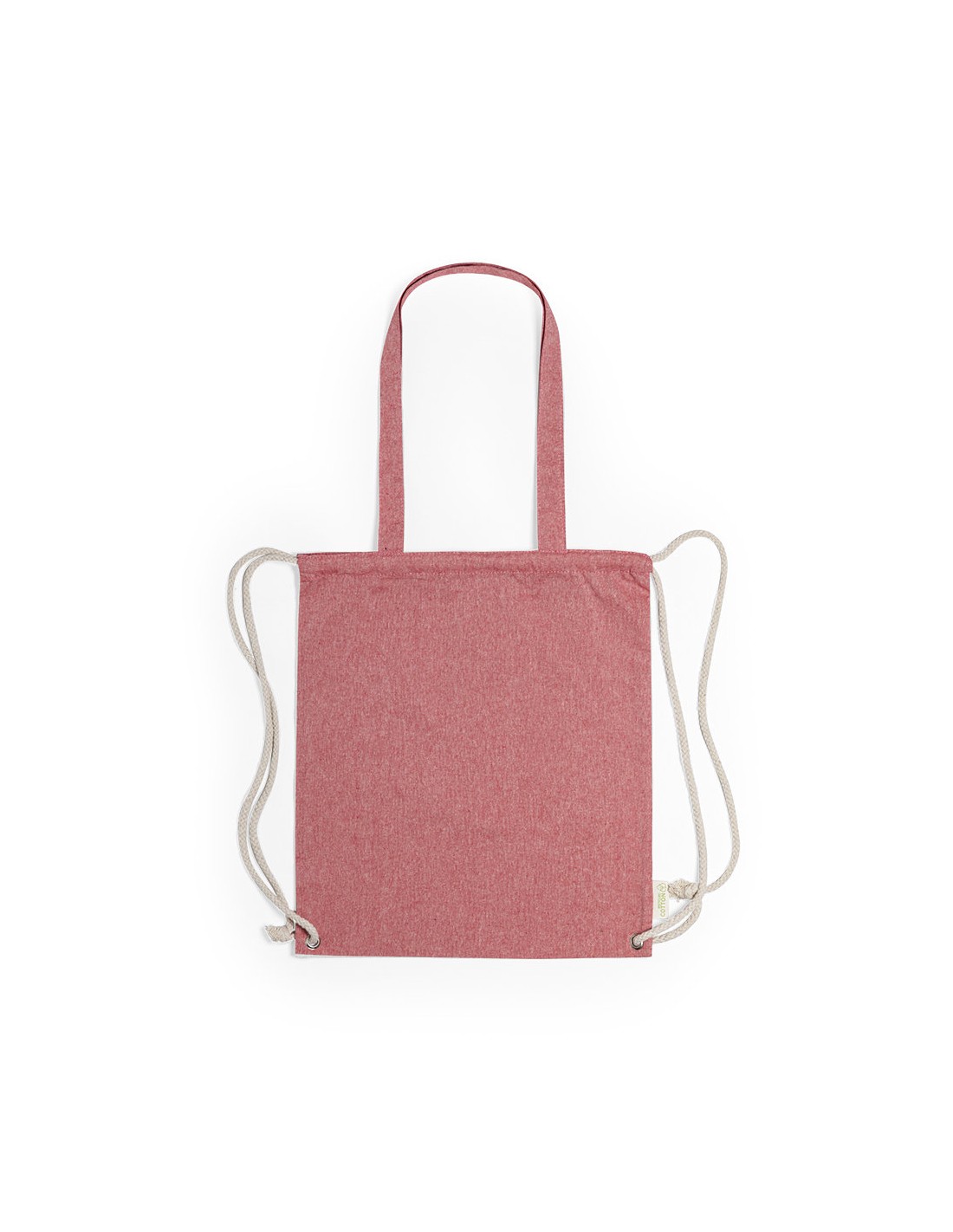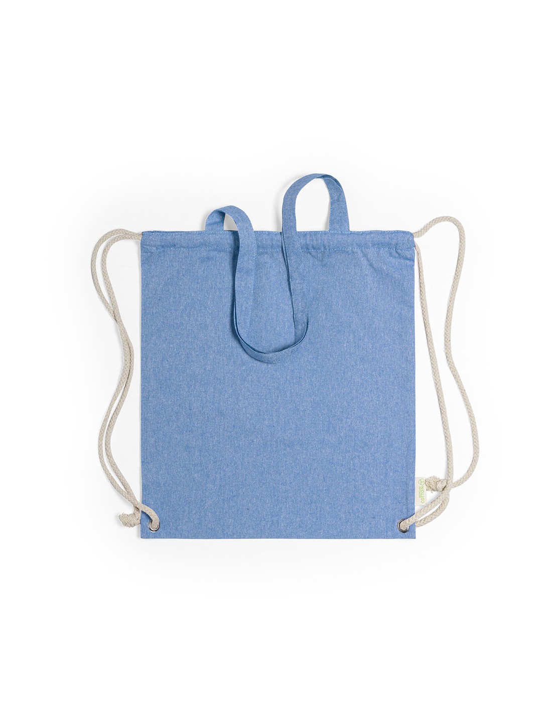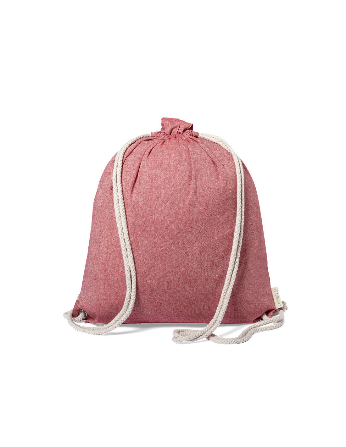 Bolsa mochila de cuerdas de línea nature, en resistente algodón reciclado de 140g/m2, con asas de transporte de 70 cm a juego. Cuerdas en algodón de color crudo, con argollas metálicas reforzadas y distintivo algodón reciclado en etiqueta. Disponible en variada gama de colores. Resistencia hasta 9kg de peso.