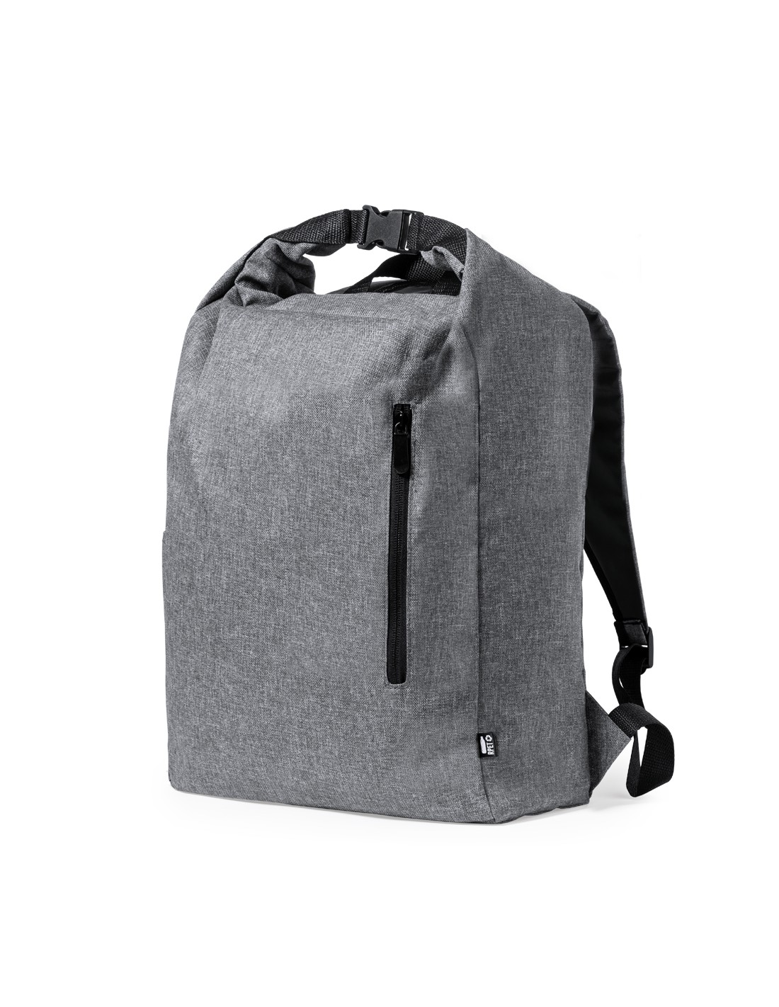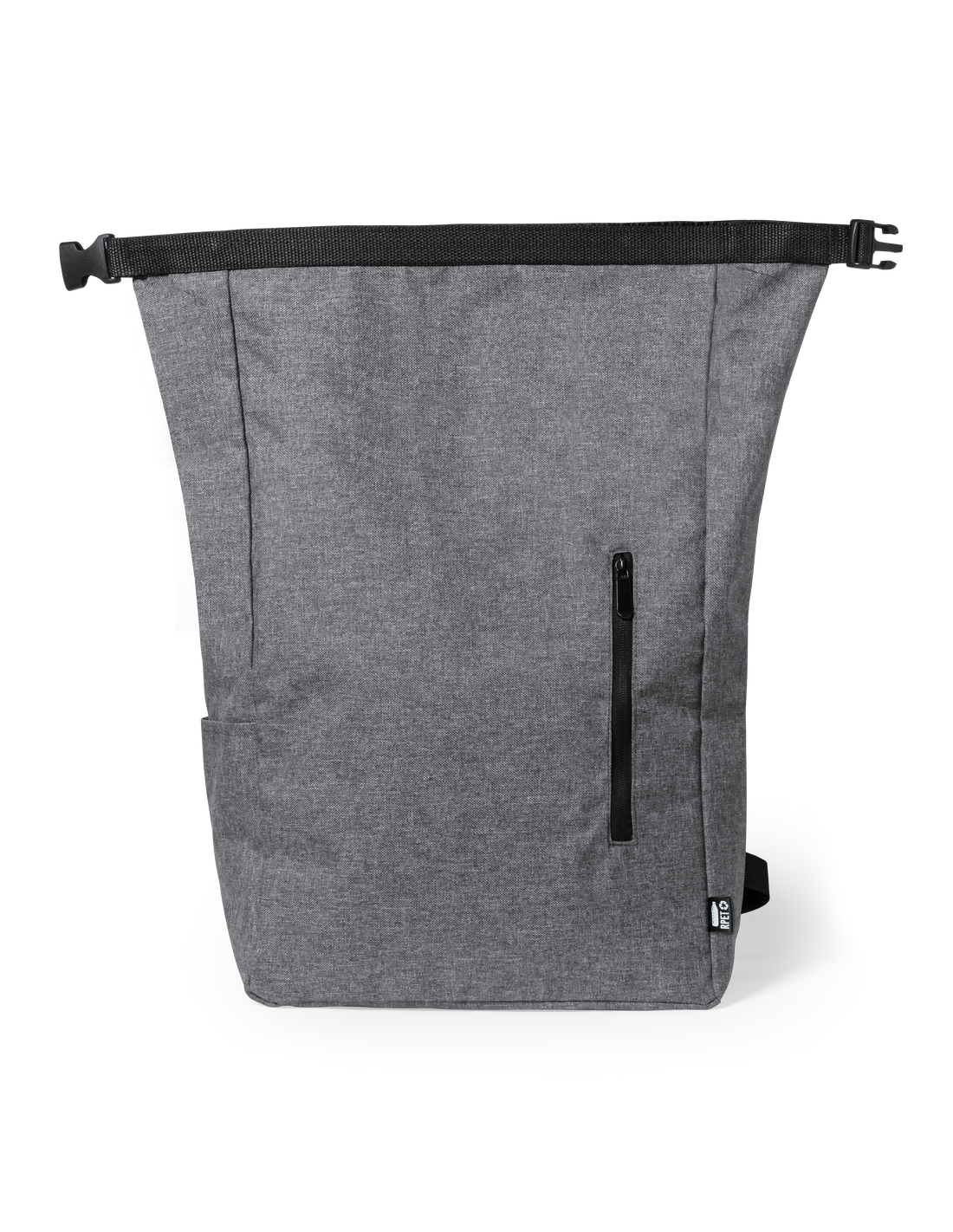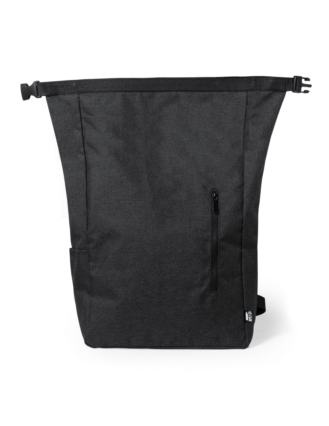 Mochila de línea nature fabricada en resistente 300D RPET, elaborado a partir de plástico reciclado, para así fomentar la reutilización de residuos plásticos y contribuir a la sostenibilidad del planeta. Bolsillo principal con cierre de hebilla y bolsillo lateral. Cintas acolchadas ajustables para hombro y distintivo RPET en etiqueta exterior.
