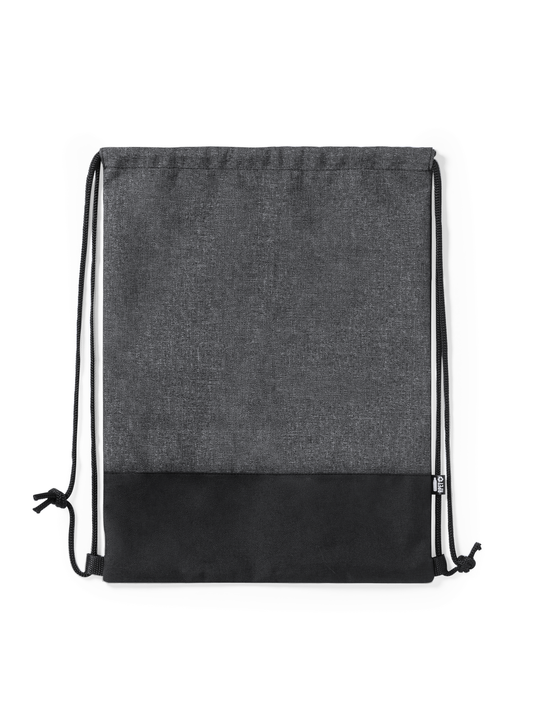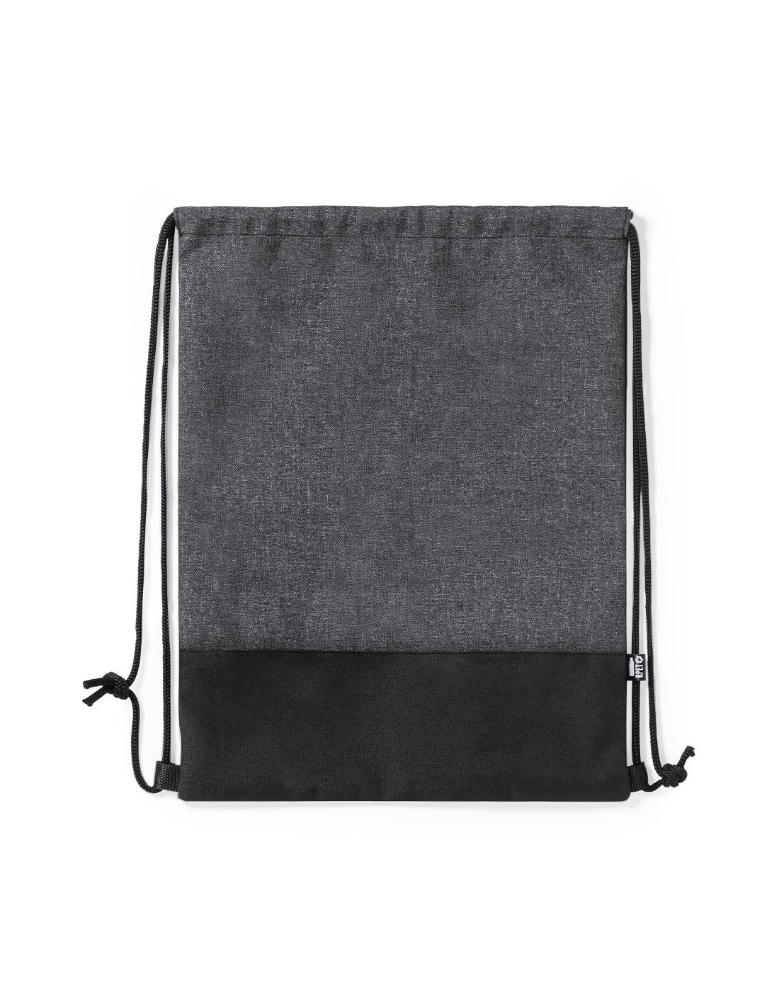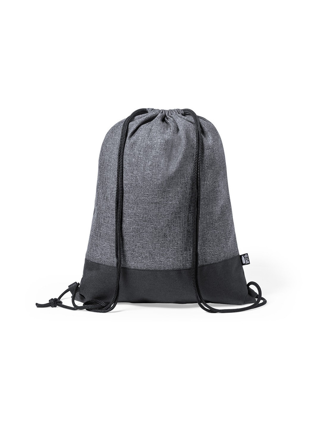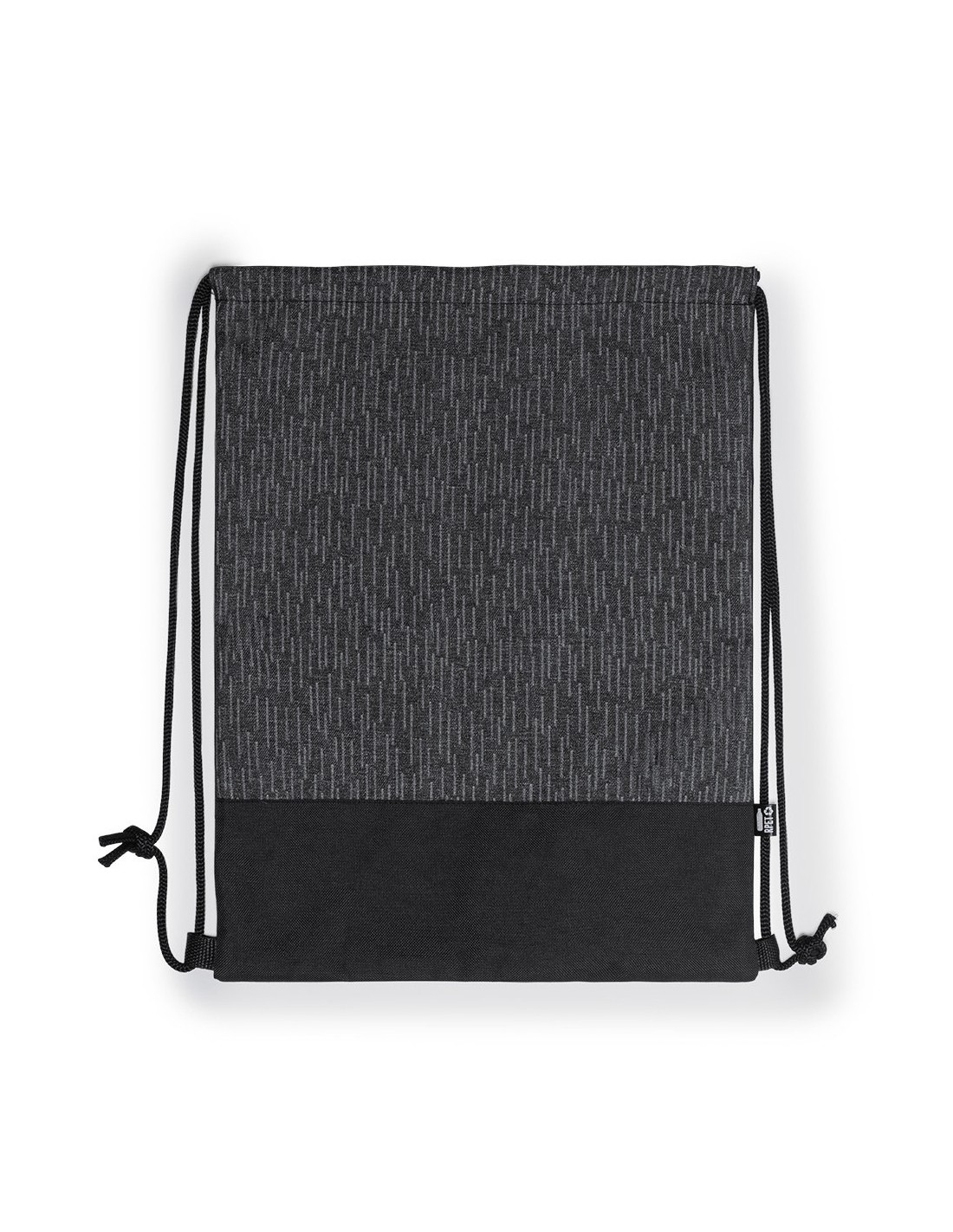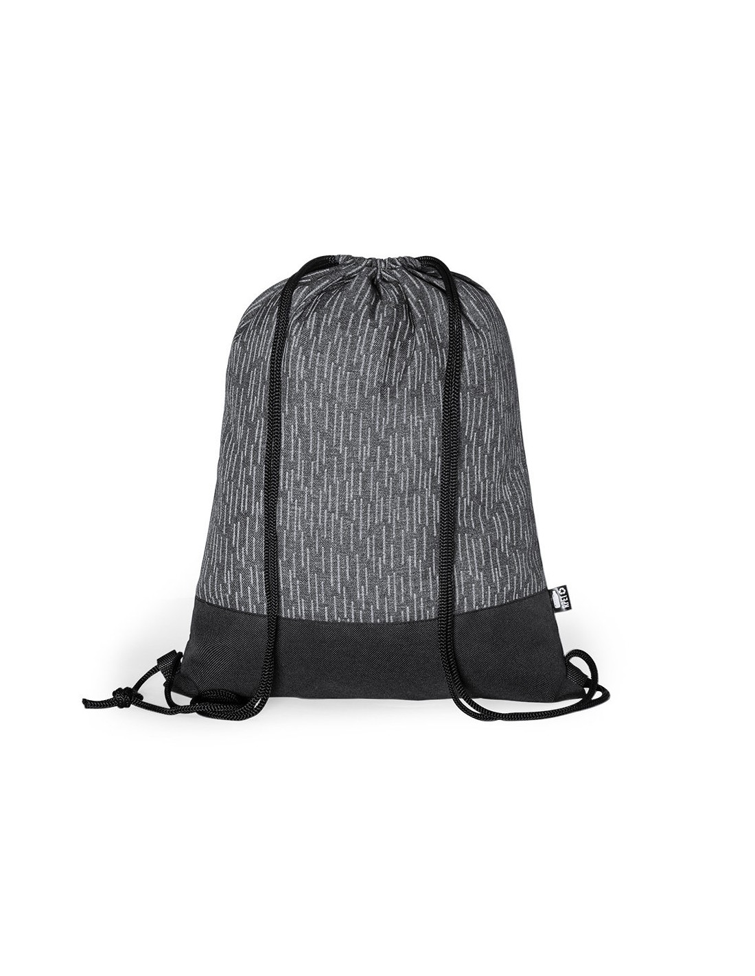 Mochila de cuerdas reflectante de línea nature en resistente poliéster 600D RPET, elaborado a partir de plástico reciclado, para así fomentar la reutilización de residuos plásticos y ayudar a la sostenibilidad del planeta. En elegante combinación de colores negro y gris, con cuerdas autocierre en negro. Etiqueta distintiva RPET. Fabricada empleando filamentos con gran capacidad para reflejar intensamente la luz, gracias a millones de pigmentos reflectantes y basándose en el principio de la retro-reflexión de la luz, una propiedad de visibilidad nocturna que consiste en la refracción de la luz hacia la fuente de origen de la misma.