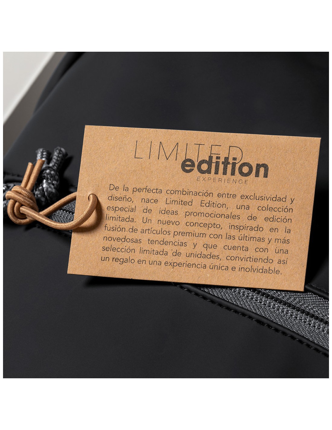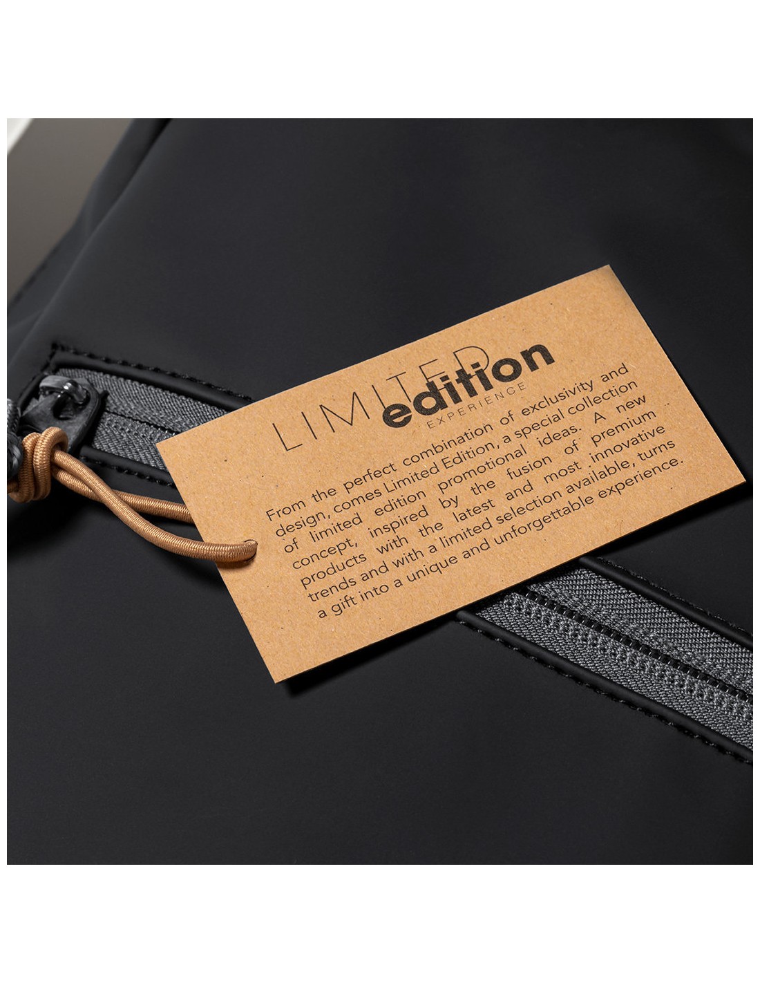Mochila de la más alta gama colección Limited Edition. Un complemento moderno, funcional y de gran belleza que sobrepasa todas las expectativas. Caracterizada por su elegante y minimalista diseño así como su calidad premium en resistente material texturizado de superficie infinita 600D/PVC. Cierre de cremallera invisible y bolsillo frontal. Con acolchado ergonómico en espalda y cintas de hombros, incluye compartimento interior acolchado para portátil de hasta 15 pulgadas y multiples compartimentos elásticos para una óptima organización de sus accesorios. De la perfecta combinación entre exclusividad y diseño, nace Limited Edition, una colección especial de ideas promocionales de edidición limitada. Un nuevo concepto, inspirado en la fusión de artículos premium con las últimas y más novedosas tendencias y que cuenta con una seleción limitada de unidades, convirtiendo así un regalo en una experiencia única e inolvidable. Exclusivo estuche de presentación Limited Edition, con diseño protegido por derechos de propiedad industrial. Incluida tarjeta con descripción de Limited Edition en cartón reciclado.