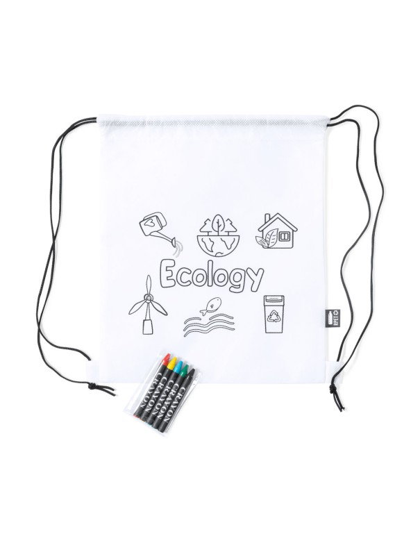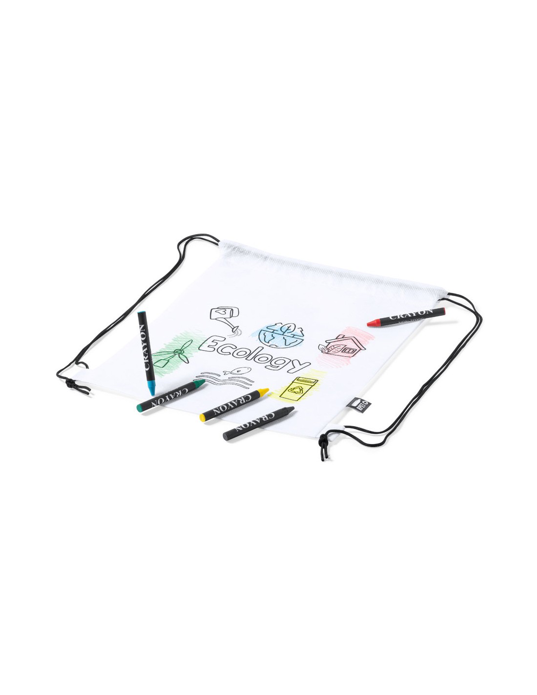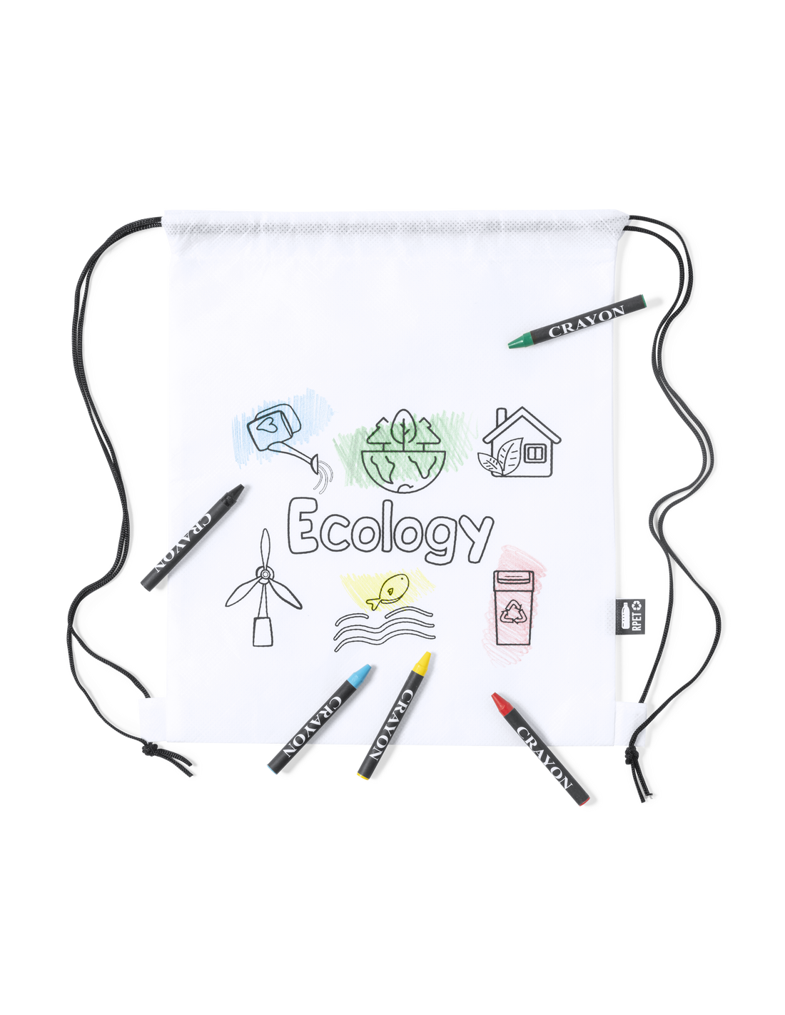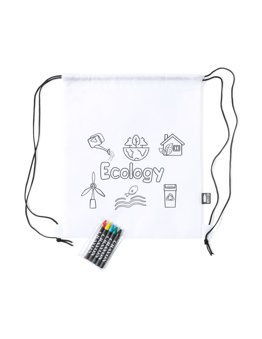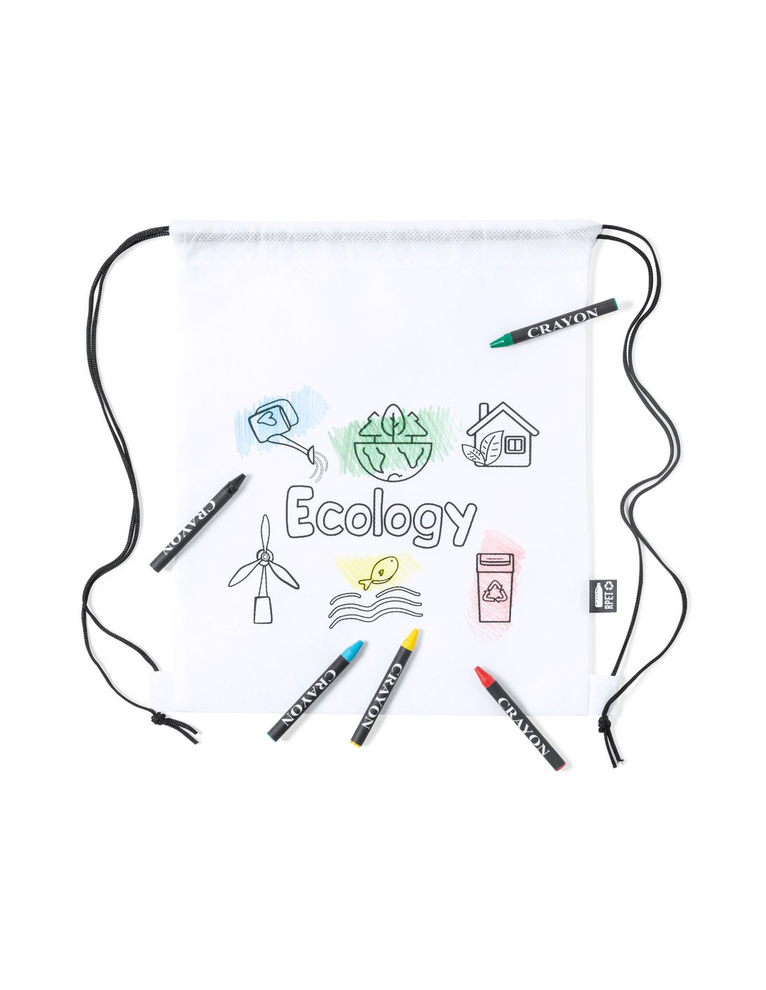 Mochila de cuerdas fabricada en non-woven RPET de color blanco, especialmente diseñada para colorear con ceras. Incluye 5 ceras en variados colores. Con cuerdas de cierre en color negro y refuerzo en las esquinas. Distintivo RPET en etiqueta exterior.El material RPET se elabora a partir de plástico reciclado, para así fomentar la reutilización de residuos plásticos y ayudar a la sostenibilidad del planeta.