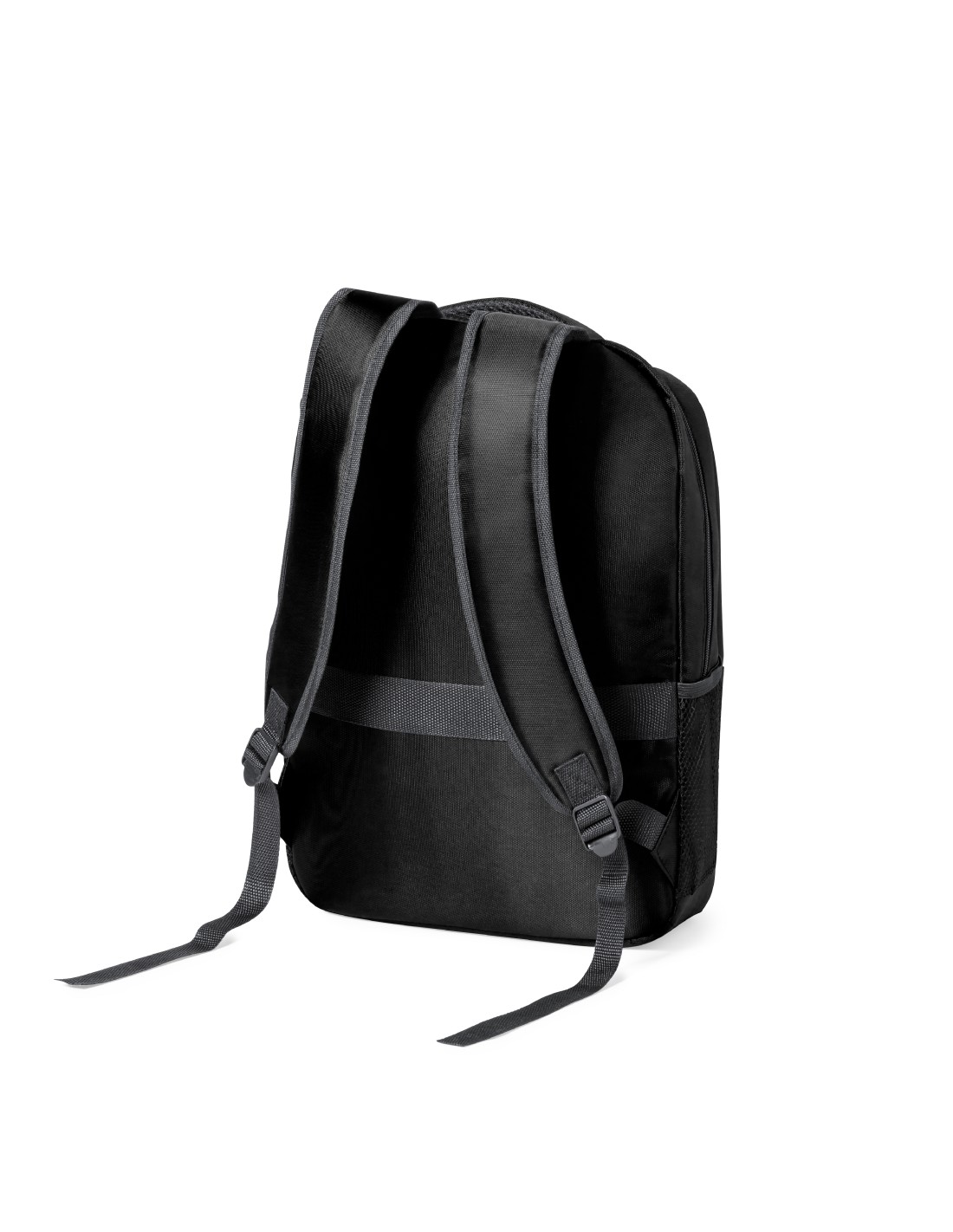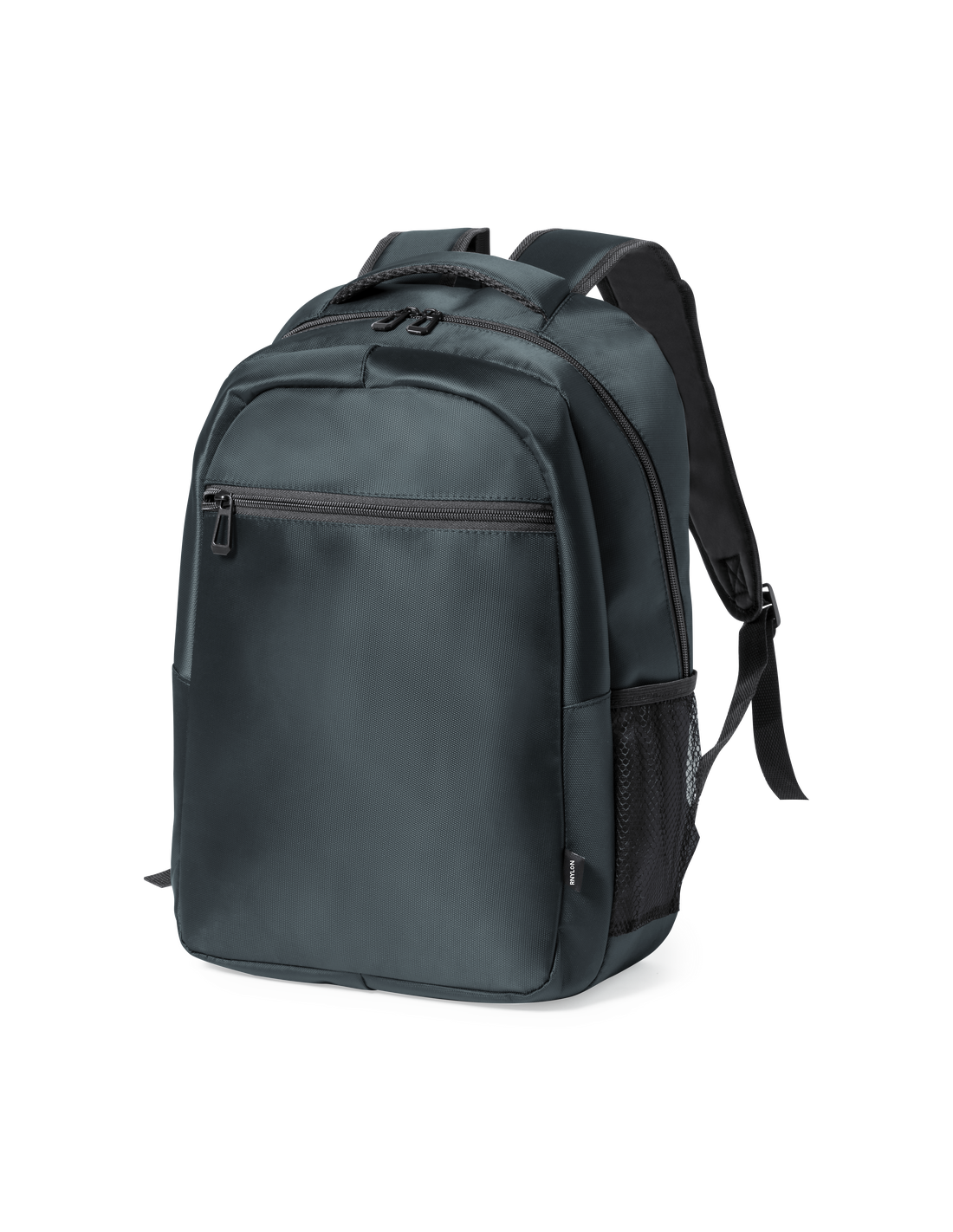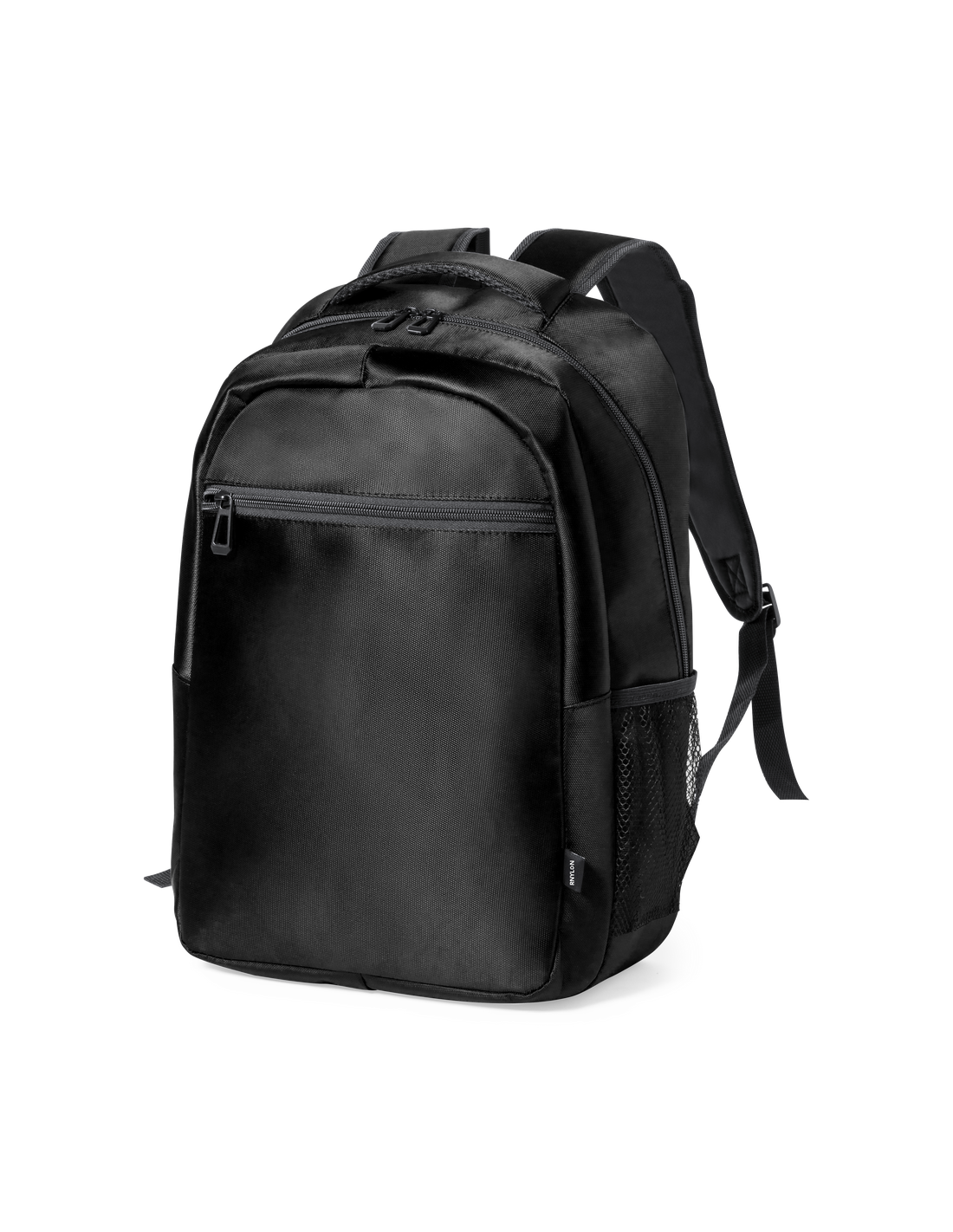 Mochila de alta calidad fabricada en RNYLON 420D. Compartimento principal con cierre de cremallera a juego y doble tirador. Incluye bolsillo exterior de cremallera y 2 bolsillos laterales de redecilla. Acolchado en asa, parte trasera y cintas para hombros, estas últimas ajustables. Interior con compartimento acolchado para ordenador portátil de hasta 15 pulgadas y accesorio en espalda para ajuste en trolley. Disponible en variada gama de colores, con distintivo reciclado en etiqueta exterior.El material RNYLON se elabora a partir de plástico reciclado, para así fomentar la reutilización de residuos plásticos y ayudar a la sostenibilidad del planeta.