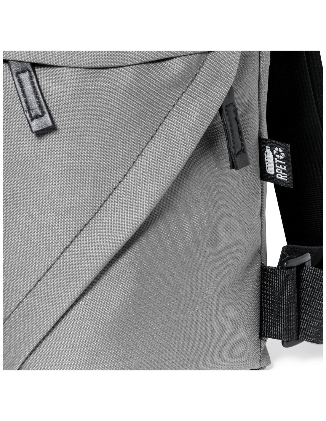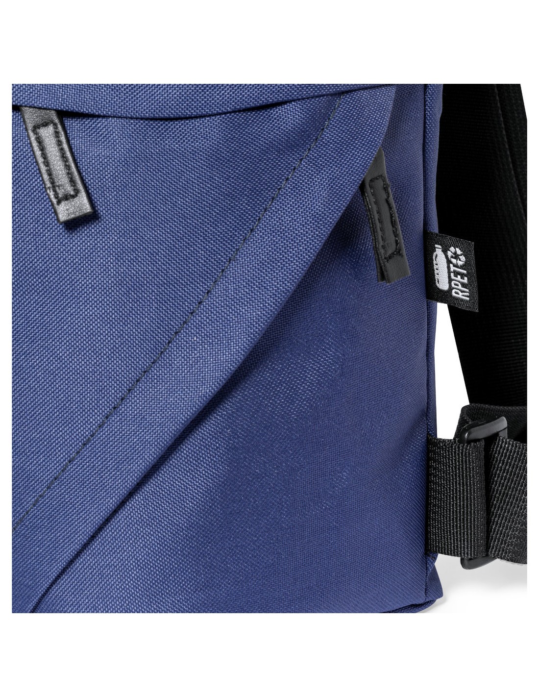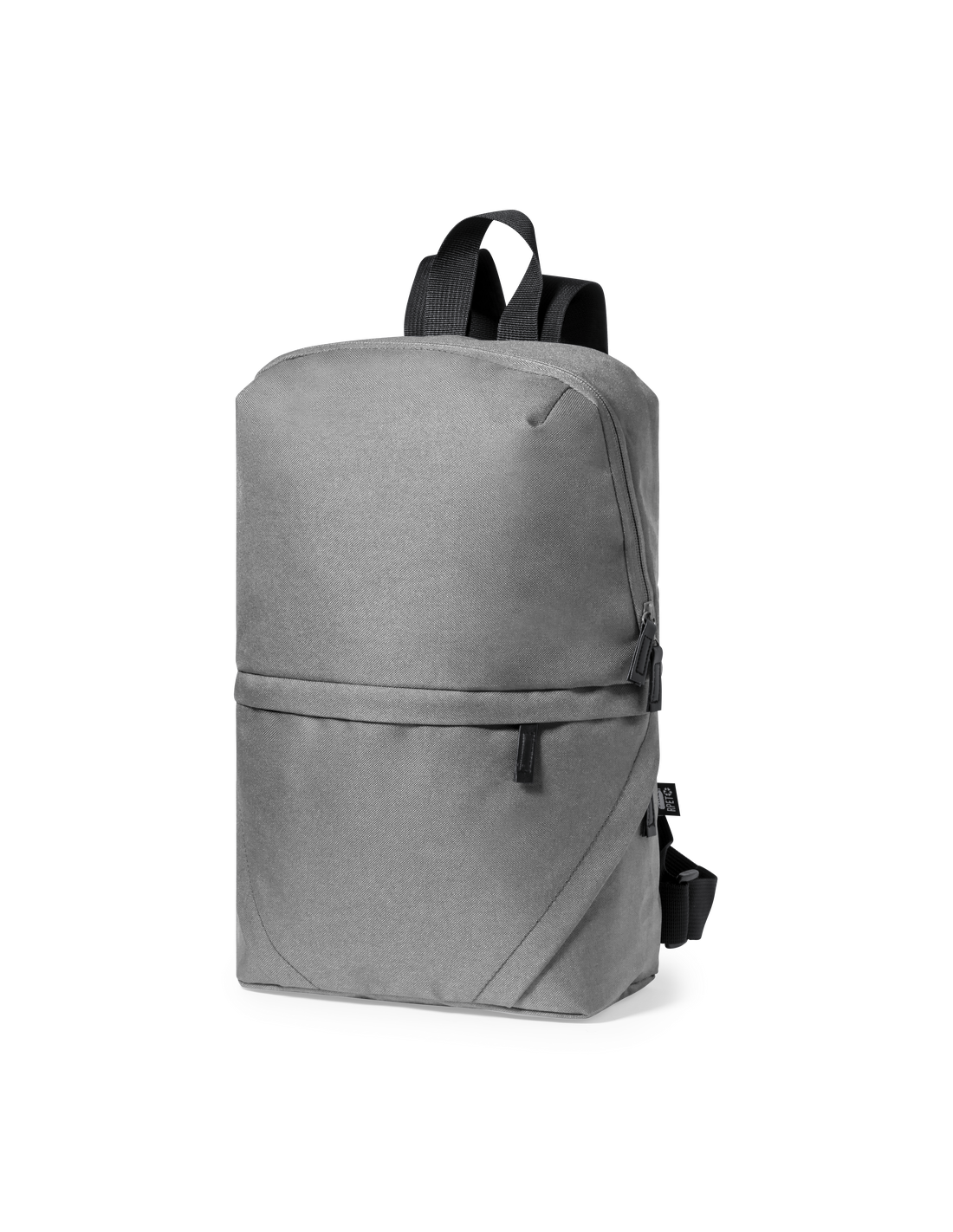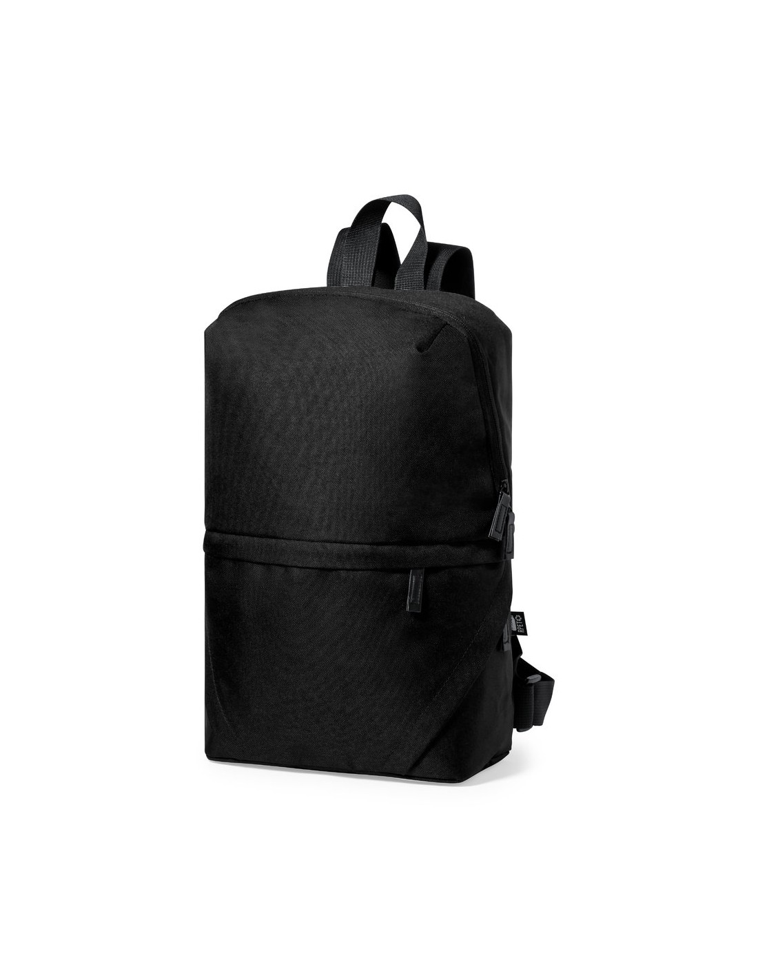 Mochila fabricada en resistente poliéster 600D RPET. Compartimento principal con cierre de cremallera invisible, doble bolsillo exterior y cintas para hombros ajustables. Disponible en variada gama de colores, con distintivo RPET en etiqueta exterior. El material RPET se elabora a partir de plástico reciclado, para así fomentar la reutilización de residuos plásticos y ayudar a la sostenibilidad del planeta.