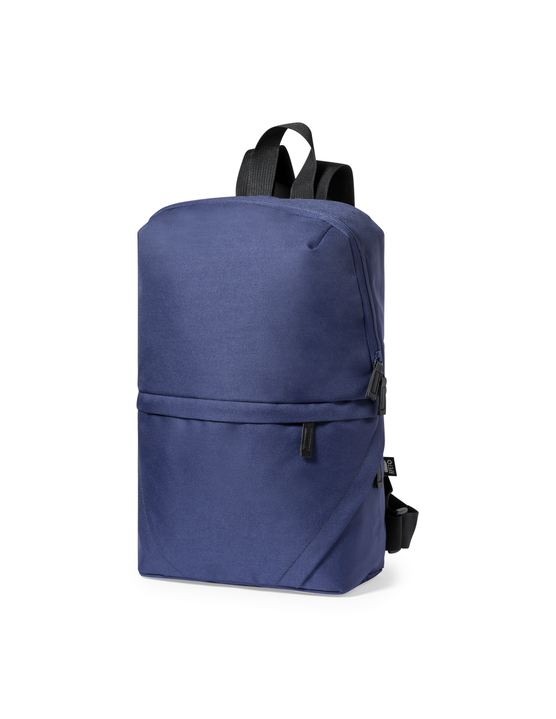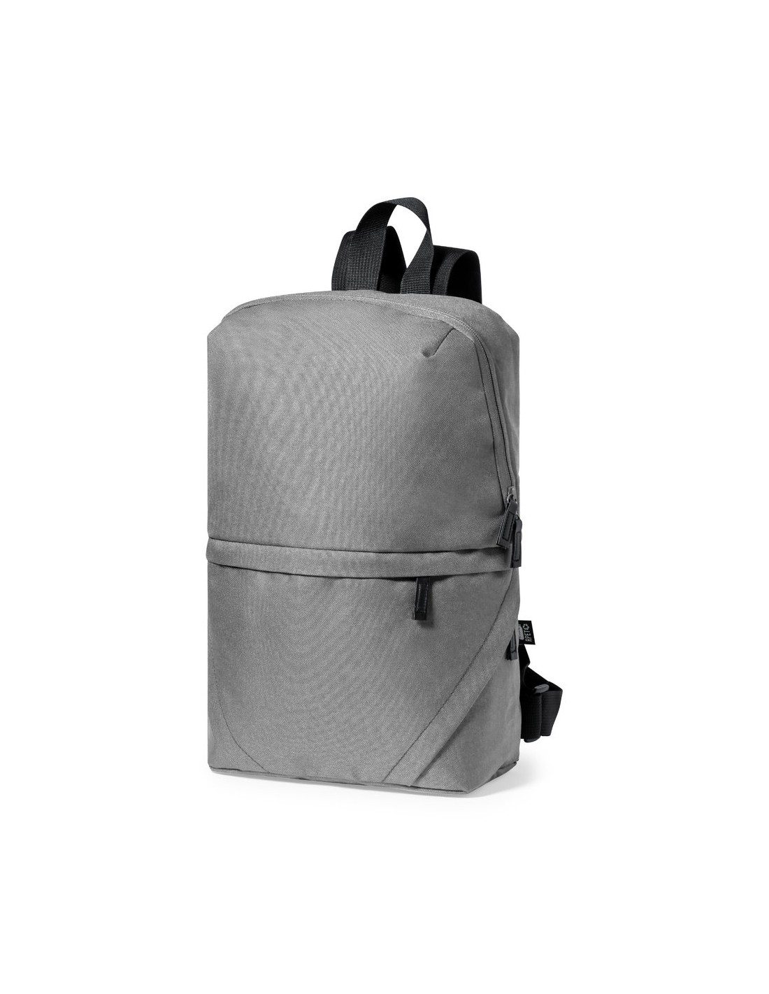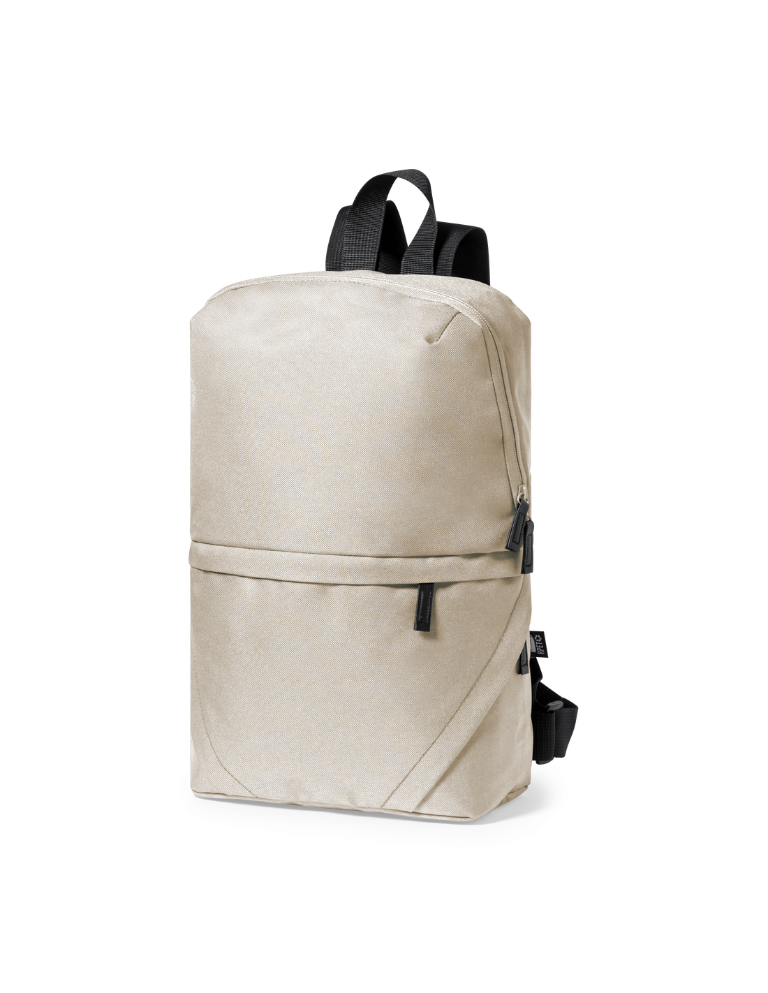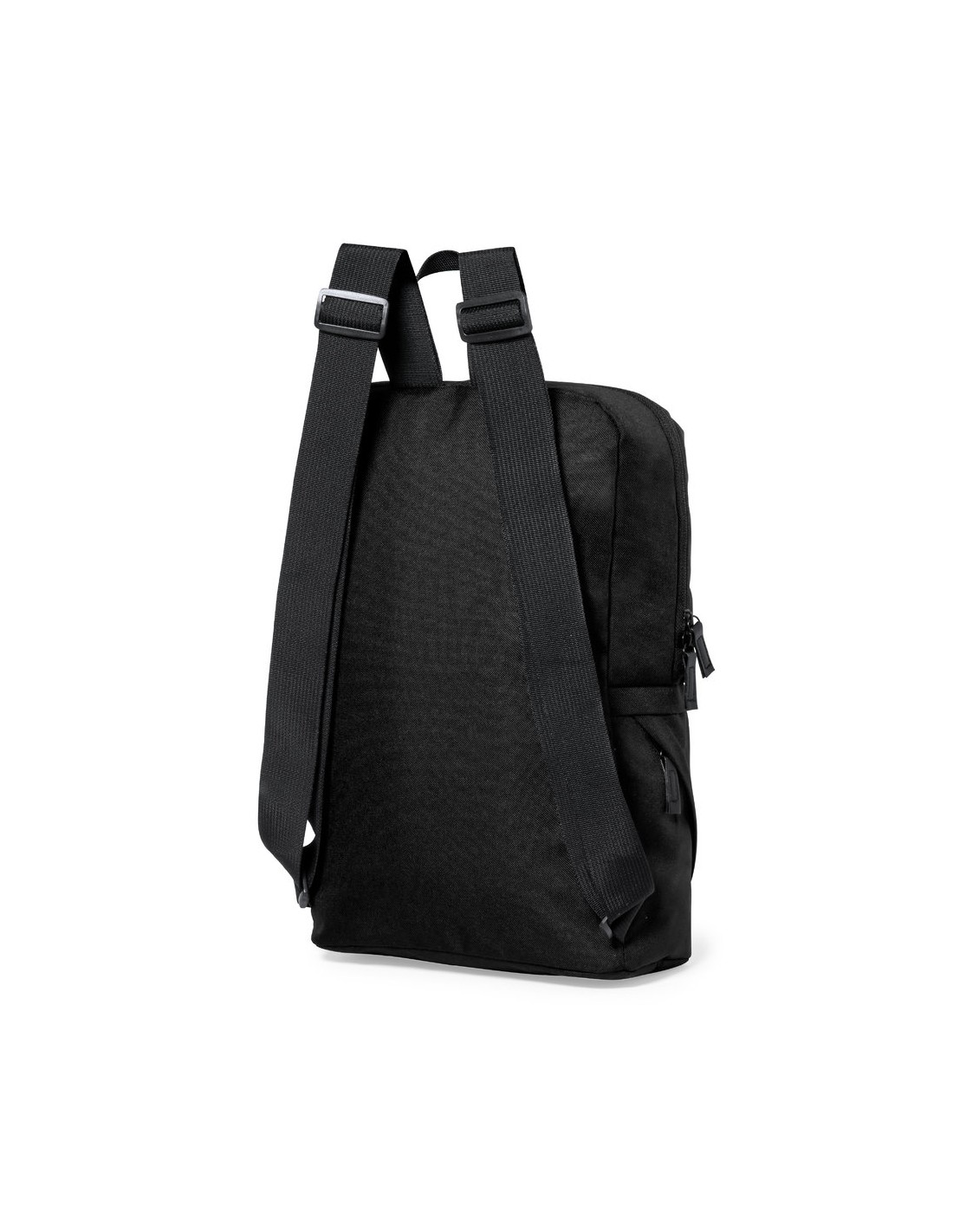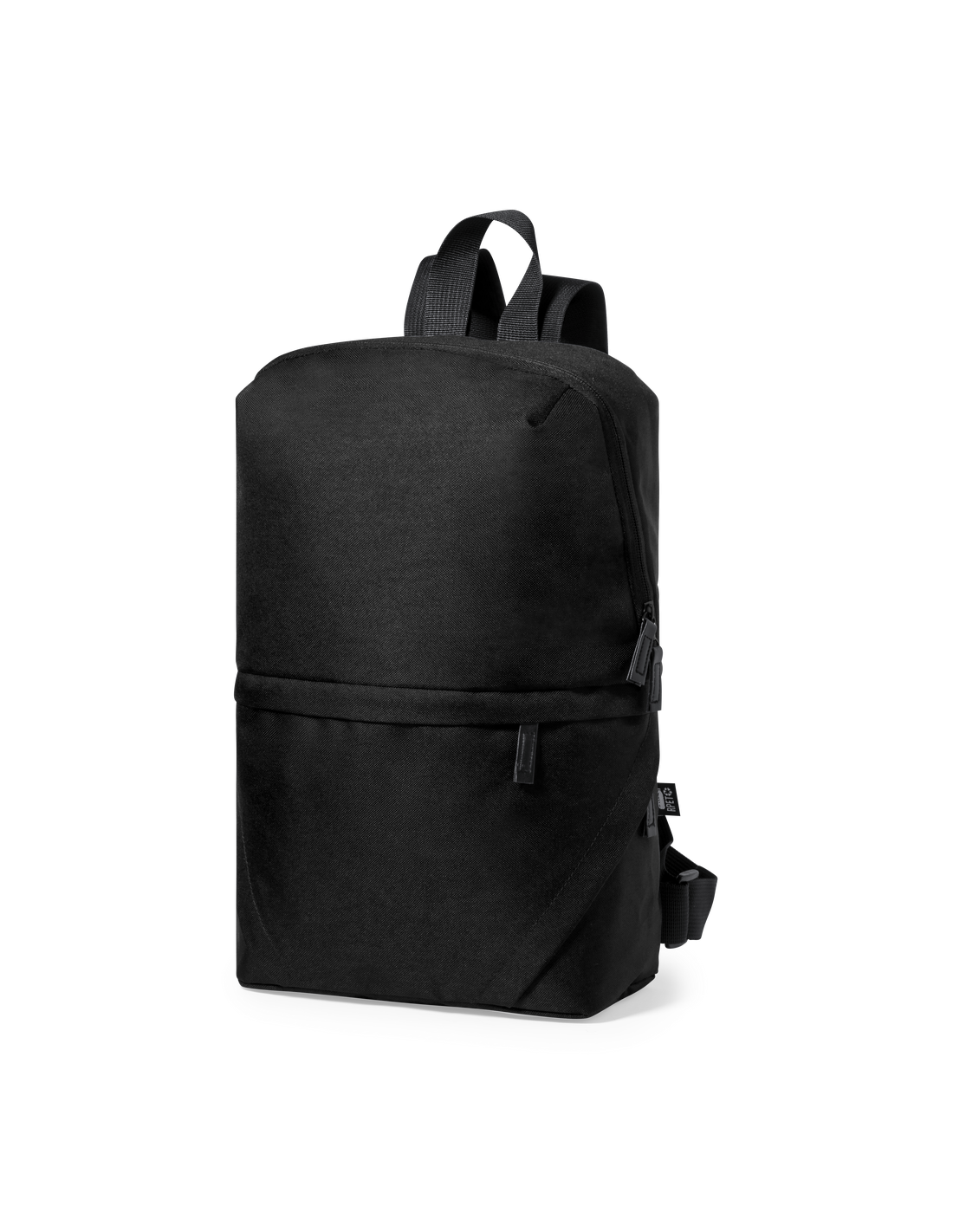 Mochila fabricada en resistente poliéster 600D RPET. Compartimento principal con cierre de cremallera invisible, doble bolsillo exterior y cintas para hombros ajustables. Disponible en variada gama de colores, con distintivo RPET en etiqueta exterior. El material RPET se elabora a partir de plástico reciclado, para así fomentar la reutilización de residuos plásticos y ayudar a la sostenibilidad del planeta.