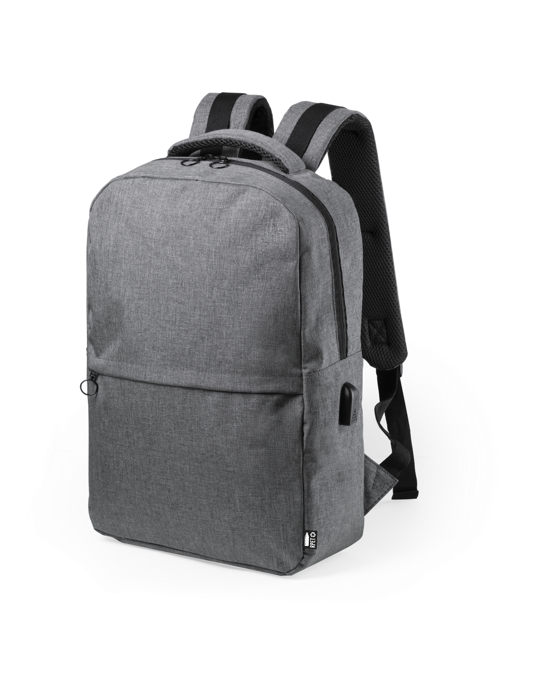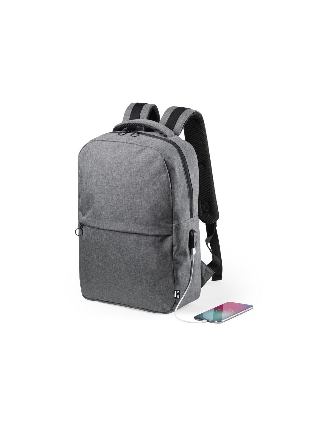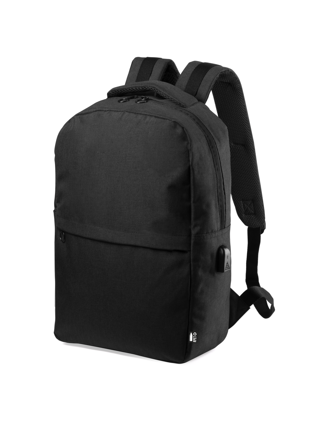 Mochila de negocios en resistente 600D RPET, elaborado a partir de plástico reciclado, para así fomentar la reutilización de residuos plásticos y ayudar a la sostenibilidad del planeta. Con cierre de cremallera de doble tirador y bolsillo en frontal. Interior con bolsillos acolchados para tablet de hasta 10 pulgadas y ordenador portátil de hasta 15 pulgadas, con estación de carga USB (cable incluido, batería auxiliar no incluida). Esquinas reforzadas, asa de transporte acolchada y accesorios en color negro. Espalda y cintas de hombros acolchadas y ajustables. Distintivo RPET en etiqueta.