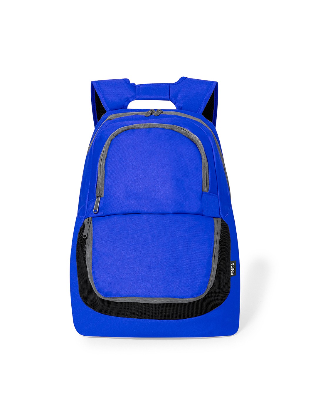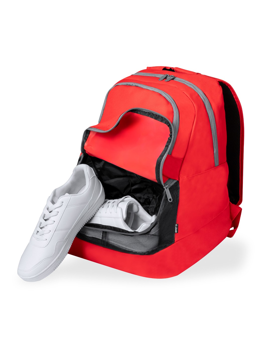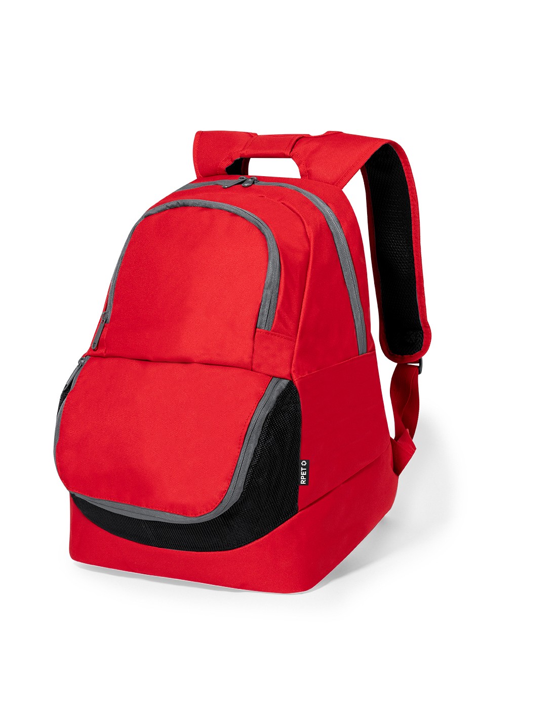 Práctica mochila confeccionada en poliéster 600D RPET. Cuenta con asas acolchadas que facilitan su transporte, así como con tres bolsillos distintos para una organización óptima: un bolsillo principal de gran capacidad, con cierre de doble cremallera; un bolsillo frontal de acceso rápido con cierre de cremallera; y un bolsillo de cremallera con rejilla, ideal para el calzado o balones, proporcionando una buena transpiración. Disponible en una variada gama de colores, con cremalleras en color gris.El material RPET se elabora a partir de plástico reciclado, para así fomentar la reutilización de residuos plásticos y ayudar a la sostenibilidad del planeta.