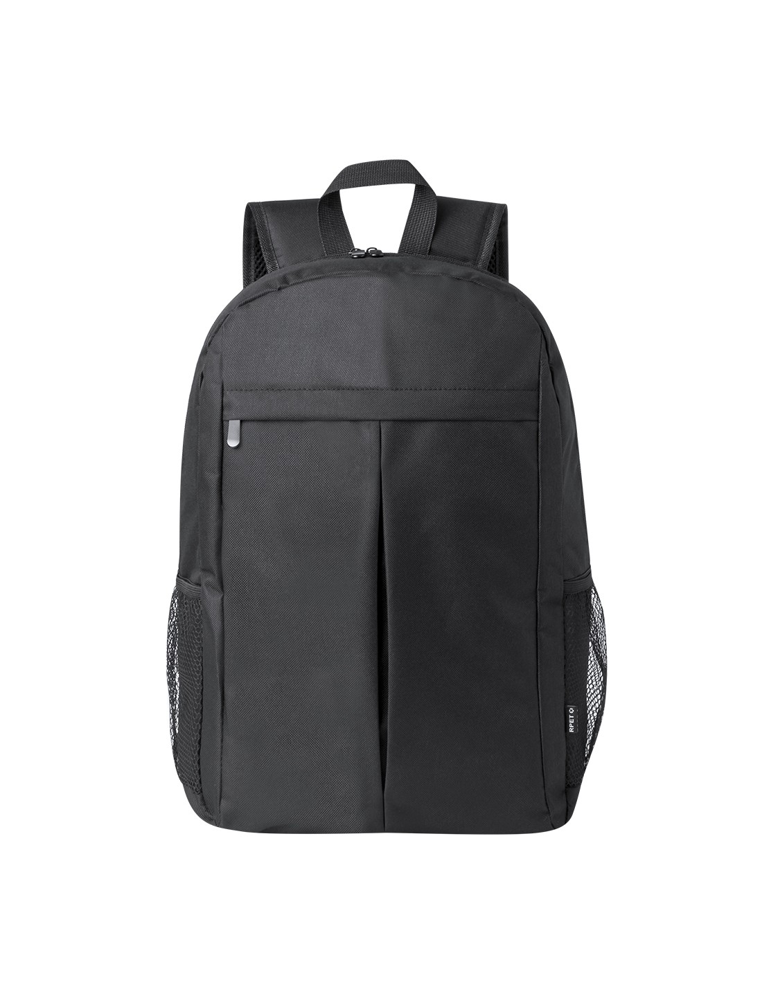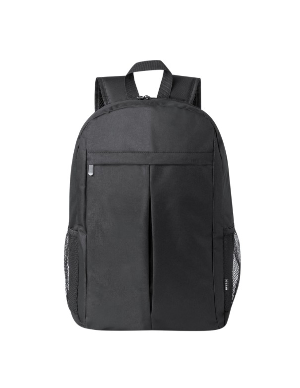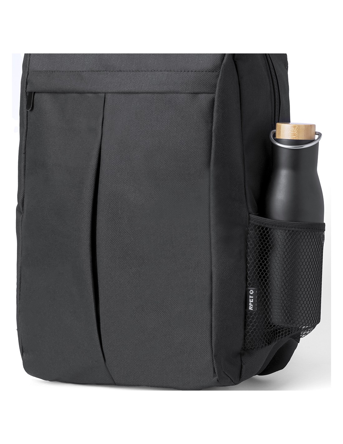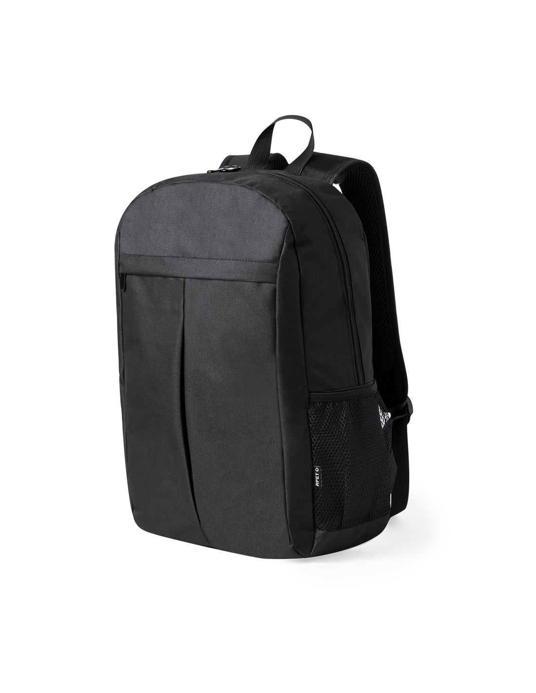 Mochila elaborada en resistente 600D RPET. Provista de cierre de cremallera de doble tirador y un práctico bolsillo frontal. Su interior cuenta con compartimentos acolchados diseñados para tablet de hasta 10 pulgadas y portátil de hasta 15 pulgadas. La espalda y las cintas de hombros están acolchadas y son ajustables, incorporando un tejido especial transpirable. Además, presenta una cinta superior y bolsillos laterales de rejilla. Logotipo RPET en etiqueta. Presentada en una bolsa individual reciclada. El material RPET se elabora a partir de plástico reciclado, para así fomentar la reutilización de residuos plásticos y ayudar a la sostenibilidad del planeta.