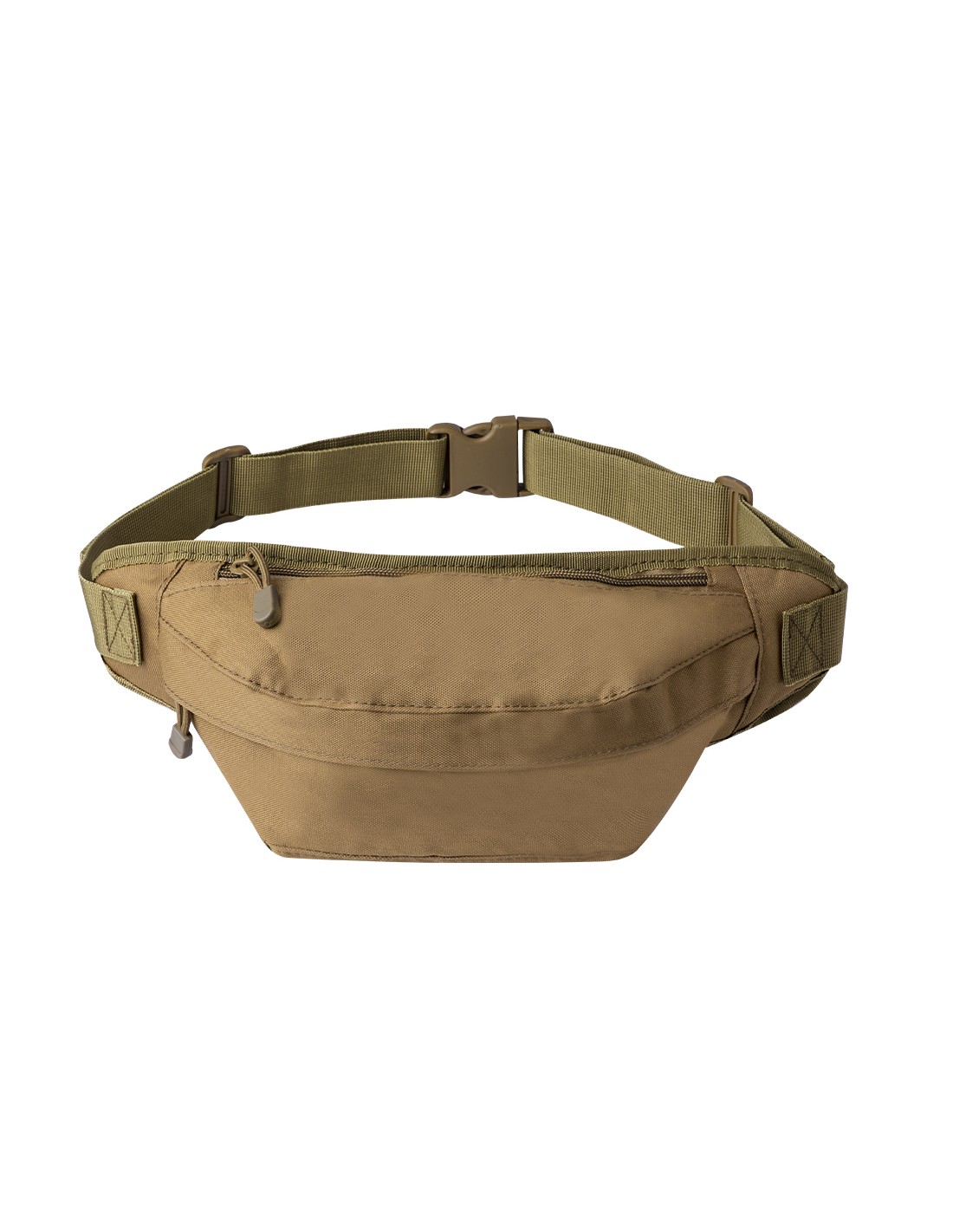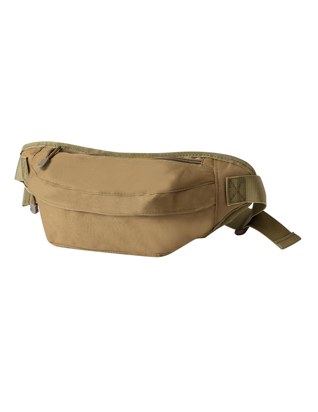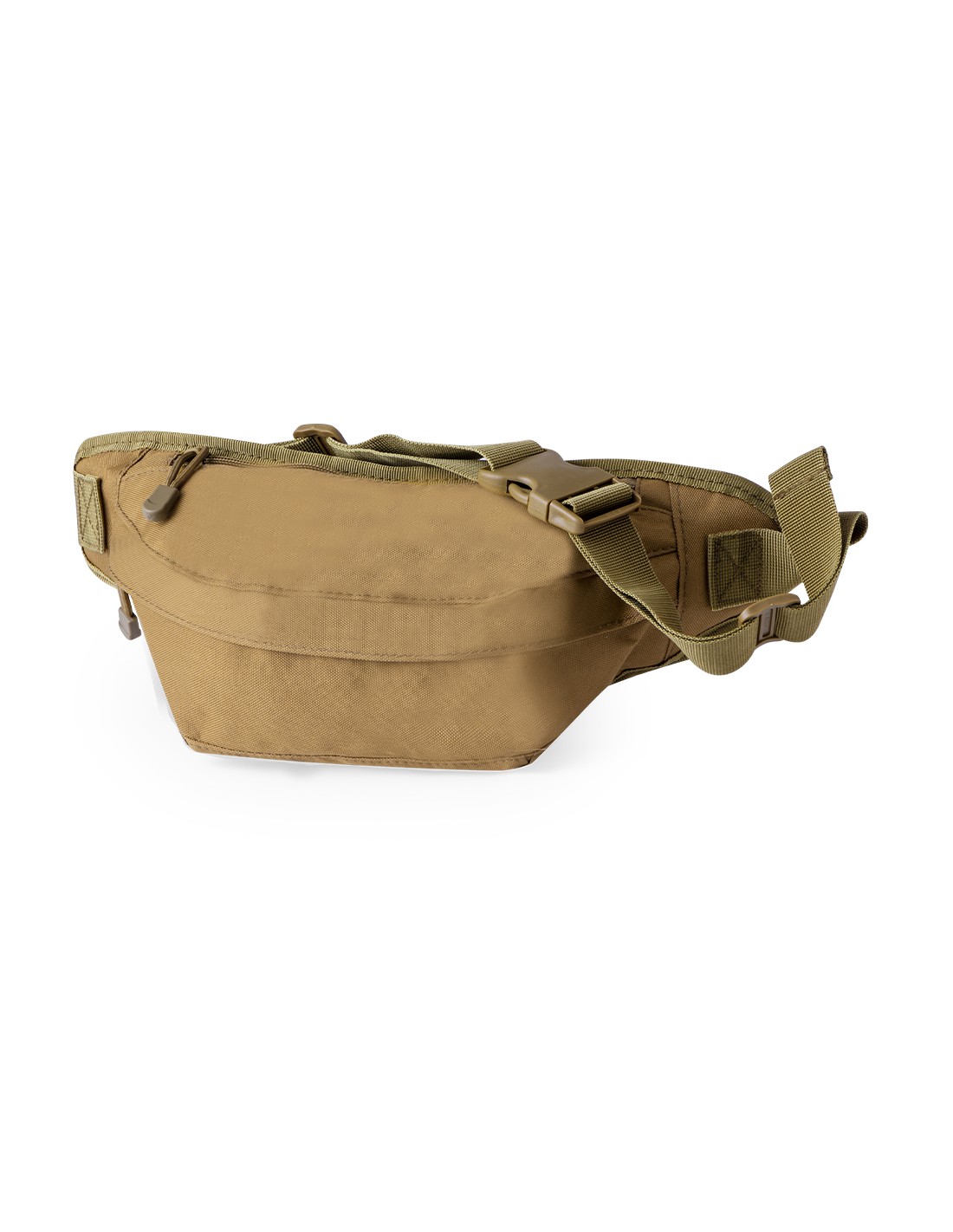 Riñonera en resistente poliéster 800D y tono marrón arena. Con 2 bolsillos de cierre de cremallera y cintas en tiradores para una cómoda apertura. Cinta ajustable con cierre de hebilla, presentada individualmente en bolsa reciclada.