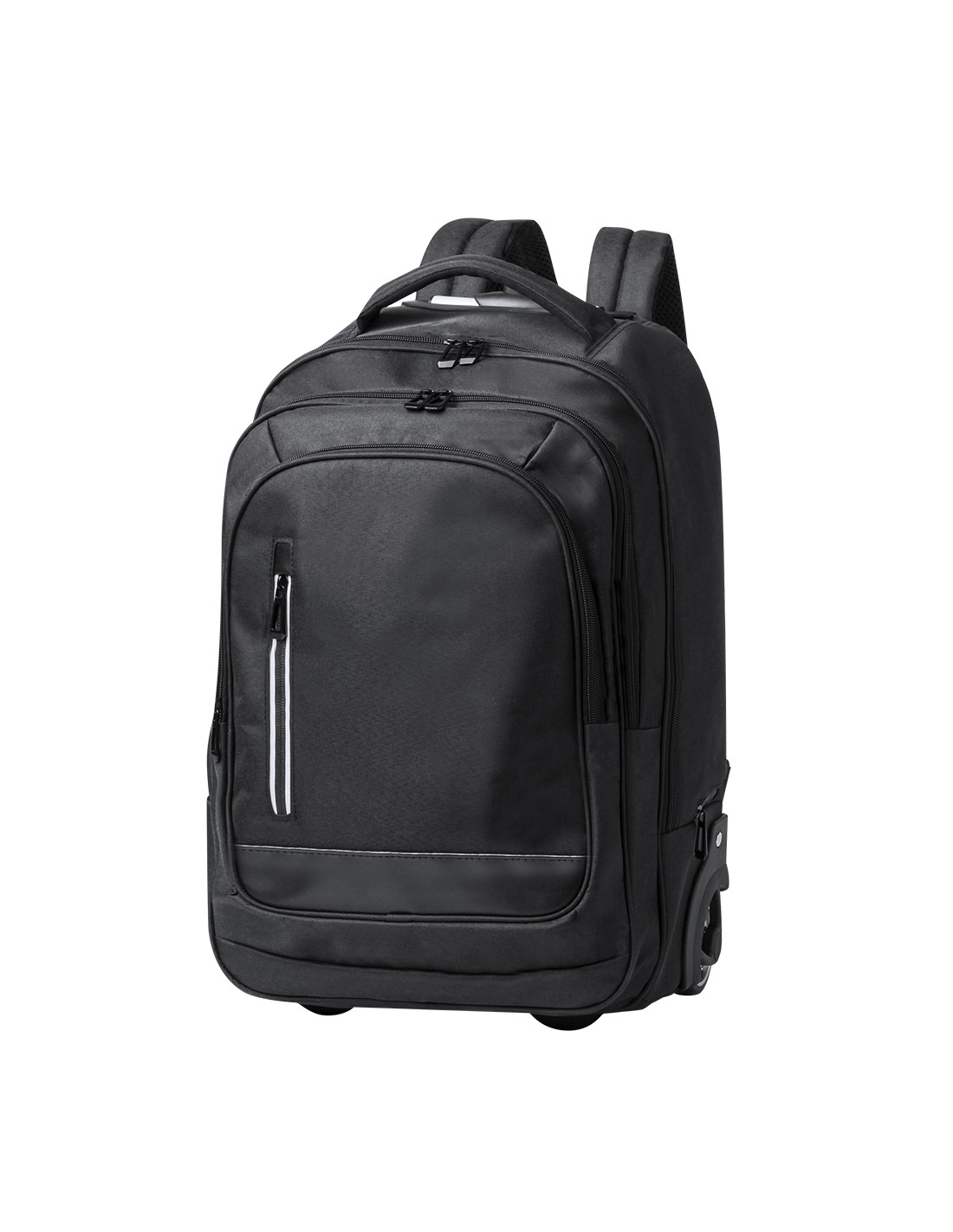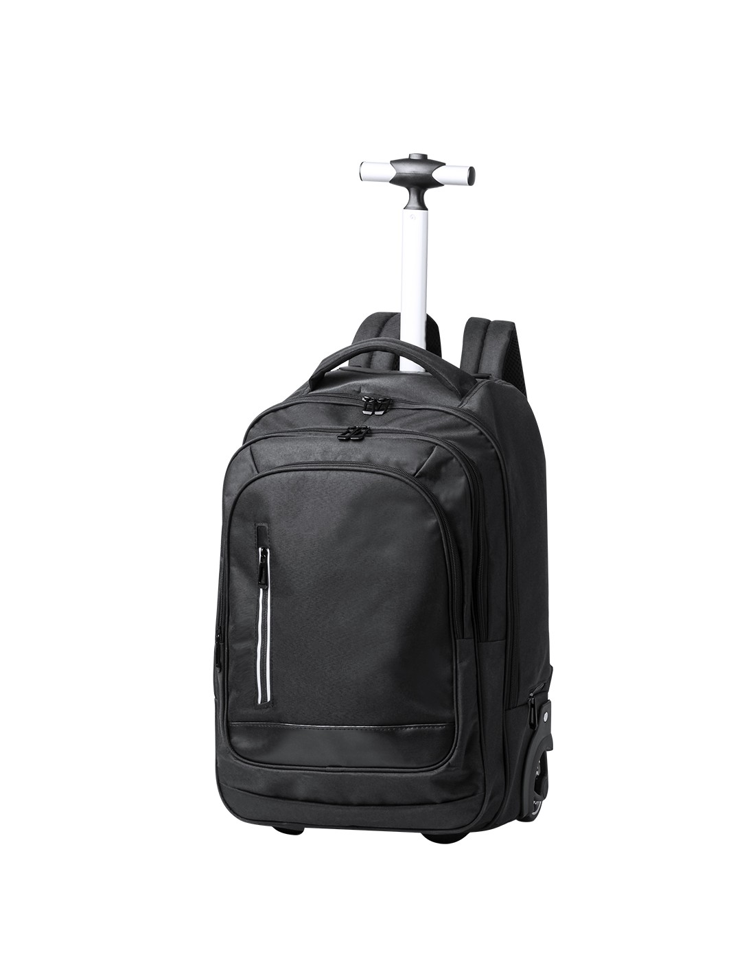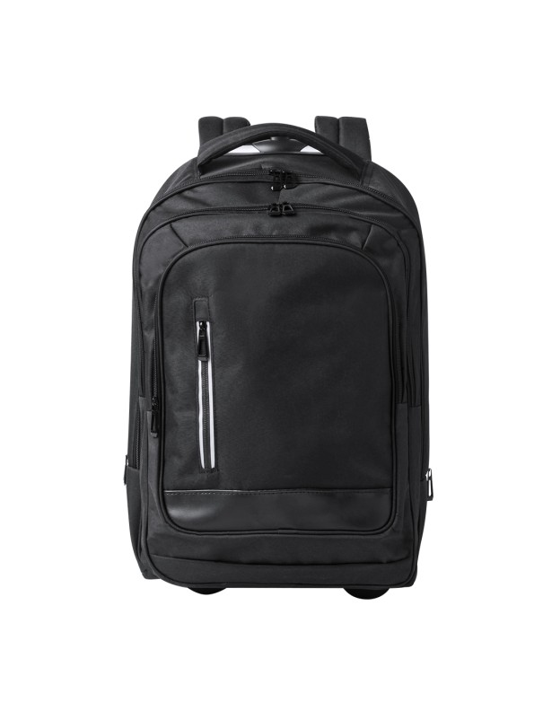 Mochila trolley de 2 ruedas en poliéster 300D de alta calidad. Incluye compartimento interior acolchado para ordenador portátil de hasta 15 pulgadas. Con asa exterior reforzada a juego y prácticos bolsillos en parte frontal. Con cremalleras a juego, además incluye cintas para hombro acolchadas y ocultas en parte posterior para usar como mochila. Presentado en bolsa individual reciclada.