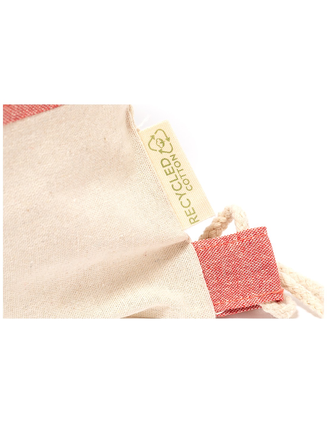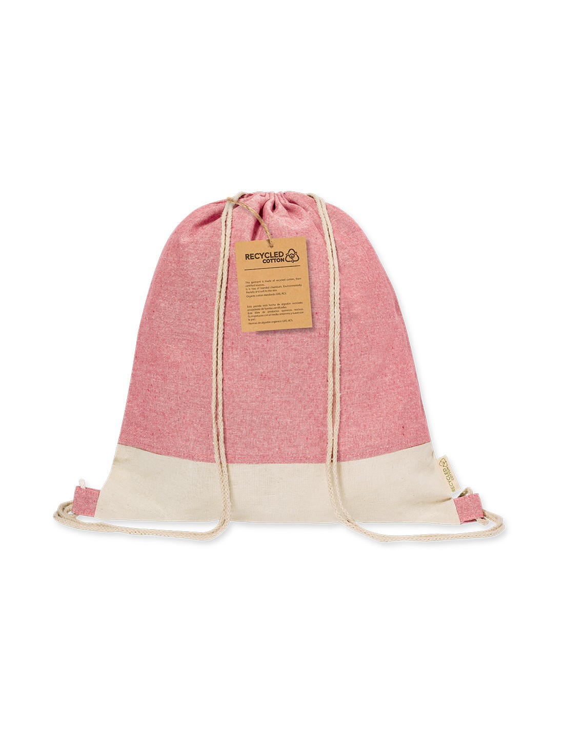 Mochila de cuerdas confeccionada en material 100% algodón reciclado de 120 g/m2. Las cuerdas de autocierre también están fabricadas en algodón con argollas de tela. La base presenta un color natural a juego con las cuerdas, con el logotipo eco visible en la etiqueta lateral. Disponible en una variada gama de colores nature. Resistencia hasta 6kg de peso.