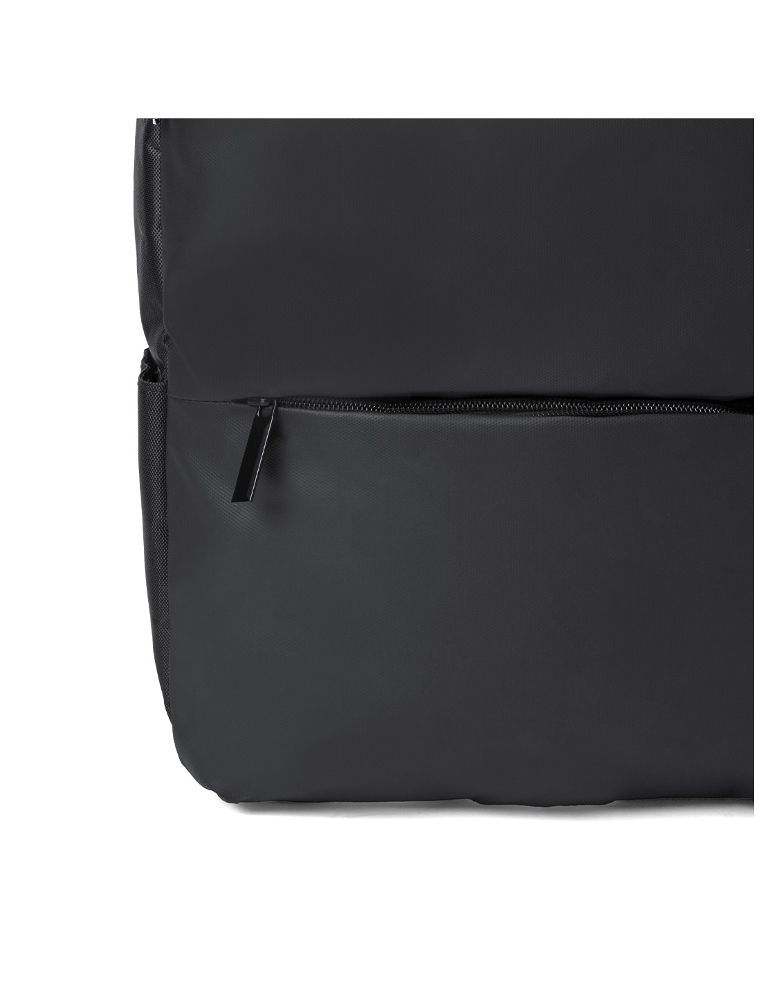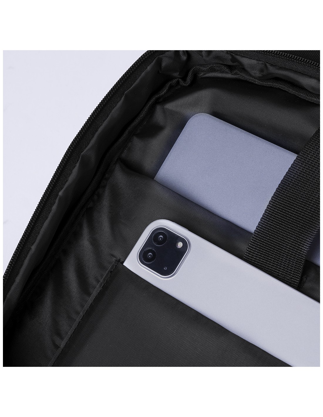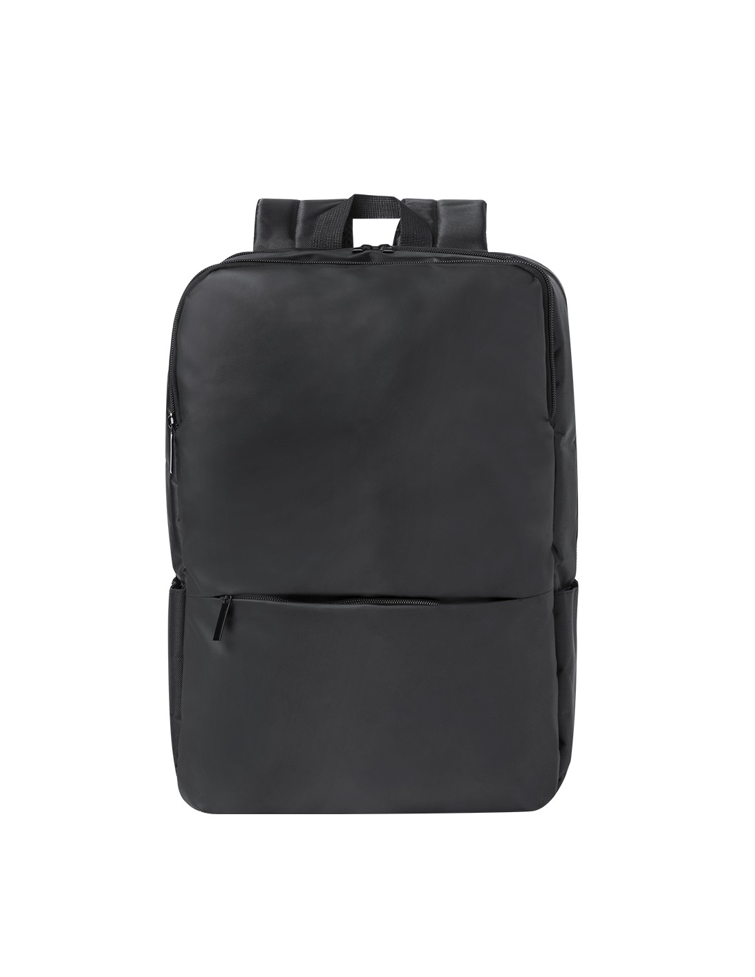 Mochila confeccionada en elegante polipiel De diseño urbano, que incorpora un bolsillo principal acolchado con doble cierre para tablet de hasta 10 pulgadas y portátil de hasta 15 pulgadas, así como un bolsillo segundario y un bolsillo frontal con cremallera. Las cintas de hombros y la espalda son acolchadas, ajustables y cuentan con una tela transpirable para disipar el calor. Además, incluye un accesorio para ajustarse al trolley y una práctica asa en la parte superior. Presentada en una bolsa individual reciclada.