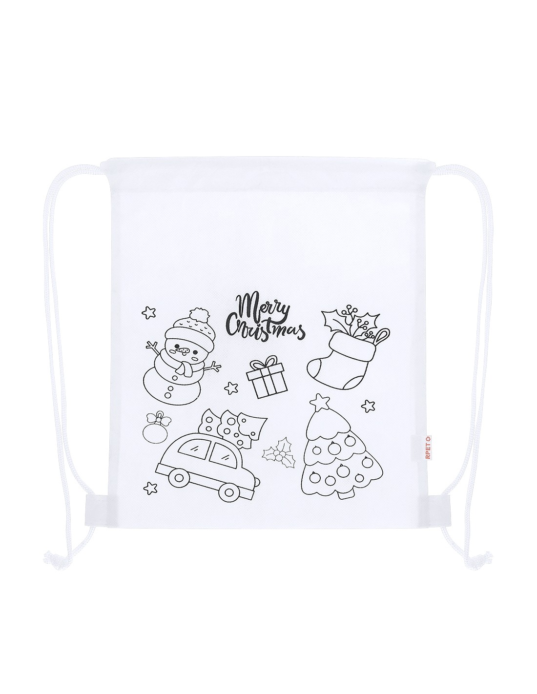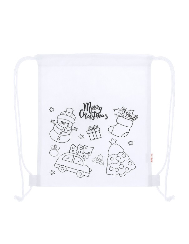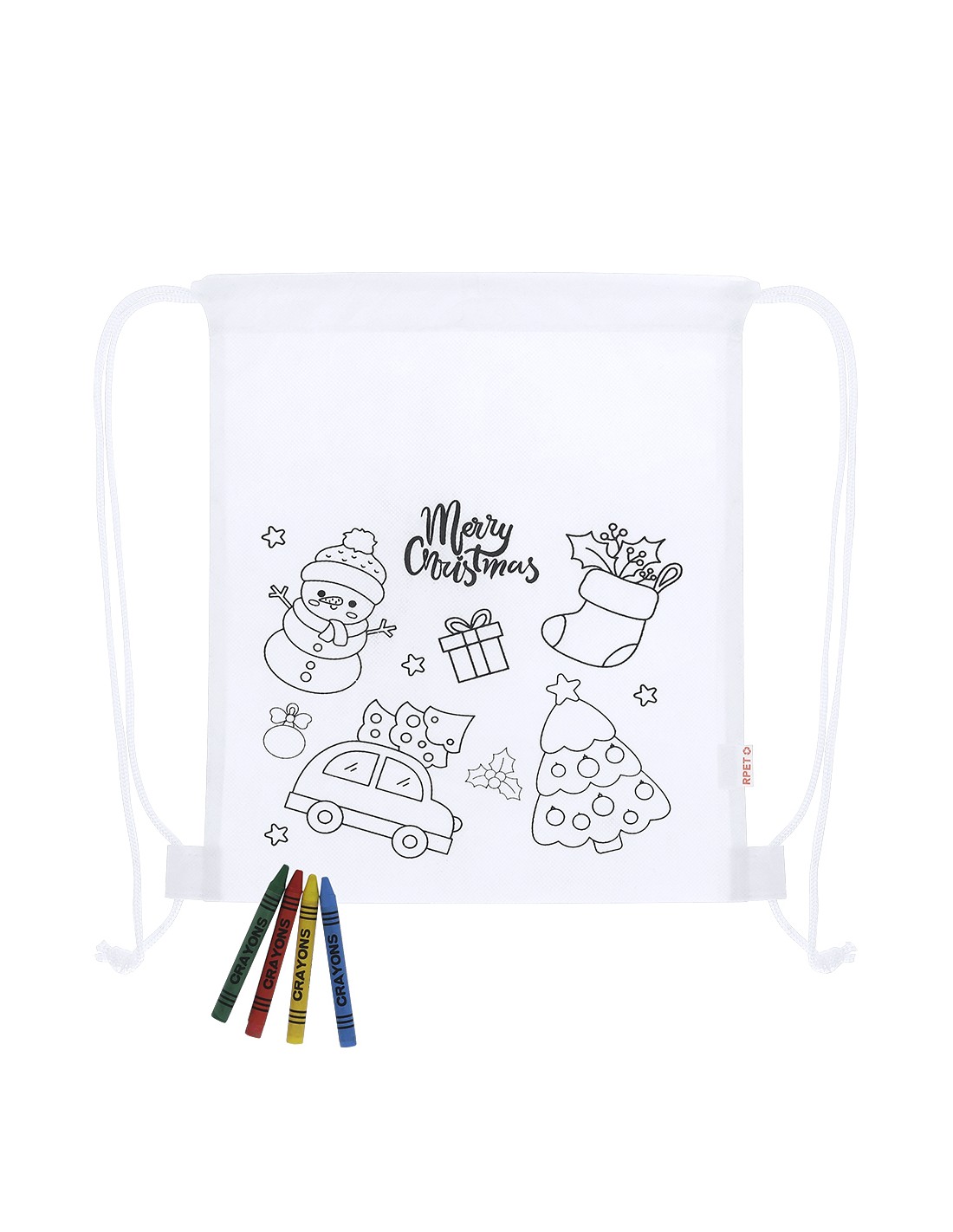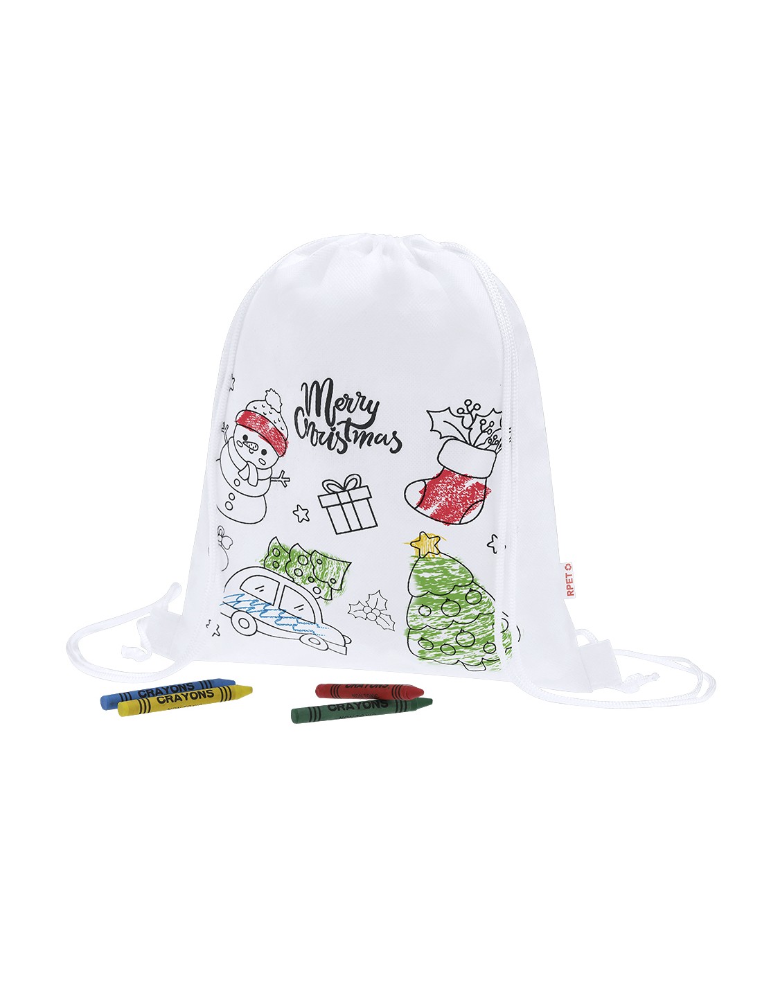Mochila infantil con motivos navideños fabricada en non-woven RPET. Especialmente diseñada para colorear con ceras. Con 4 ceras en variados colores. Cuenta con cuerdas de autocierre y sujeciones de tela. Incluye distintivo RPET en etiqueta.El material RPET se elabora a partir de plástico reciclado, para así fomentar la reutilización de residuos plásticos y ayudar a la sostenibilidad del planeta.