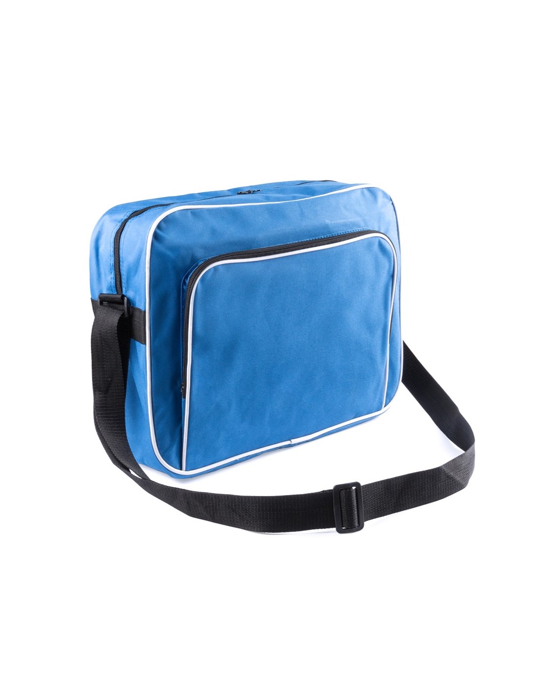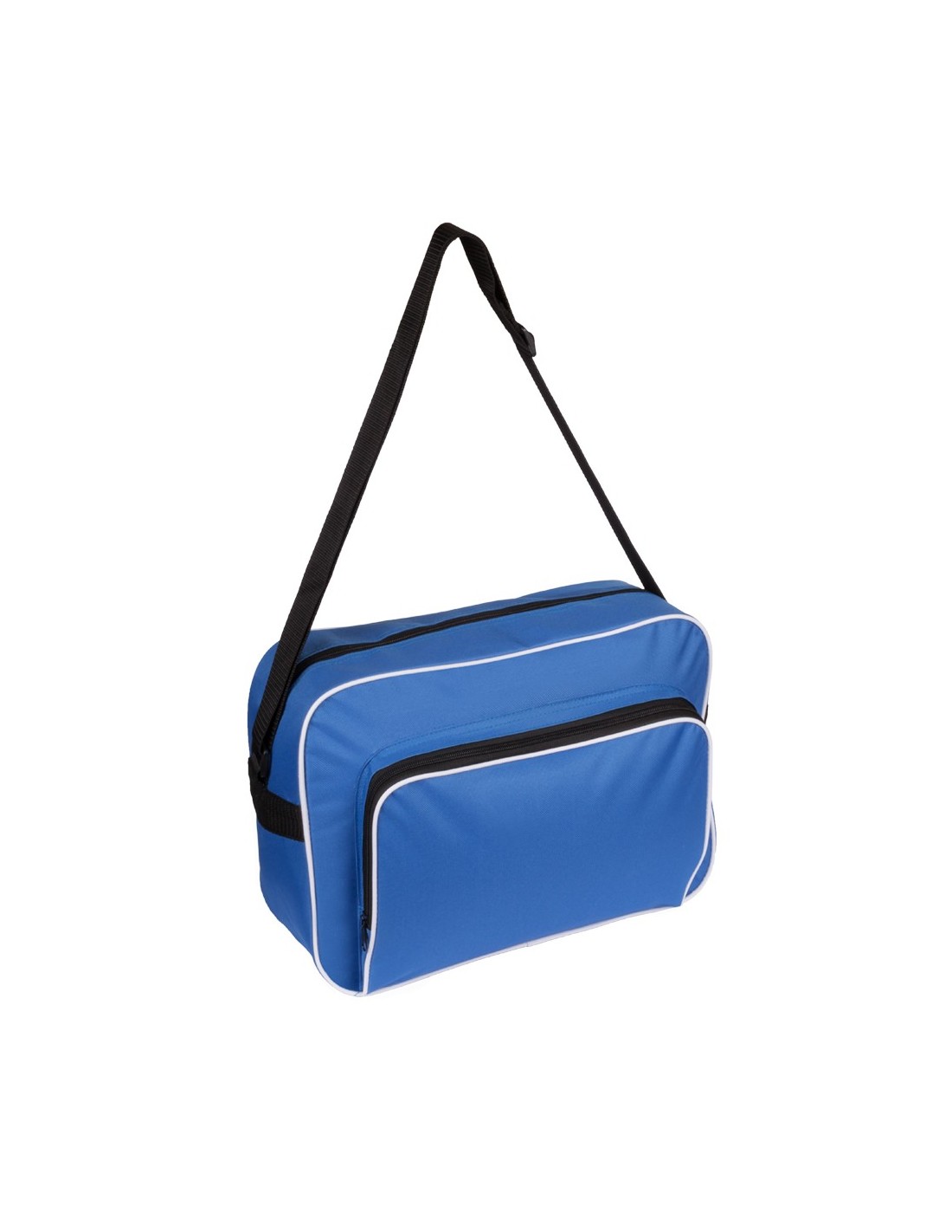 Bolso multiusos en resistente poliéster 600D de desenfadado diseño bicolor en amplia gama de colores, con ribetes de refuerzo en color blanco. Compartimento principal y bolsillo exterior con cierre de cremallera en color negro. Con resistente cinta bandolera ajustable en color negro. Base reforzada con superficie antideslizante.