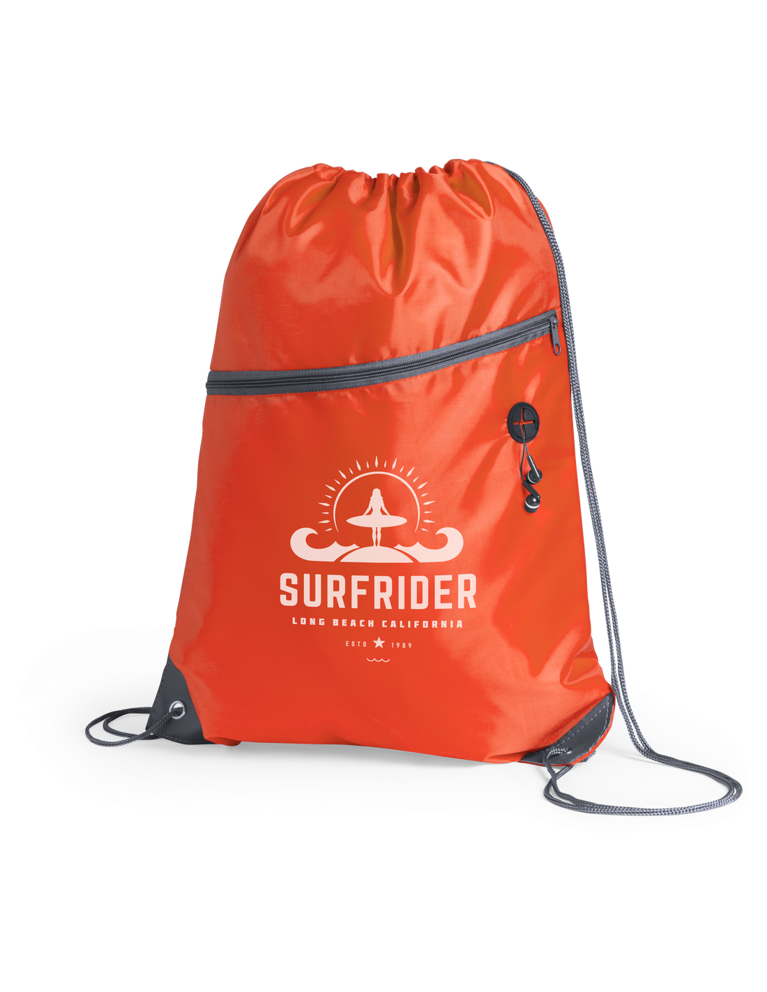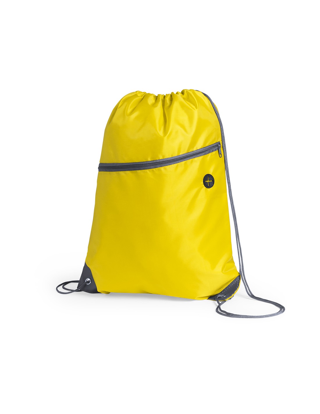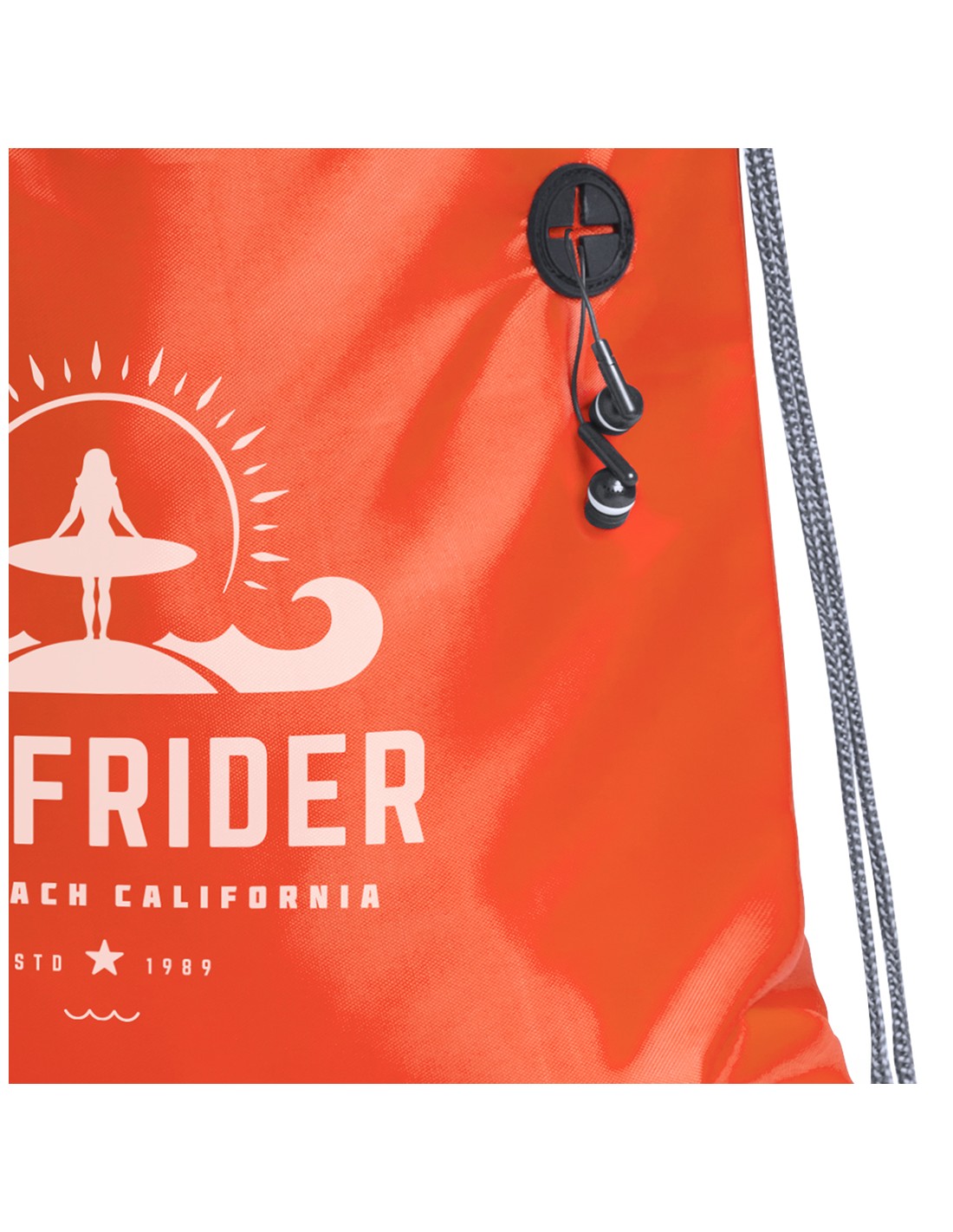 Mochila de cuerdas fabricada en suave poliéster 210D. Con bolsillo frontal de cremallera y salida de auriculares. Cuerdas de autocirre en color gris, a juego con cremallera y esquinas con argollas metálicas y refuerzo de polipiel. En variada gama de colores.