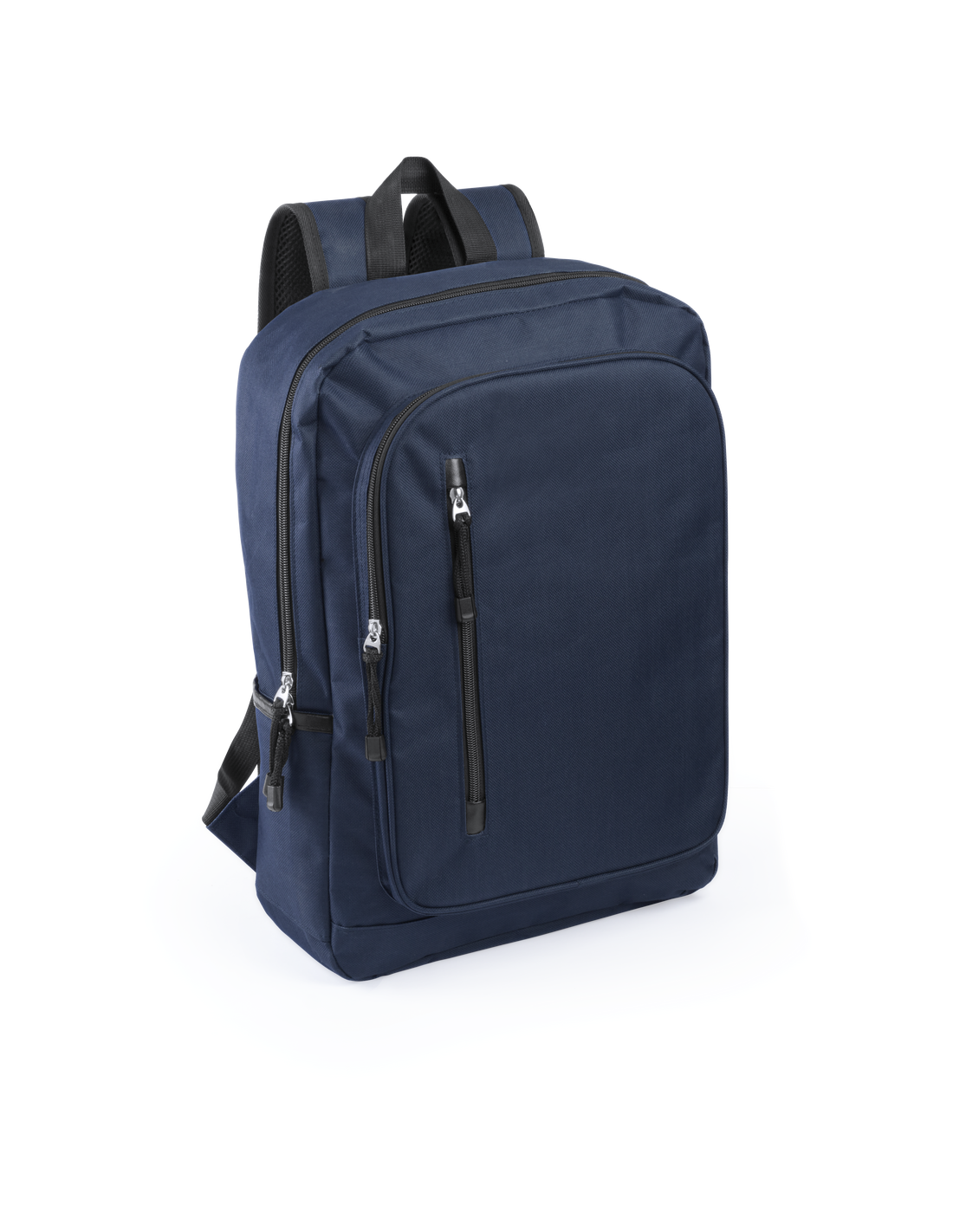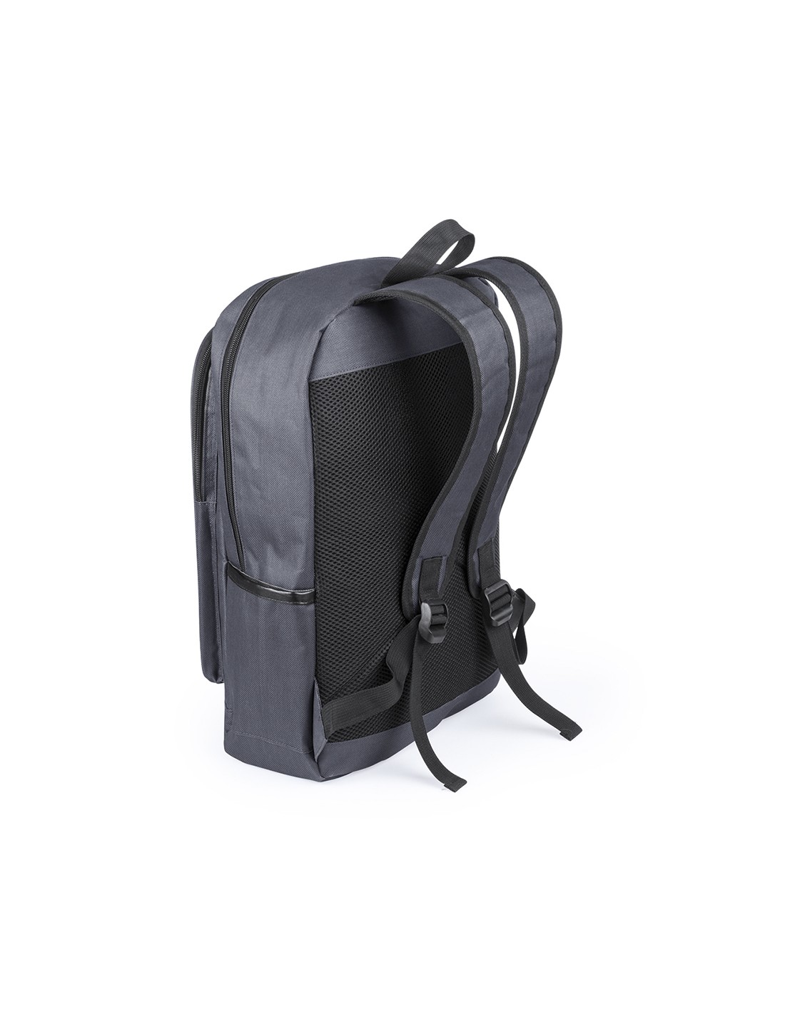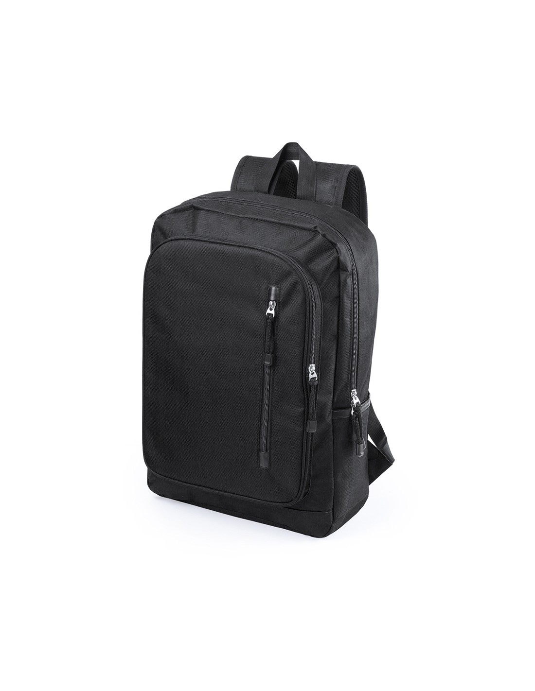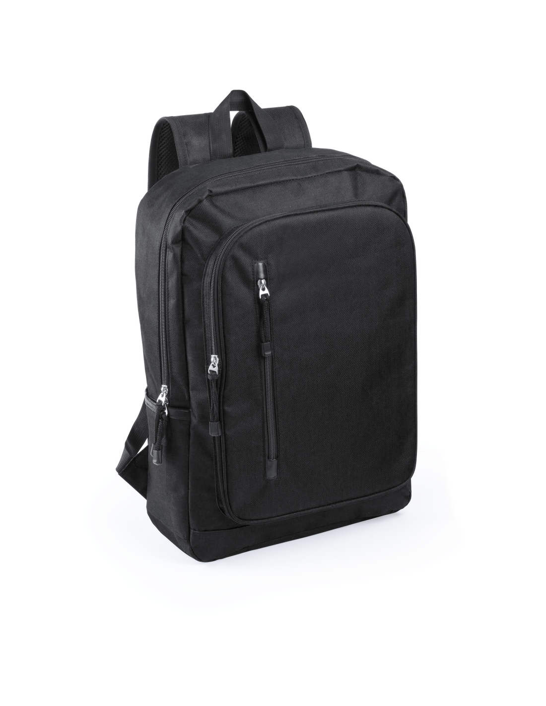 Resistente mochila de poliéster 600D con cierre de cremallera y bolsillos frontales. En sobrios colores, con espalda y cintas de hombros acolchadas, compartimento acolchado interior para portátil de hasta 15 pulgadas y cintas en tiradores para fácil apertura.