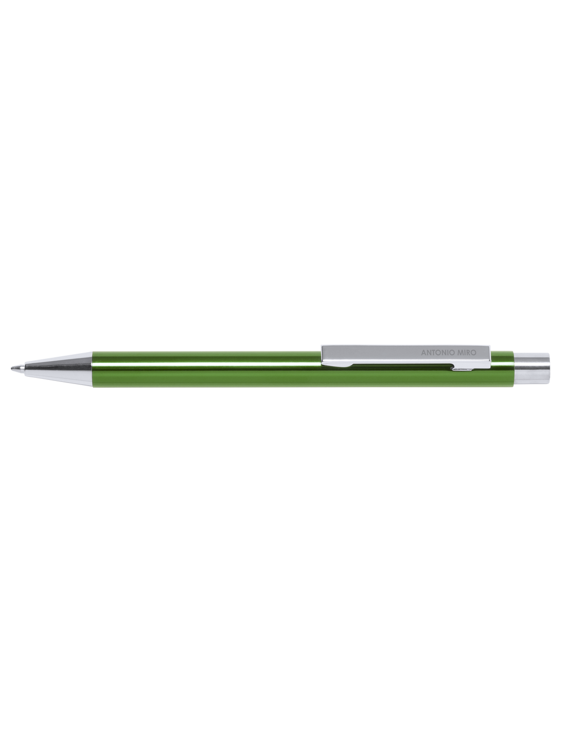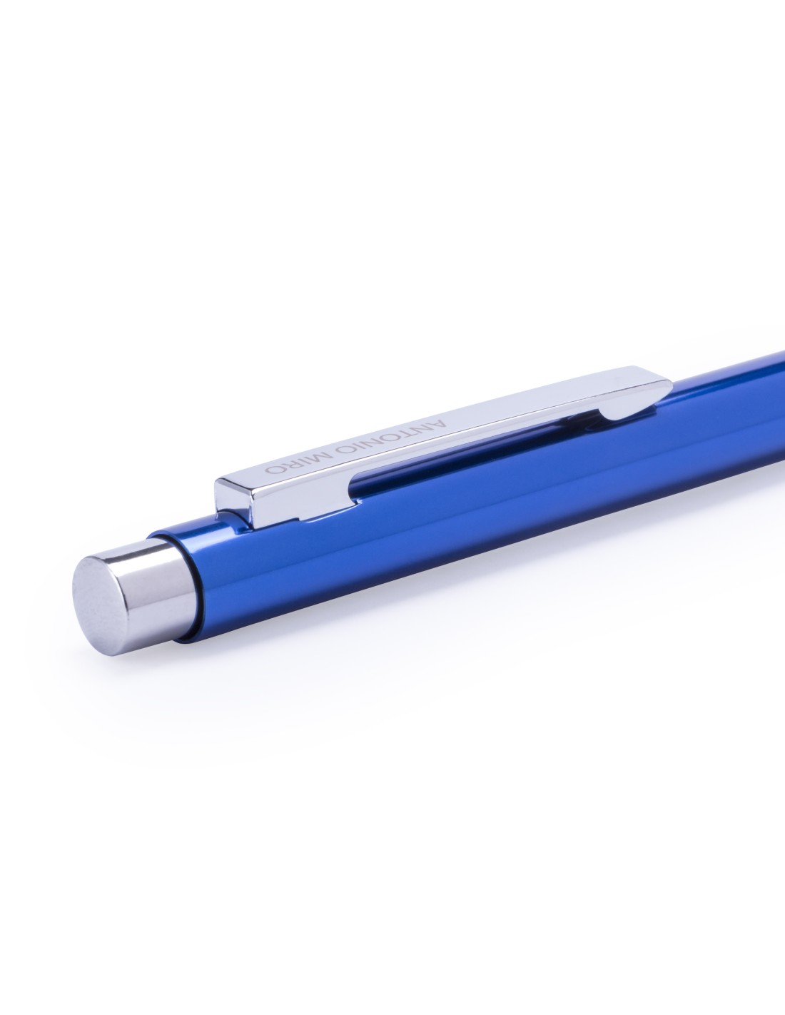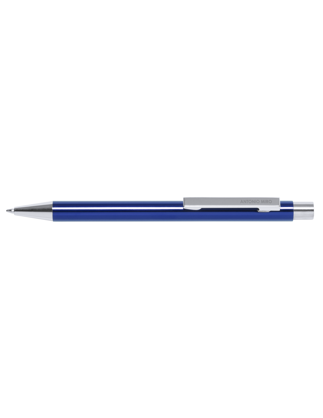 Bolígrafo de Antonio Miró con cuerpo en aluminio de variada gama de vivos colores y en color plateado. De mecanismo pulsador y presentado en bolsita don logotipo de la marca. Tinta azul.