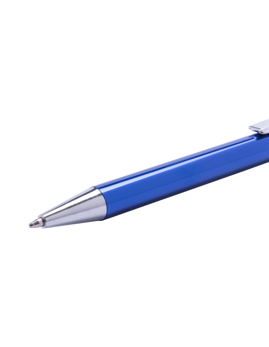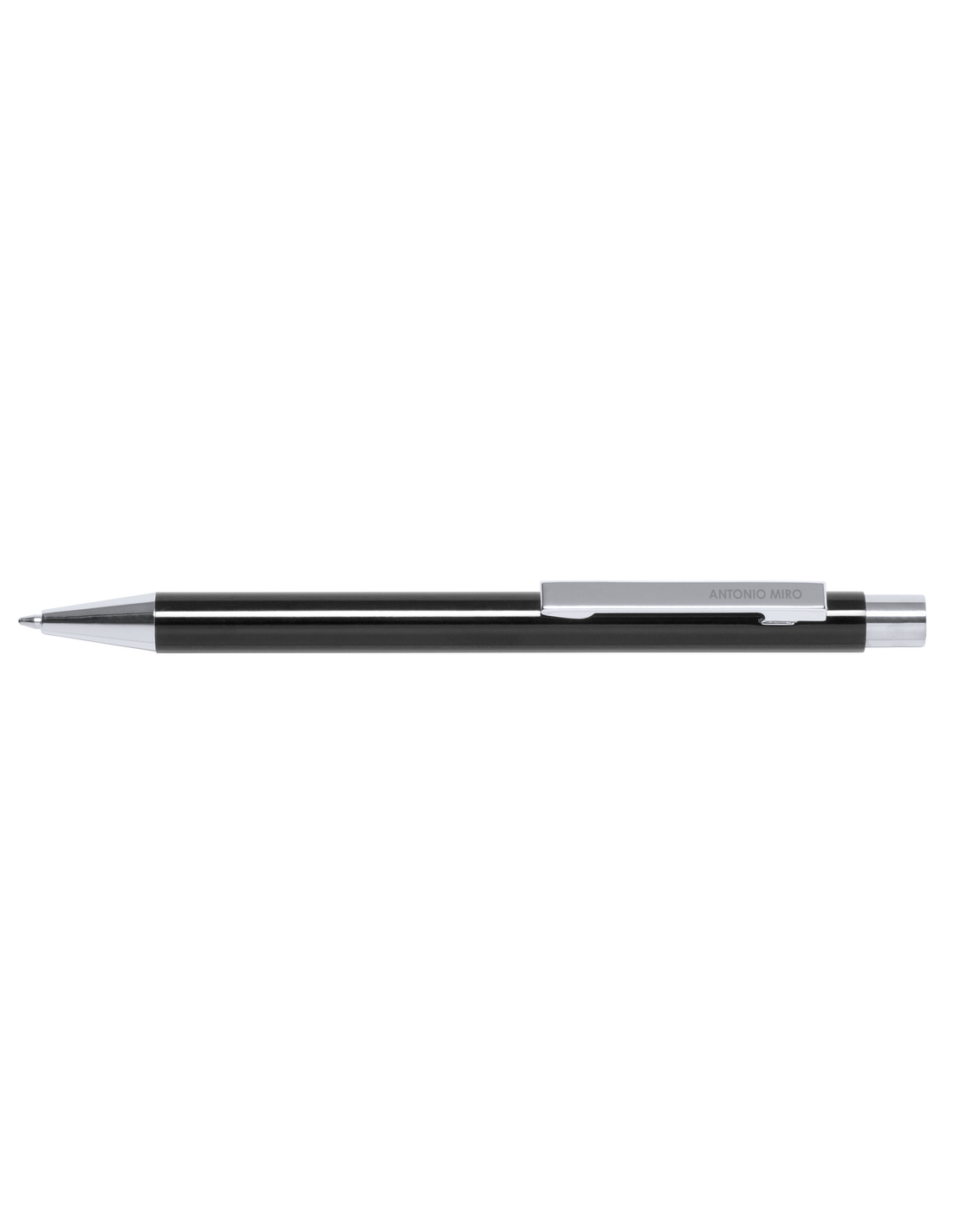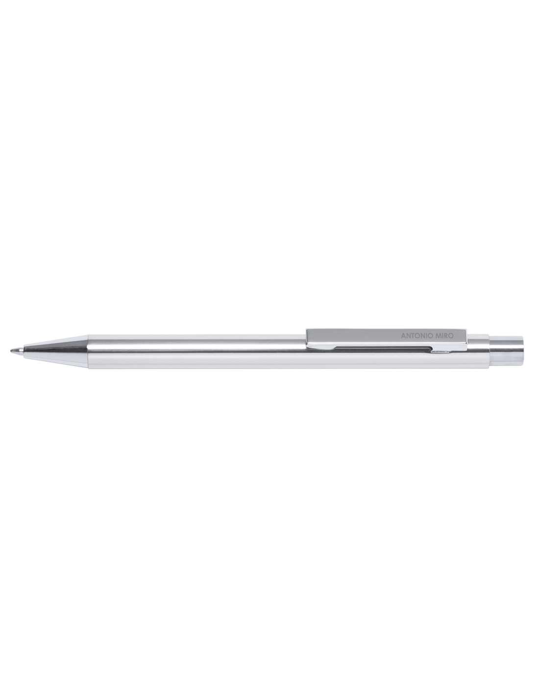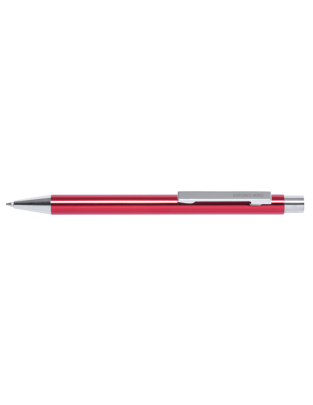 Bolígrafo de Antonio Miró con cuerpo en aluminio de variada gama de vivos colores y en color plateado. De mecanismo pulsador y presentado en bolsita don logotipo de la marca. Tinta azul.