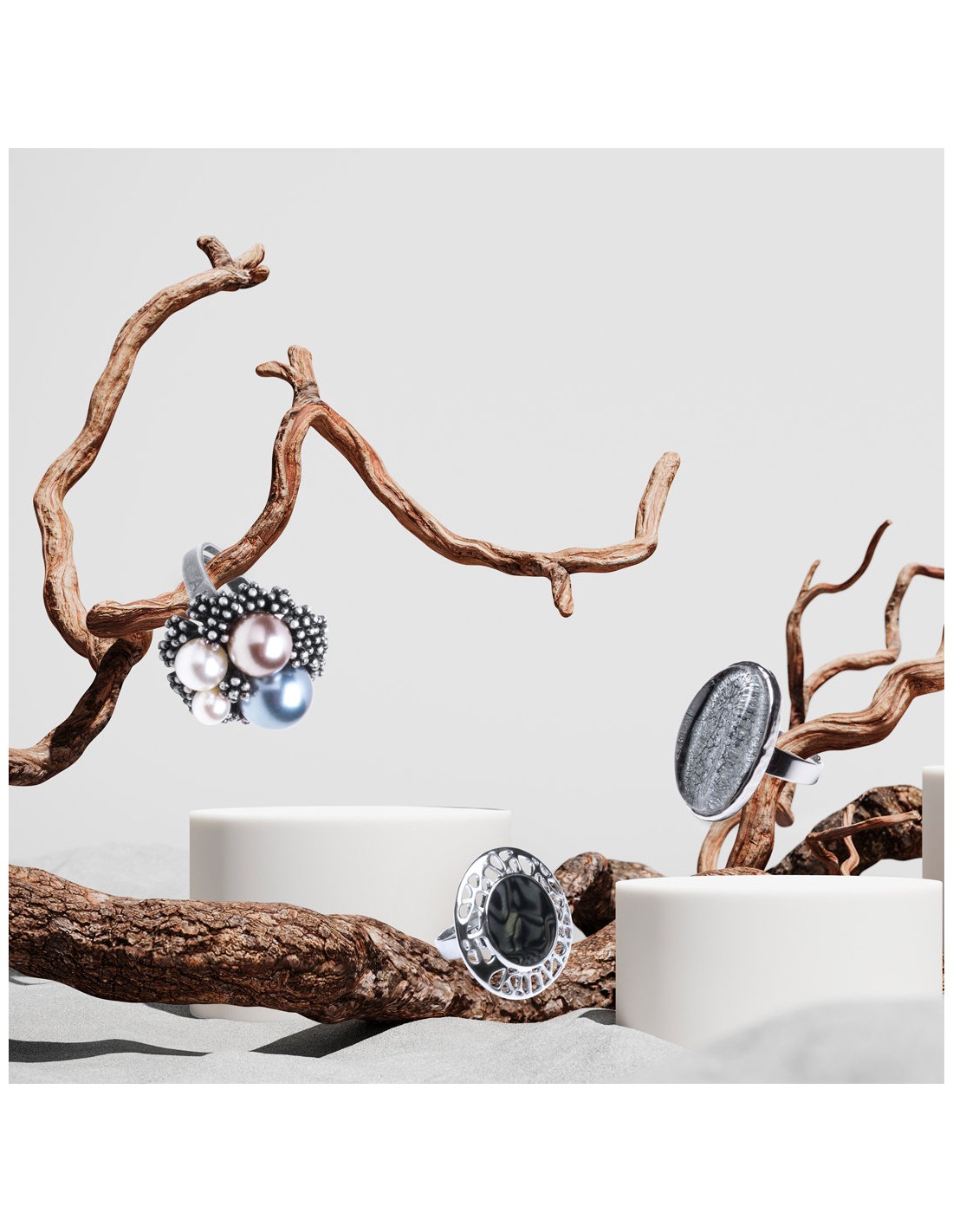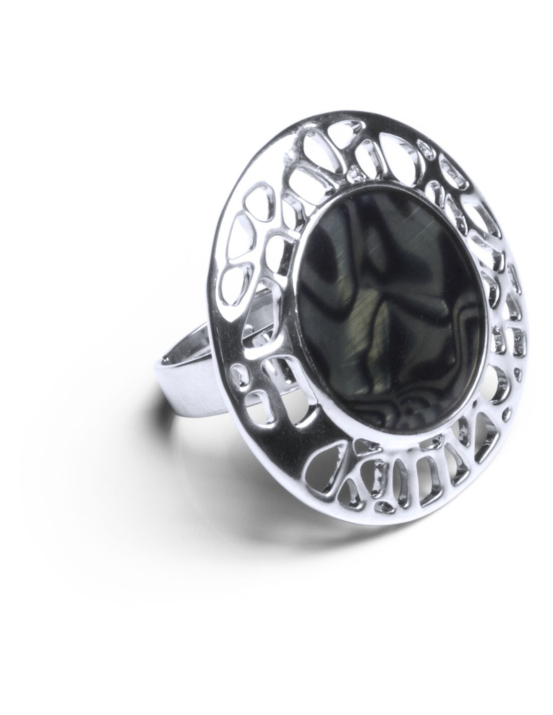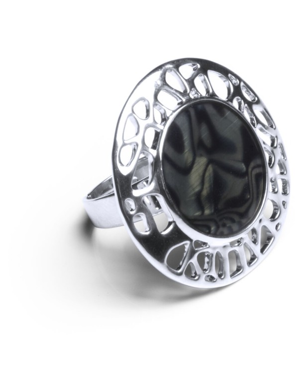 Anillo ajustable de Antonio Miró en metal con incrustación de resina. Presentado en funda de polipiel con logotipo de la marca.