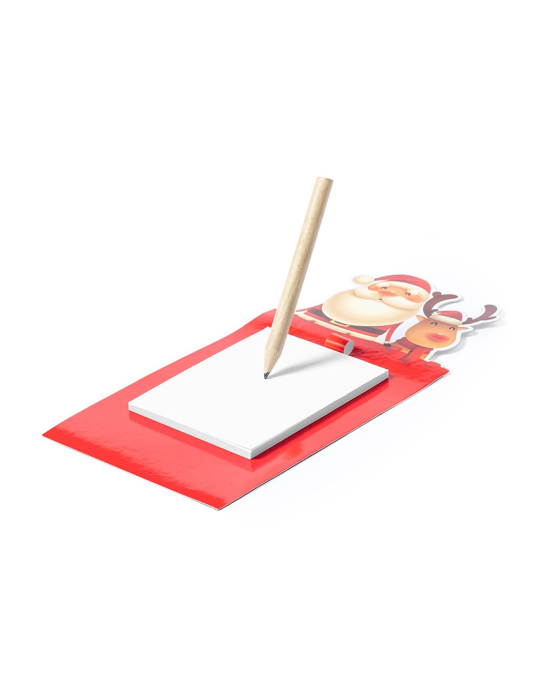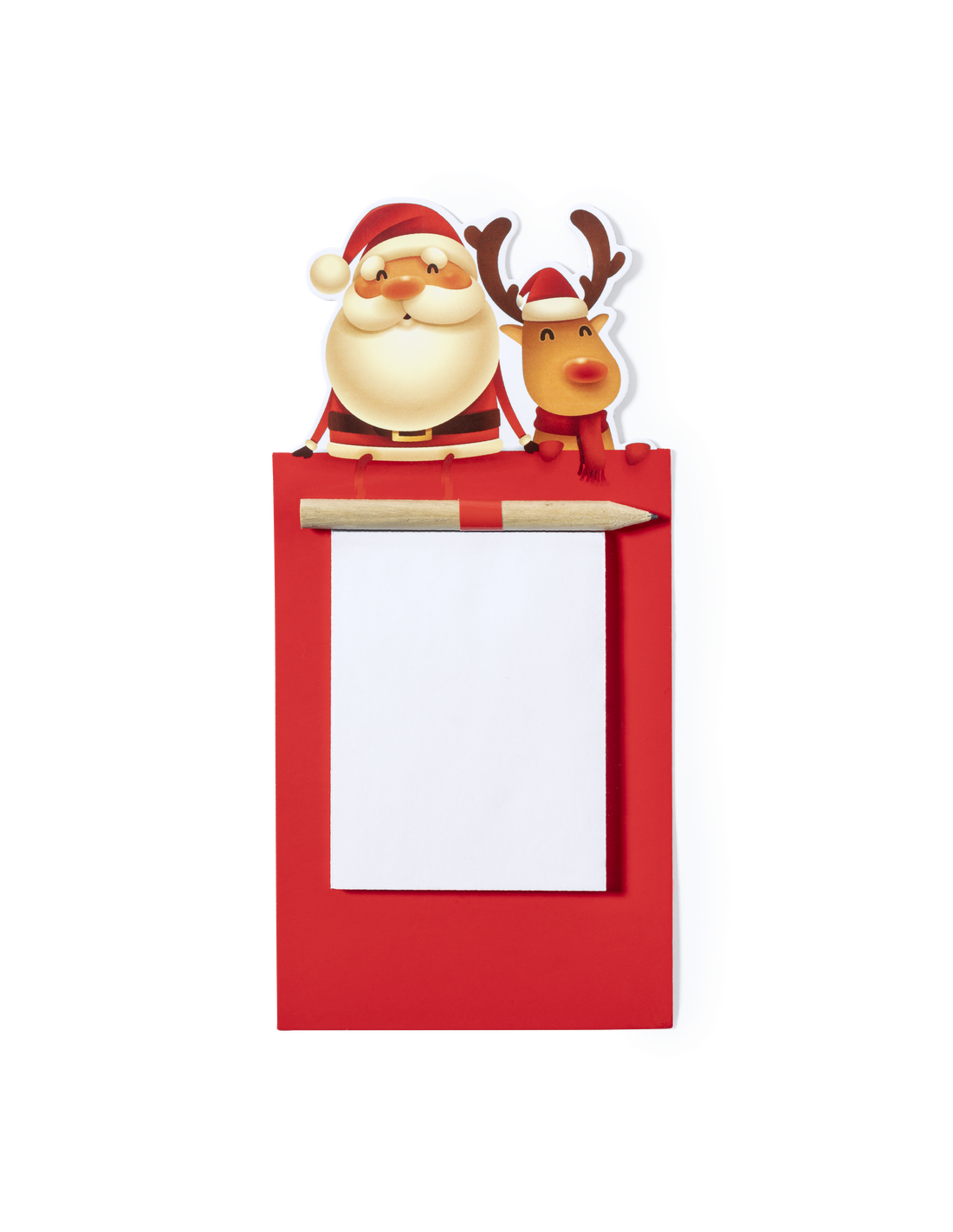 Imán con bloc de notas en divertido diseño navideño de Papá Noel y Reno. Incluye 40 hojas lisas y lápiz de madera natural.
