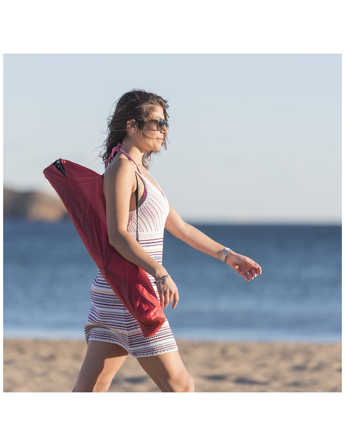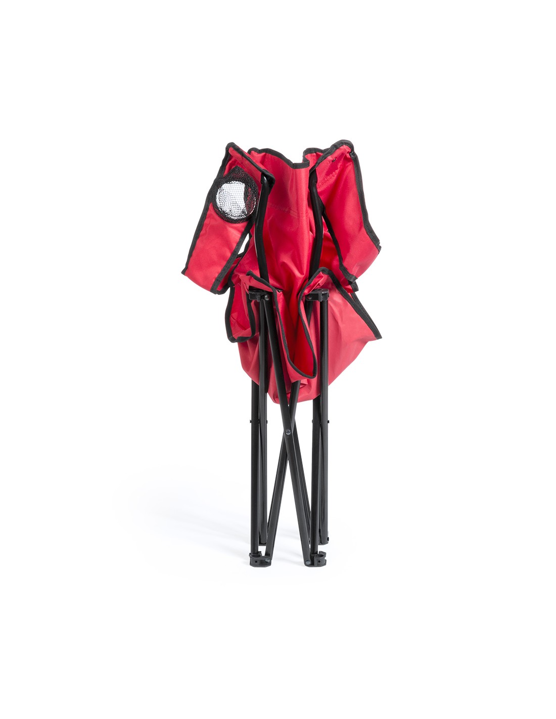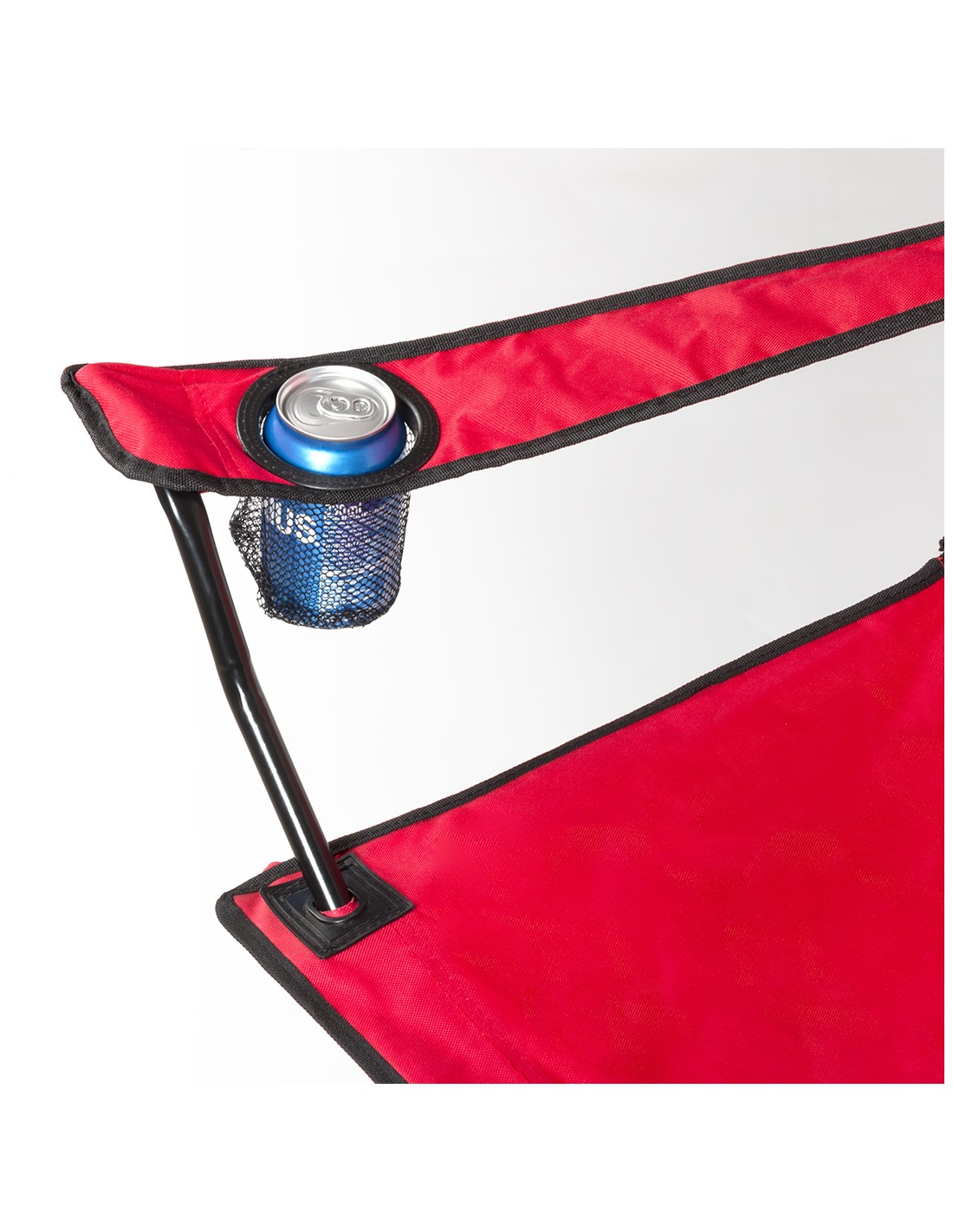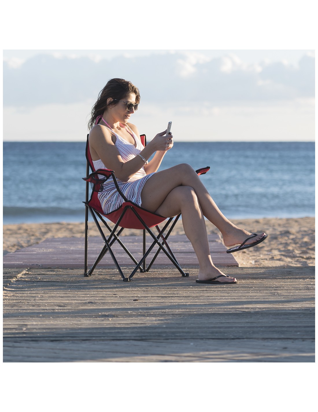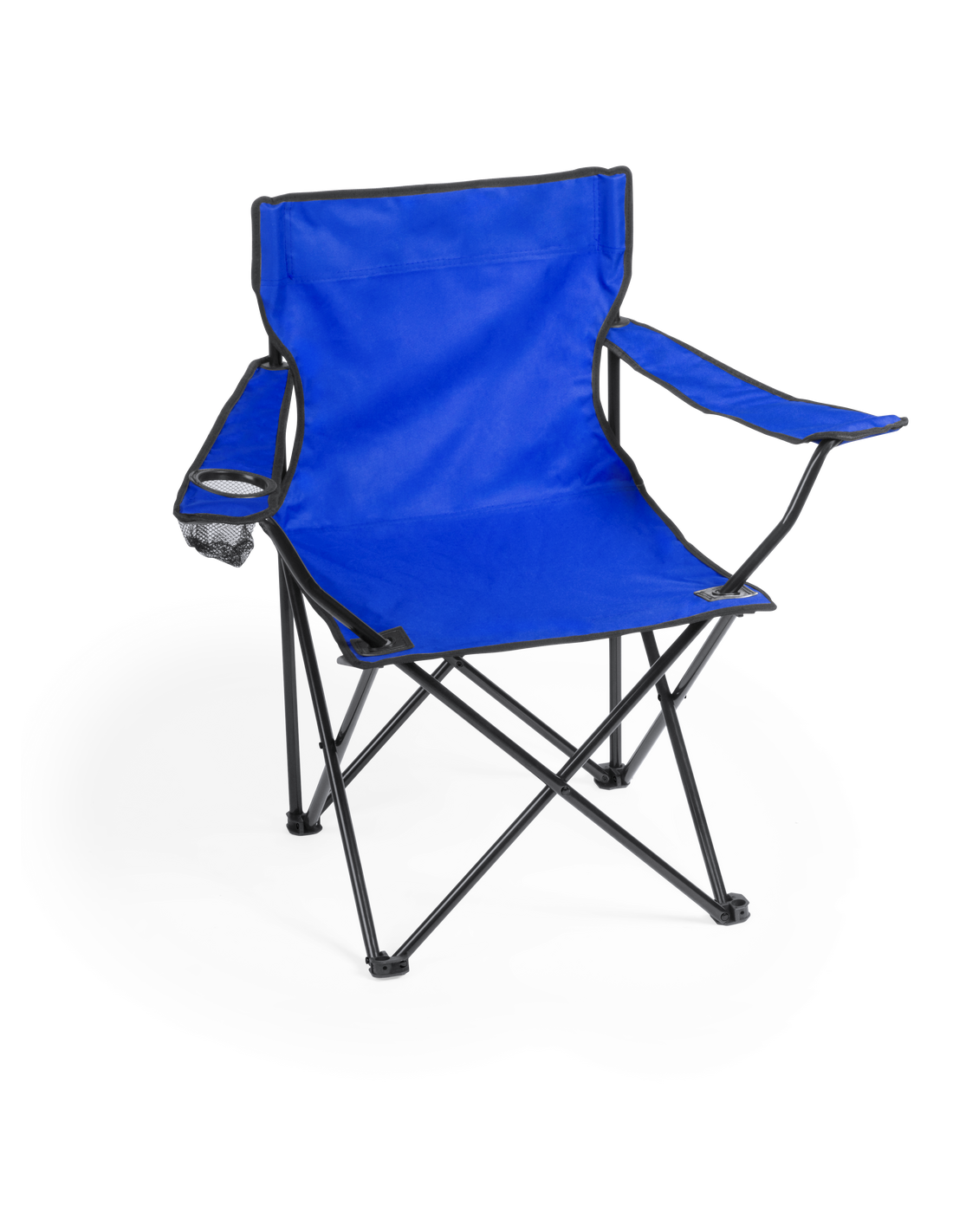 Silla plegable con resistente cuerpo de metal tubular. En resistente poliéster 600D en variada gama de vivos colores. Con costuras reforzadas, apoyabrazos y bolsillo de redecilla integrado para bebida. Con refuerzos de goma antideslizantes en las patas y presentada en funda individual con cordón auto cierre, accesorio de ajuste y cinta para hombro.