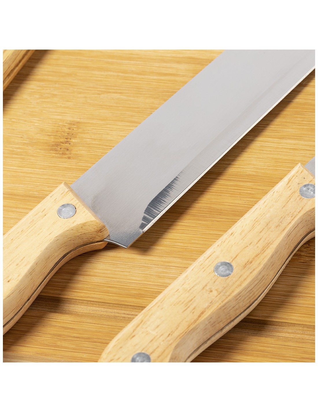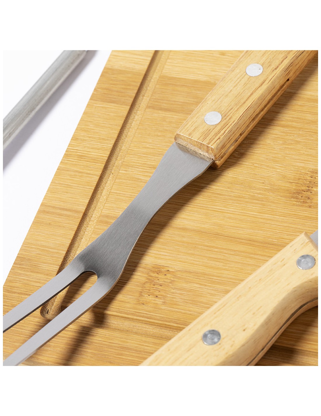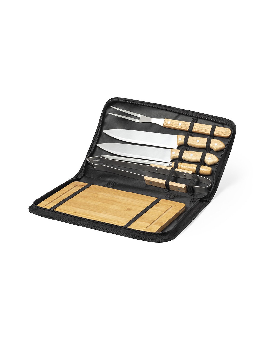 Set de barbacoa de línea nature y 6 accesorios fabricados en metal con mango de madera. Incluye 2 cuchillos, afilador, trinchador y pinzas, con tabla de bambú para corte y presentación. Presentado en estuche indvidual de resistente poliéster, con sujeciones elásticas interiores para los distintos utensilios.