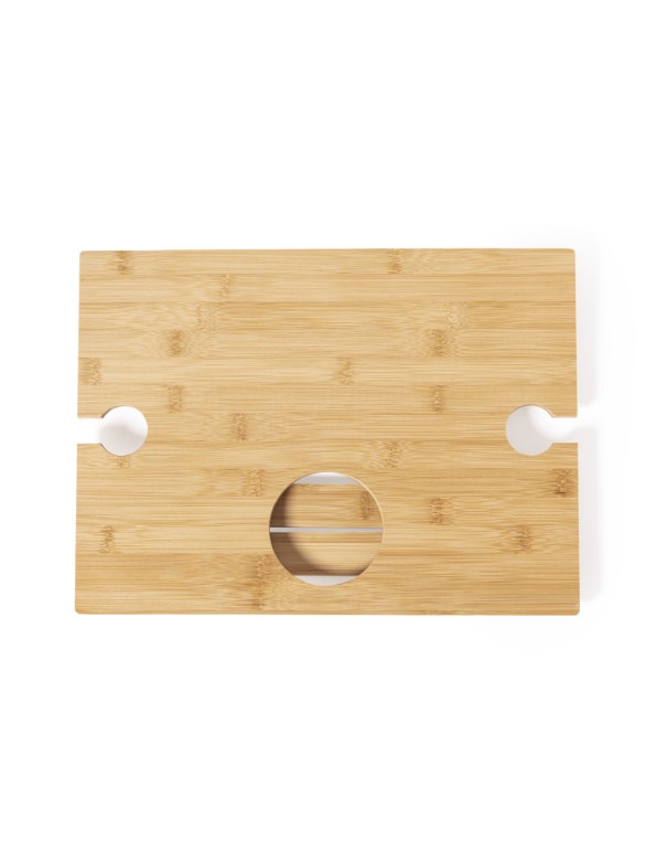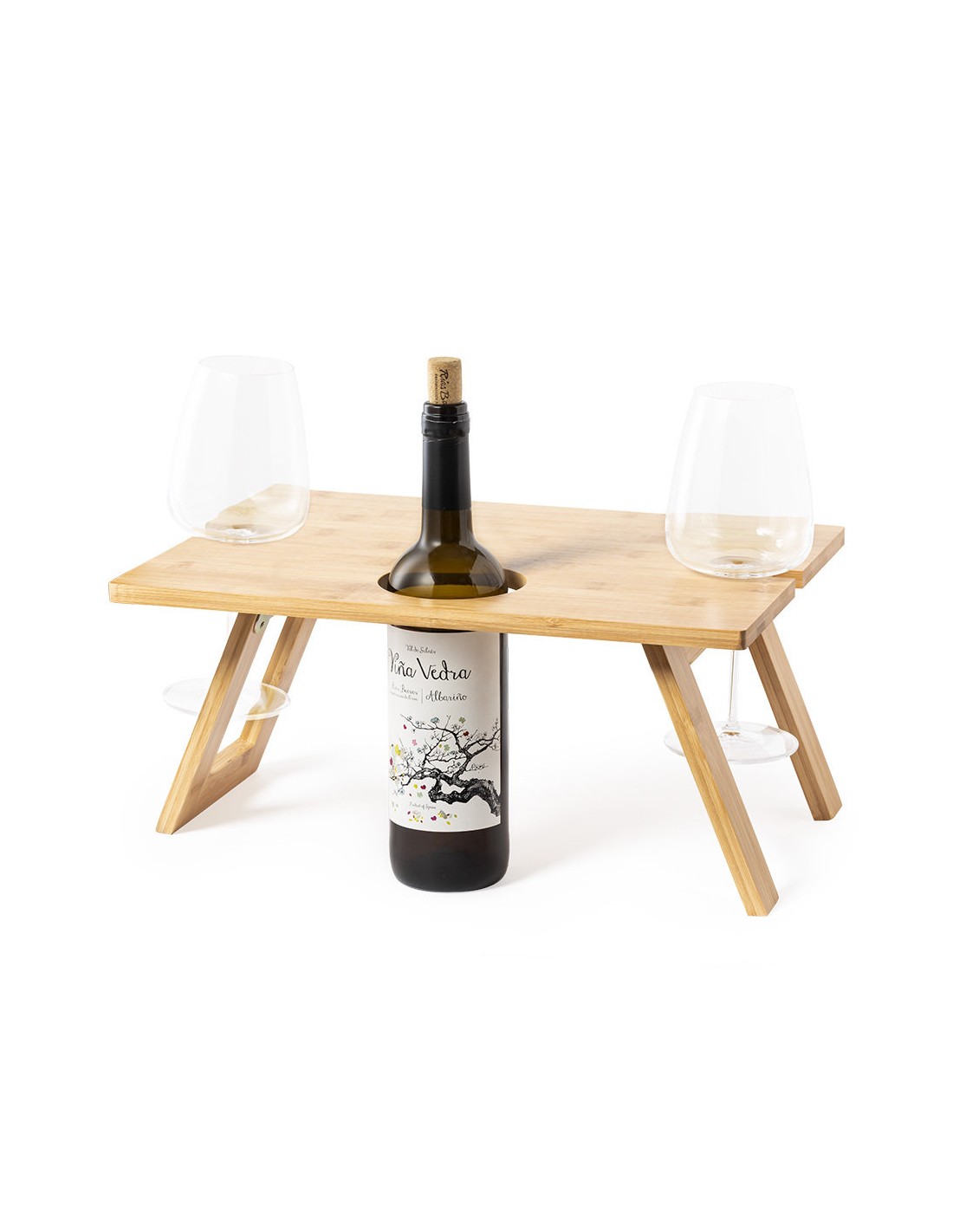 Mesa plegable para los aficionados al mundo del vino. Fabricada en bambú, incluye compartimento para botella de 75cl y 2 soportes para copa. De fácil plegado y tamaño compacto, presentada en atractiva caja individual de diseño eco.