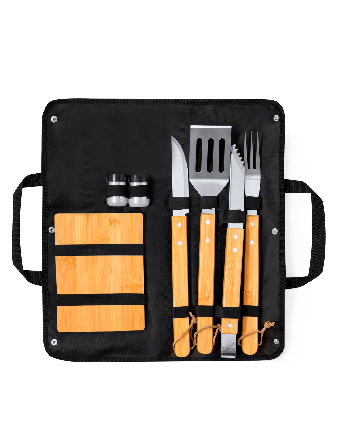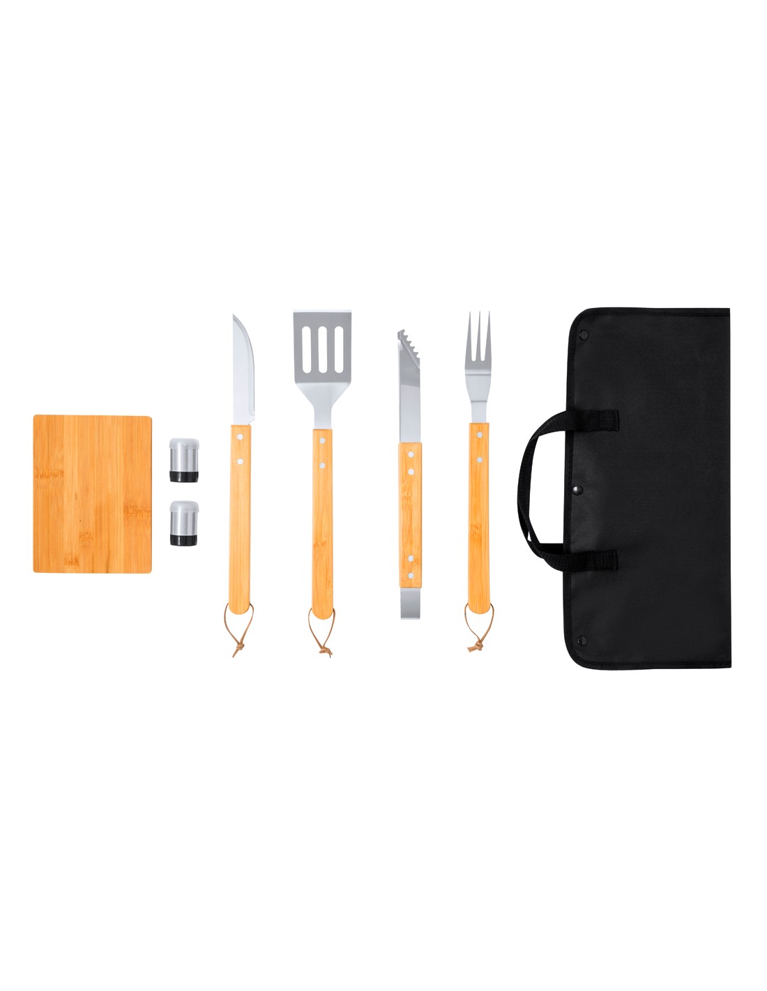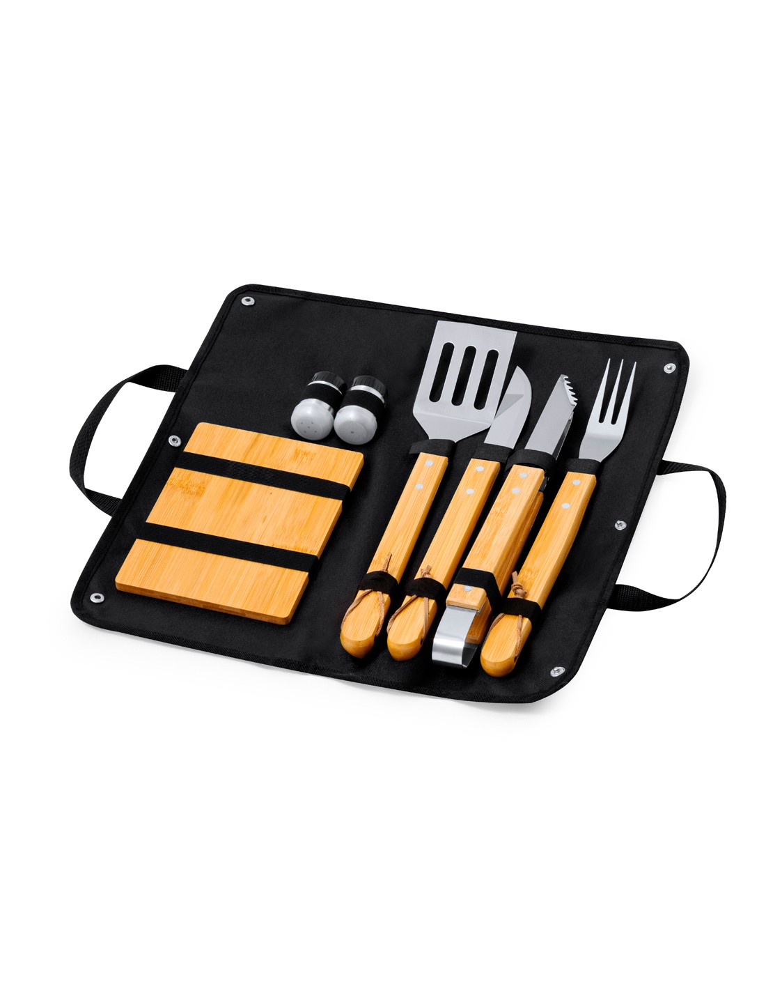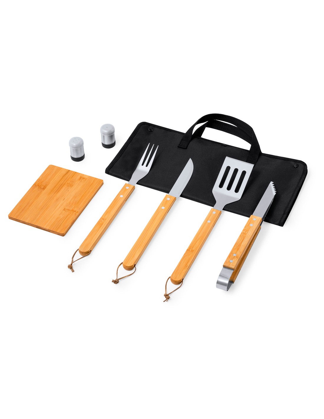 Set de barbacoa elaborado en bambú y acero inox. Este conjunto incluye 7 accesorios de metal con mangos de bambú: 1 cuchillo, trinchador, pinzas, espátula, salero y pimentero, junto con una tabla de bambú para corte y presentación. El set se presenta de manera elegante en un estuche individual fabricado en resistente poliéster, con sujeciones elásticas interiores para los distintos utensilios.Materiales como el bambú fomentan la utilización de materias primas naturales, reduciendo las emisiones contaminantes. Proviene de una planta de gran resistencia y versatilidad, con crecimiento y regeneración rápidos, siendo una excelente alternativa al uso de madera tradicional.