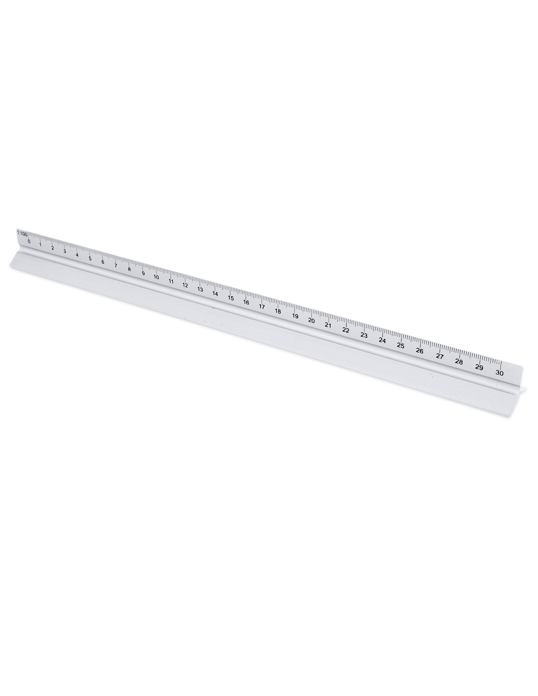 Escalímetro de aluminio en diseño triangular de 30cm. Escalas 1:20/1:25/1:50/1:75/1:100. Con cara lisa para marcaje. Presentado en caja individual.
