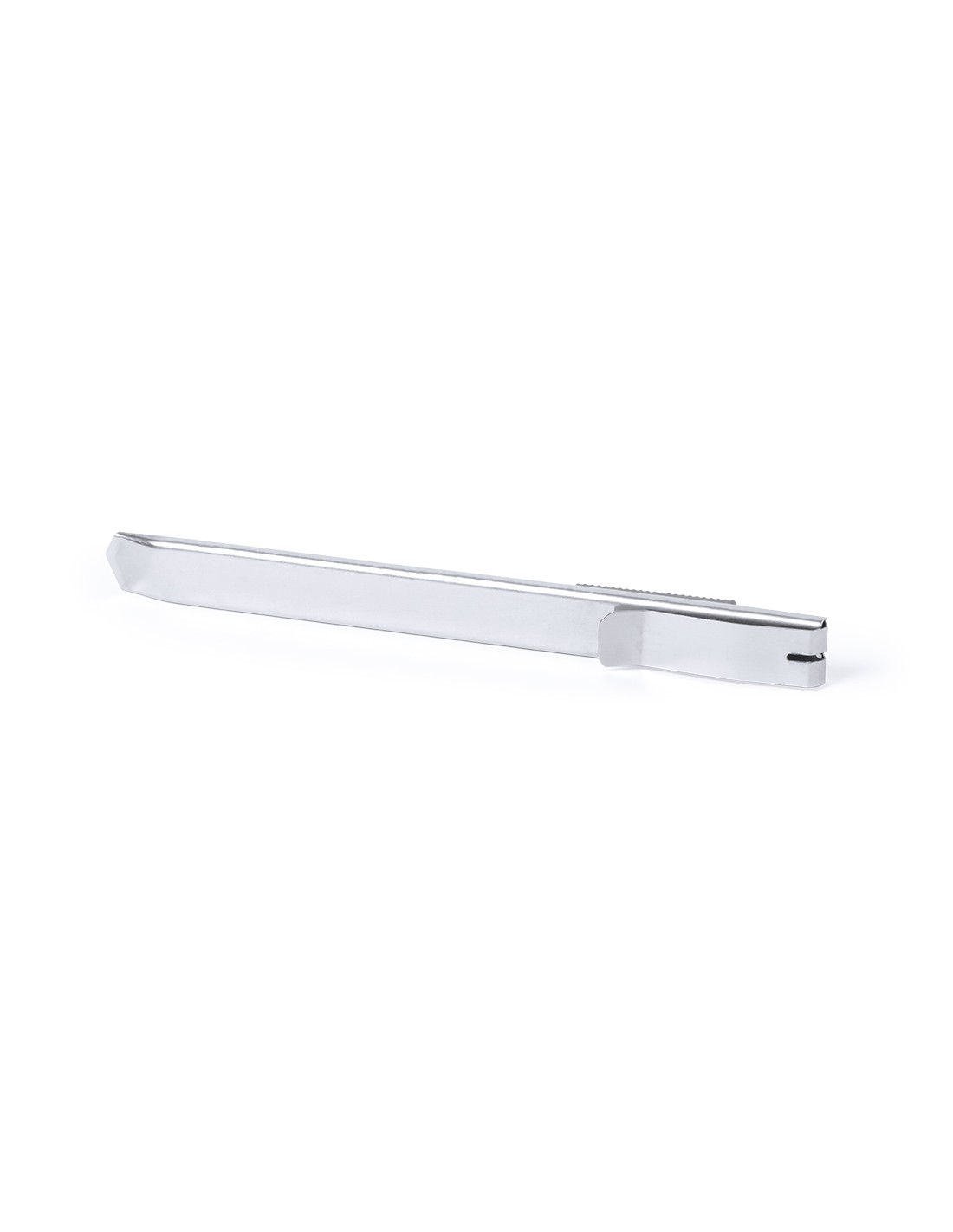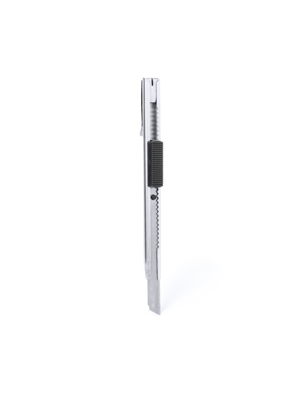 Cutter de acero inox con cuchilla fina y clip de fijación. Capucha extraíble para ajuste de corte de cuchilla.