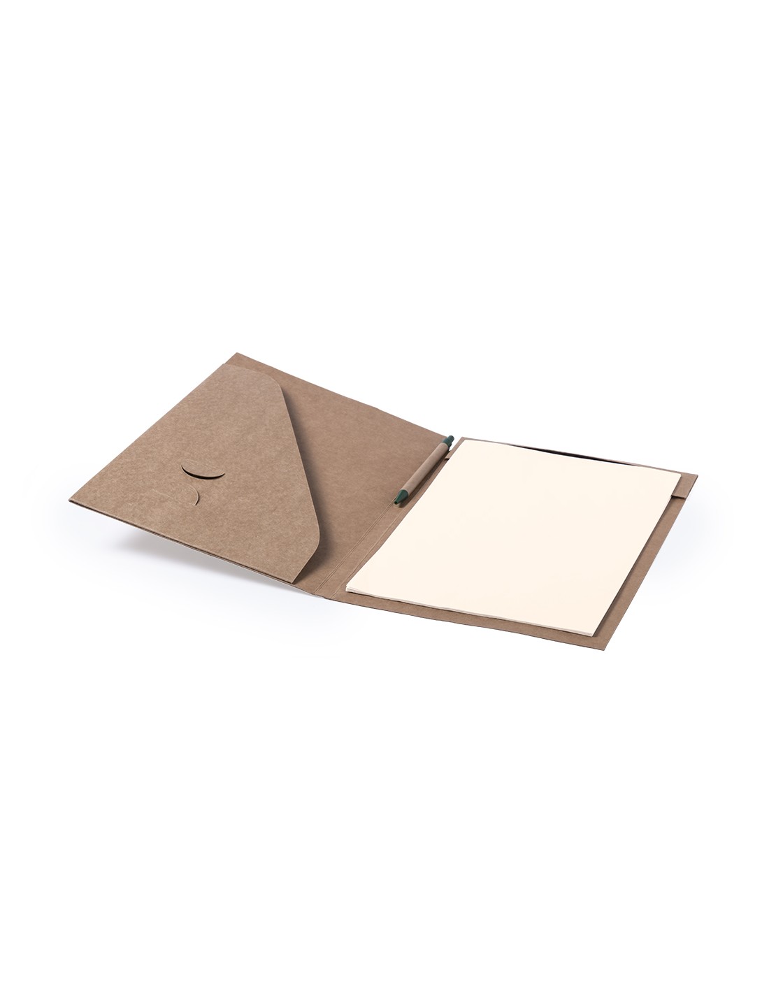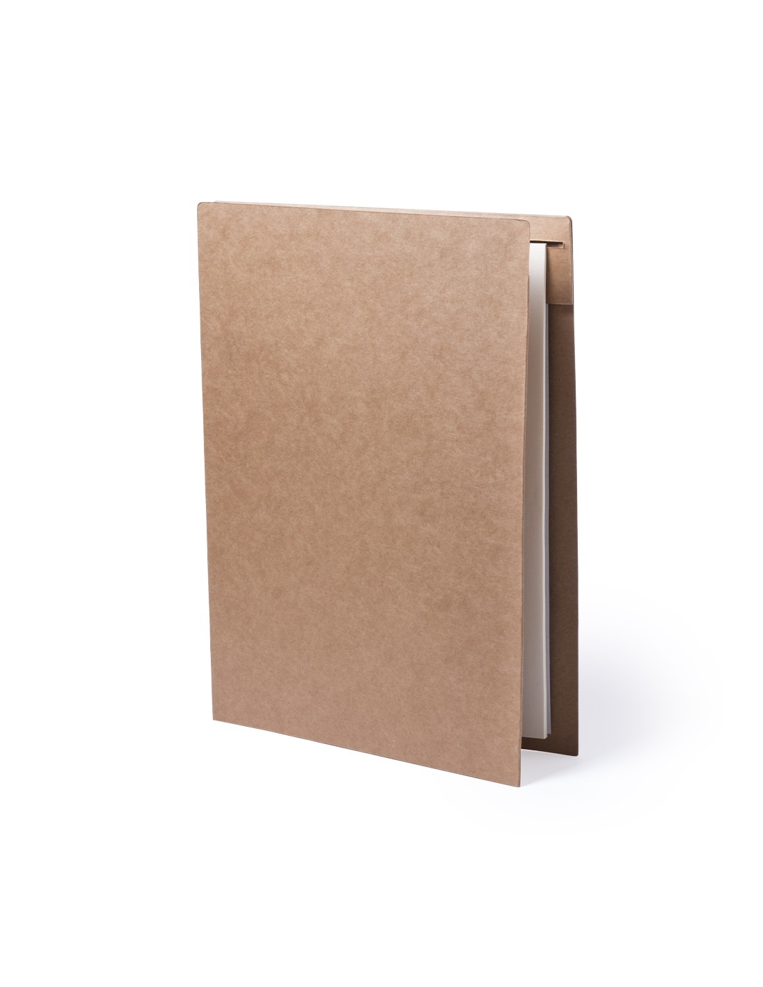 Carpeta en resistente cartón reciclado de acabado rígido con bolígrafo de cartón reciclado a juego incluido. Interior con bloc extraíble de 20 hojas lisas, bolsillo de solapa, tarjetero y soporte para bolígrafo.