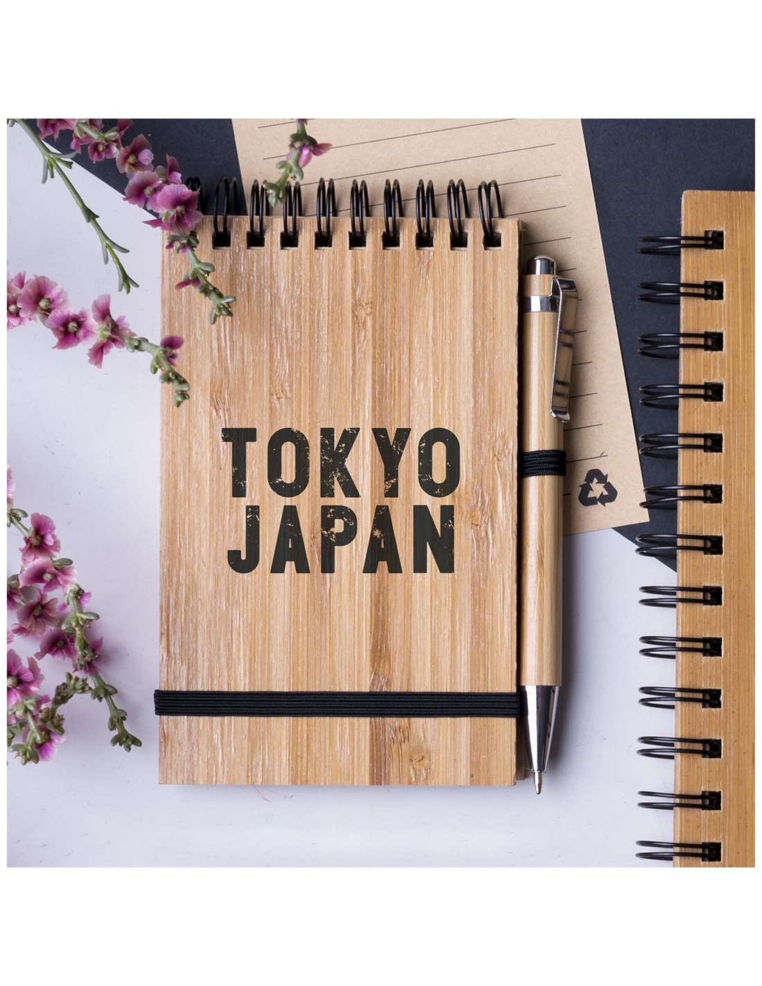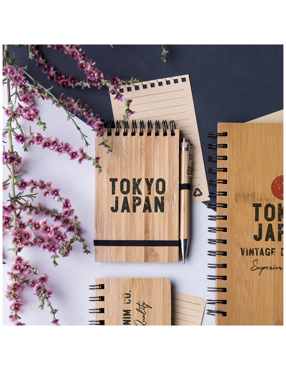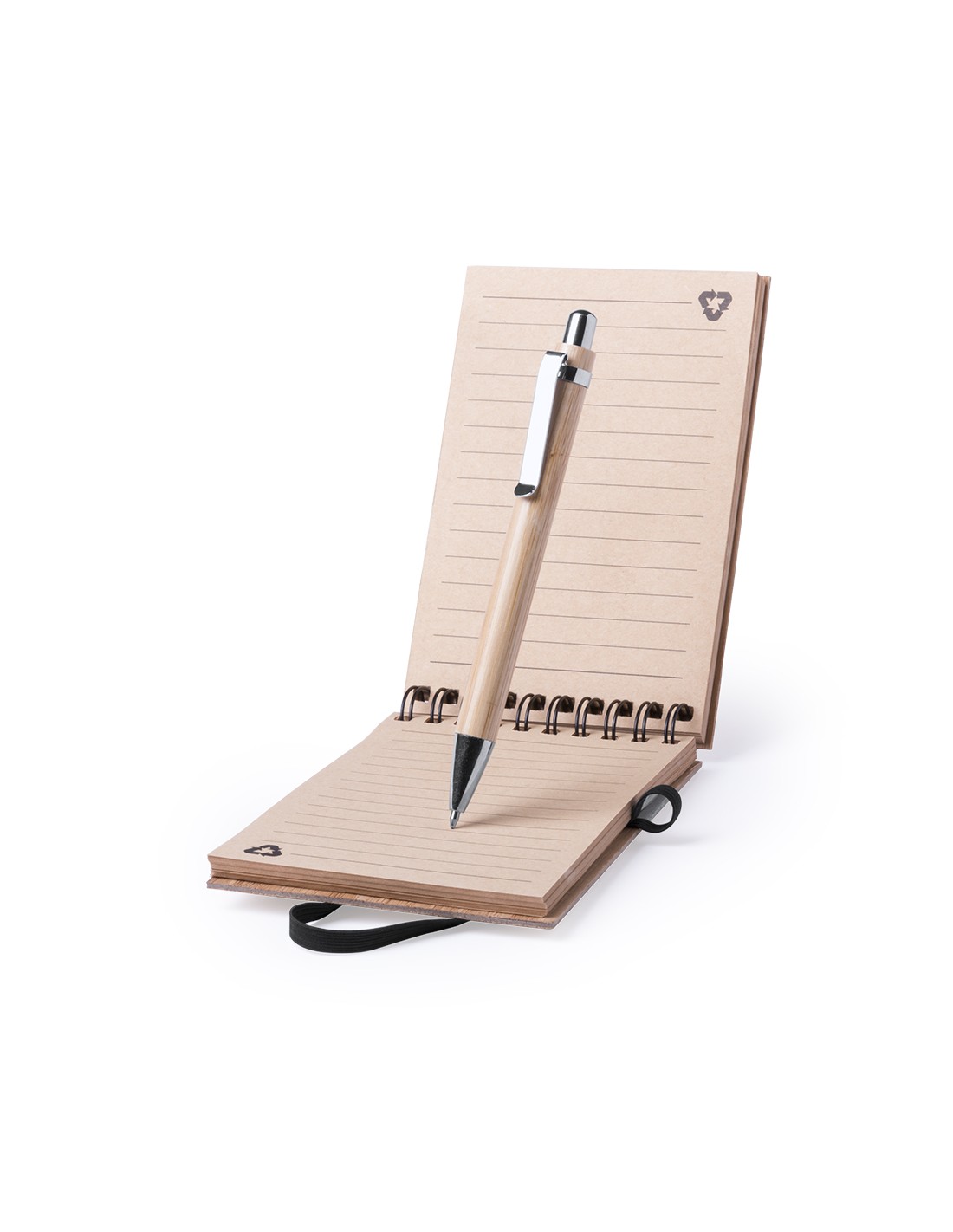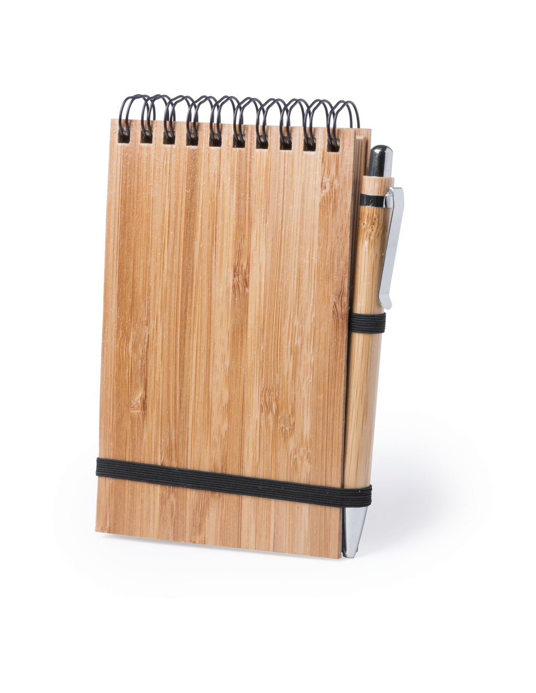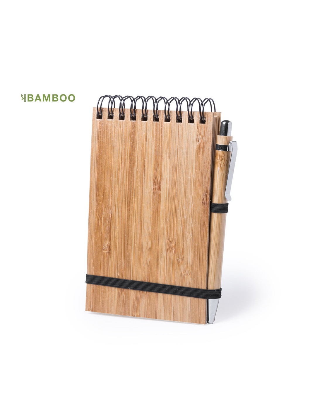 Libreta de anillas en línea nature con tapas rígidas de bambú y bolígrafo a juego, también en bambú. De tamaño compacto, con elástico de cierre en elegante color negro. Incluye 70 hojas con disposición a una raya y diseño eco. Bolígrafo con cartucho jumbo y tinta azul.