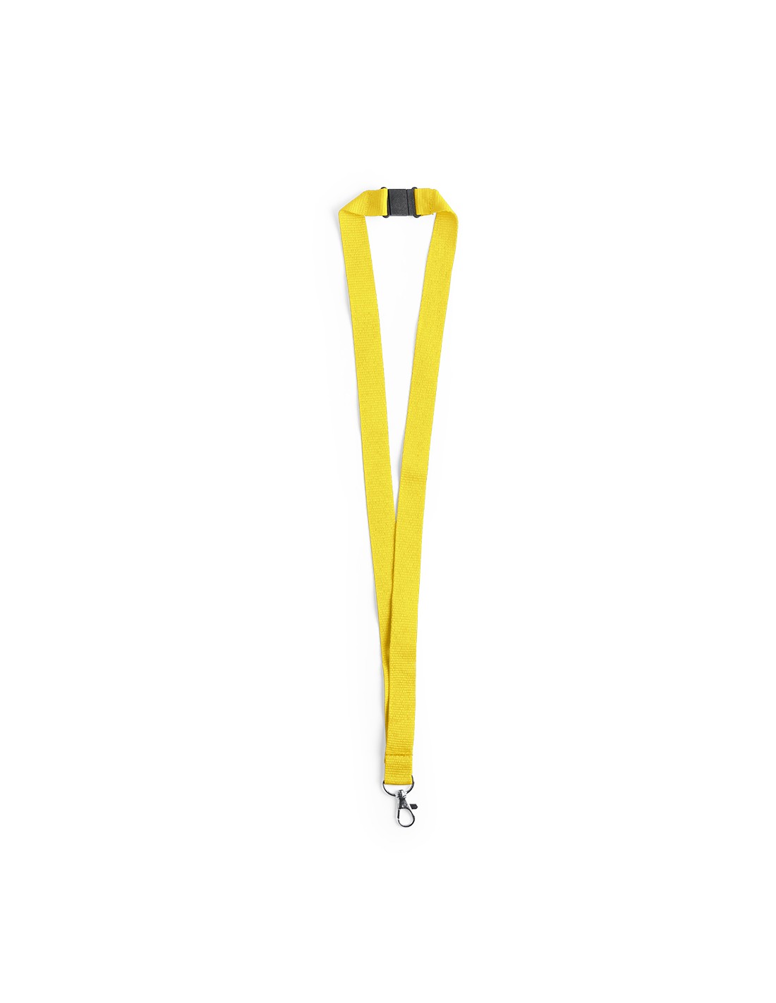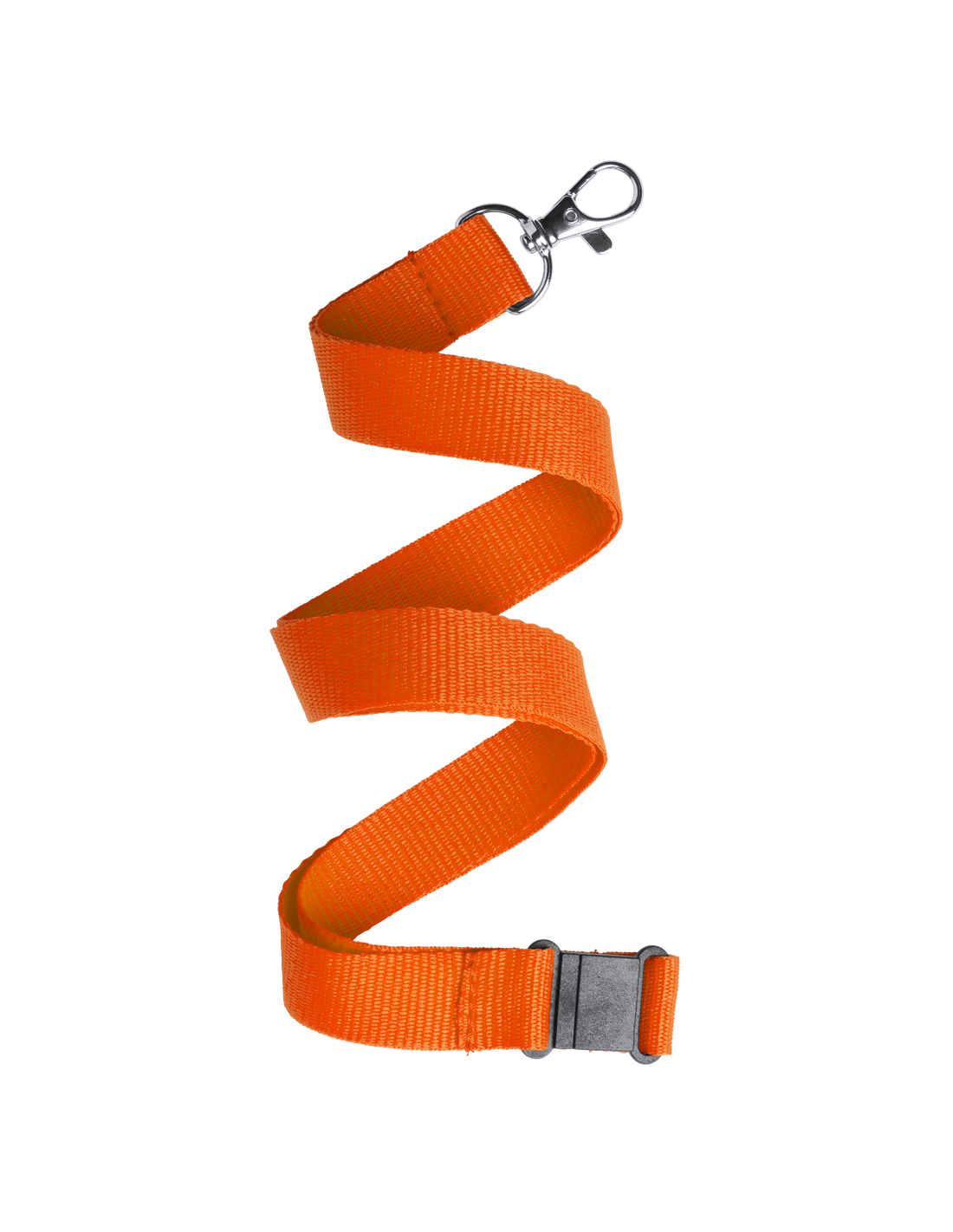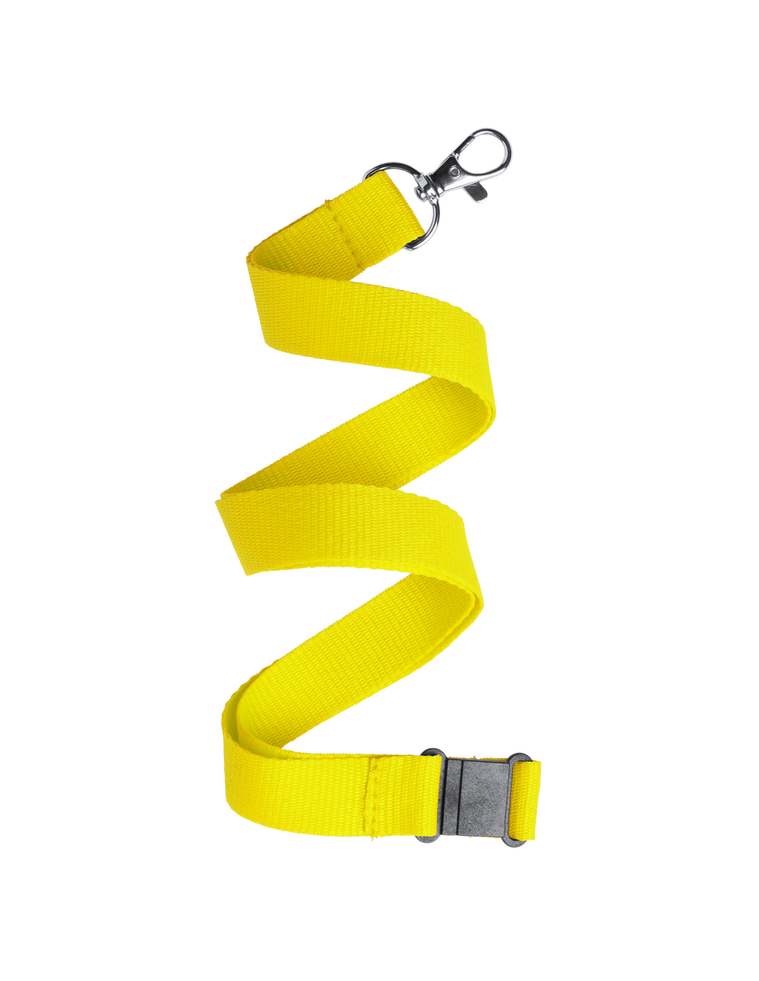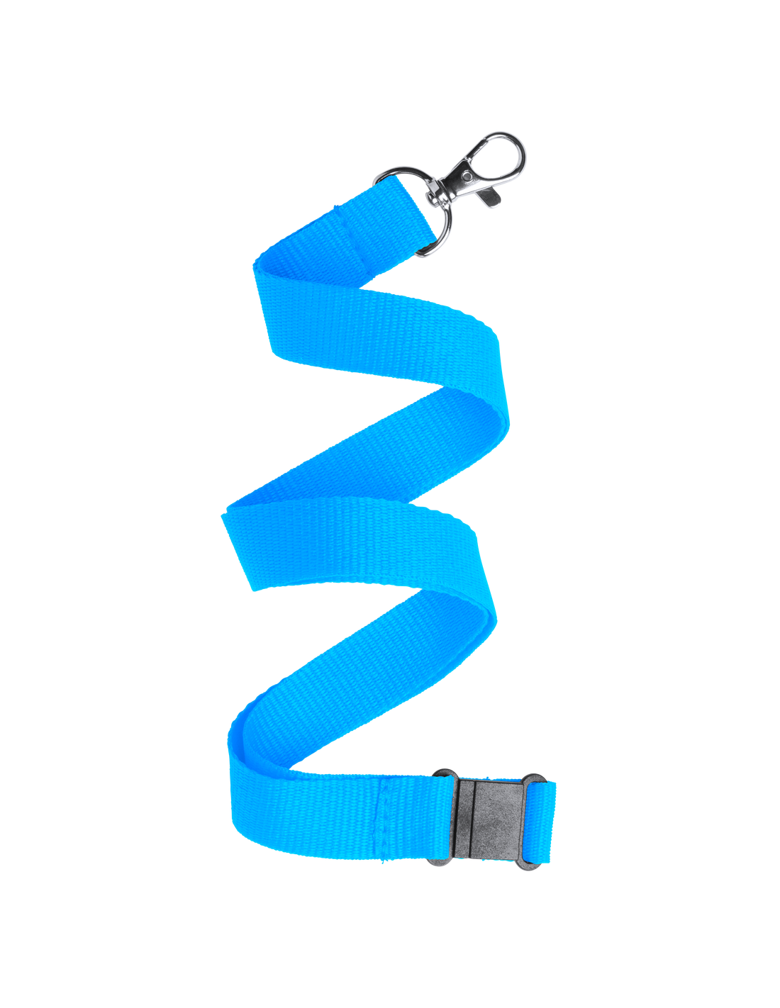 Lanyard en resistente poliéster, con accesorio de seguridad en el cuello y mosquetón metálico. Disponible en variada gama de colores vivos.