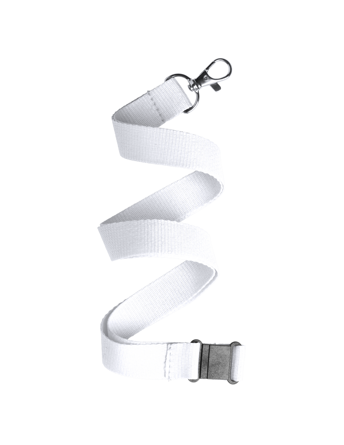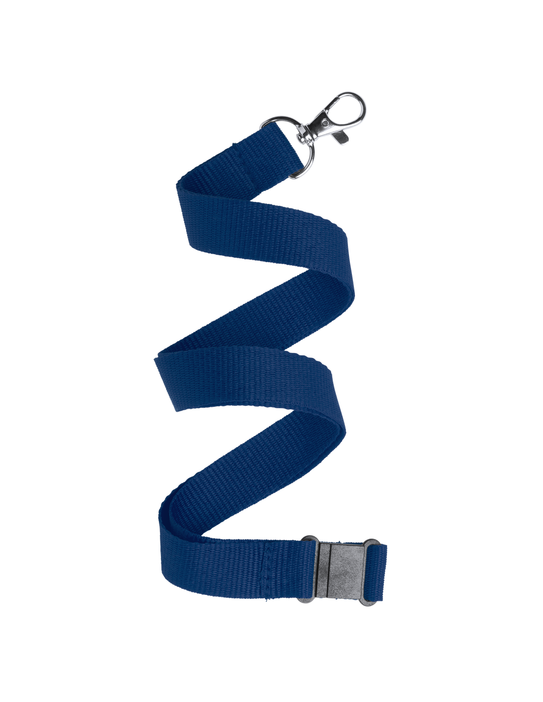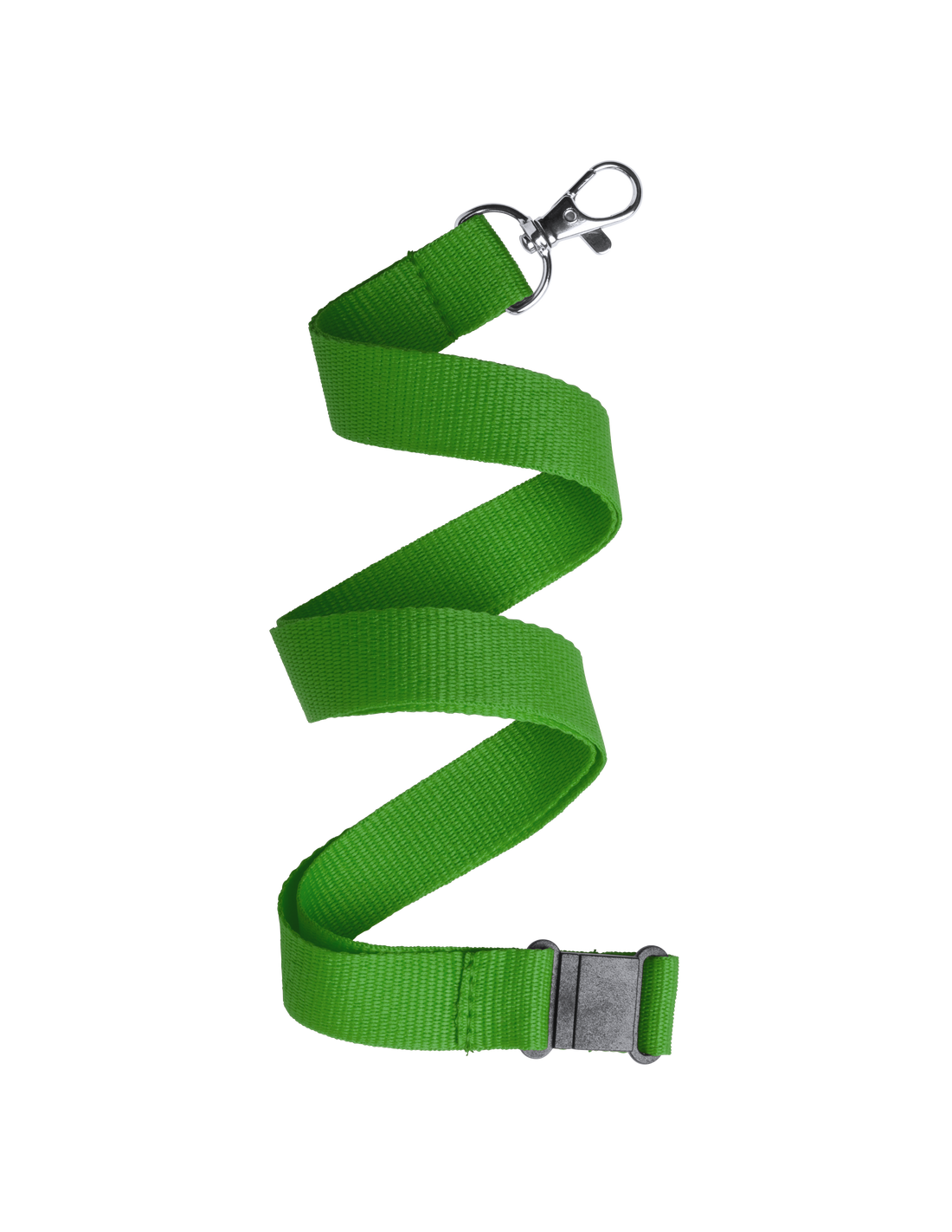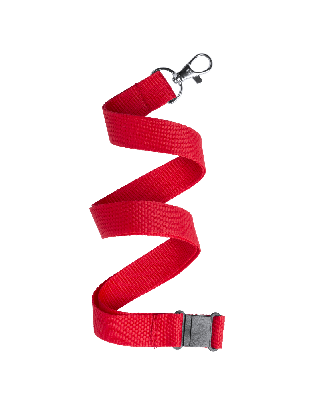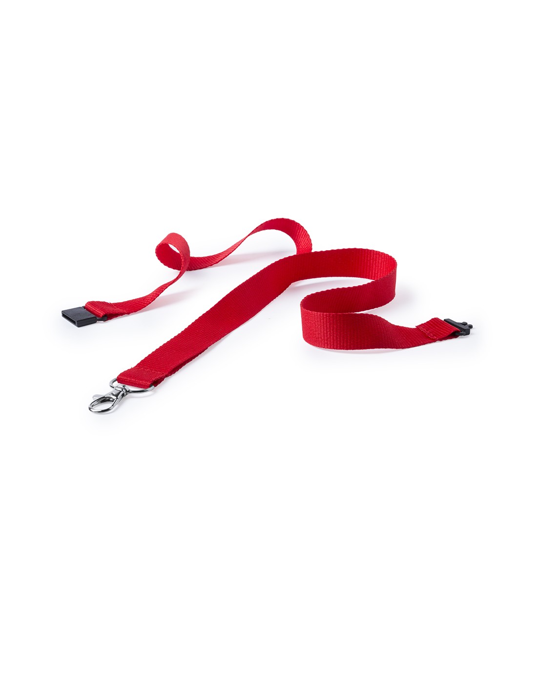 Lanyard en resistente poliéster, con accesorio de seguridad en el cuello y mosquetón metálico. Disponible en variada gama de colores vivos.