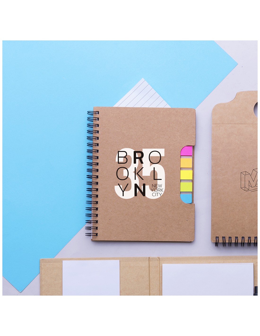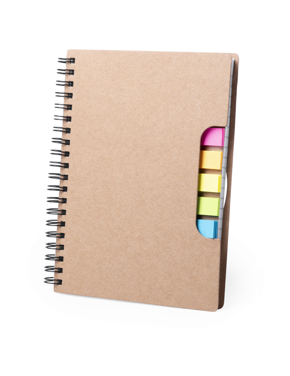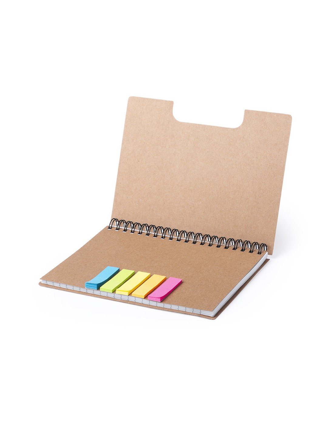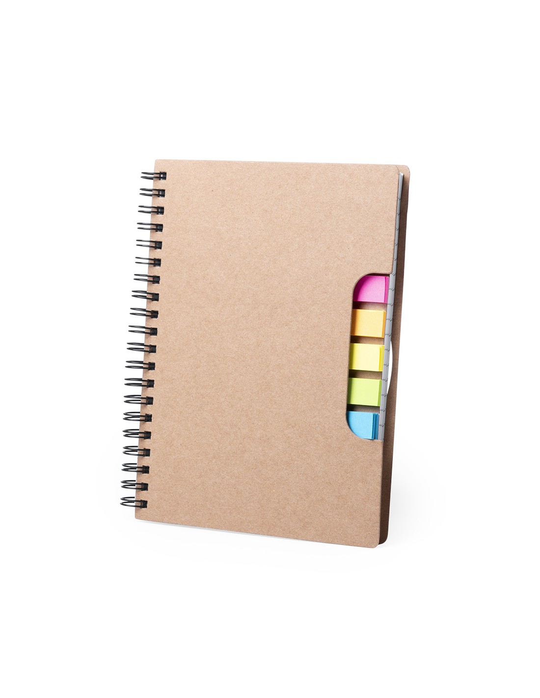 Libreta de anillas con tapas en cartón reciclado. Con original portada troquelada que muestra los colores de las notas adhesivas del interior. Incluye bloc de 60 hojas con disposición a una raya y 125 notas adhesivas pequeñas.