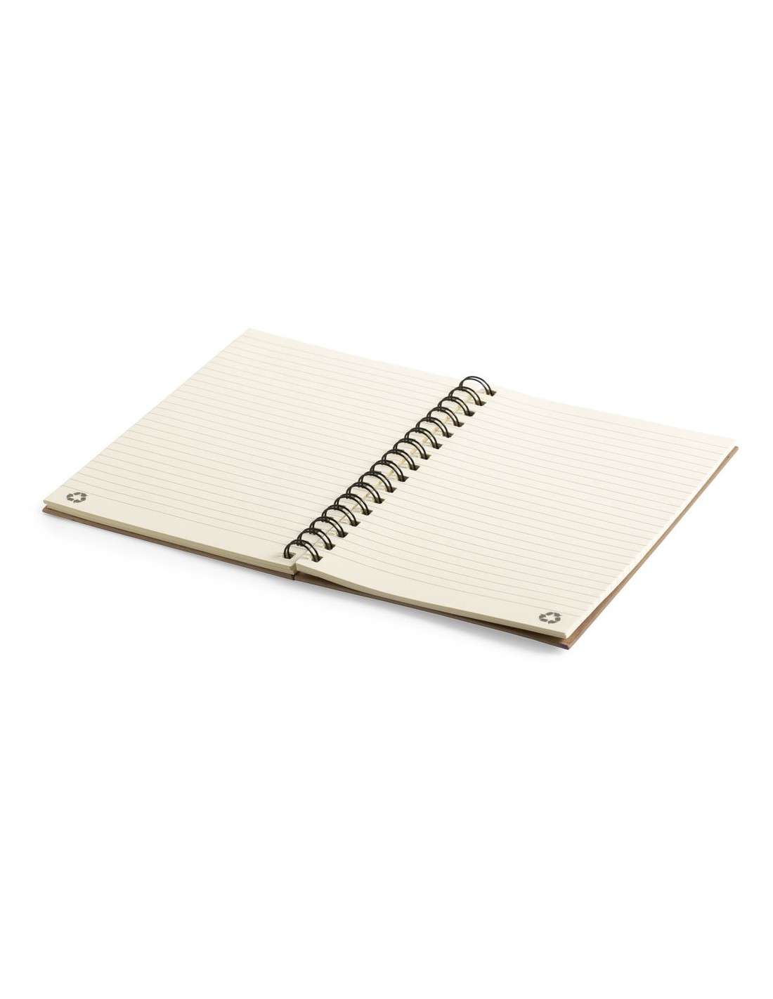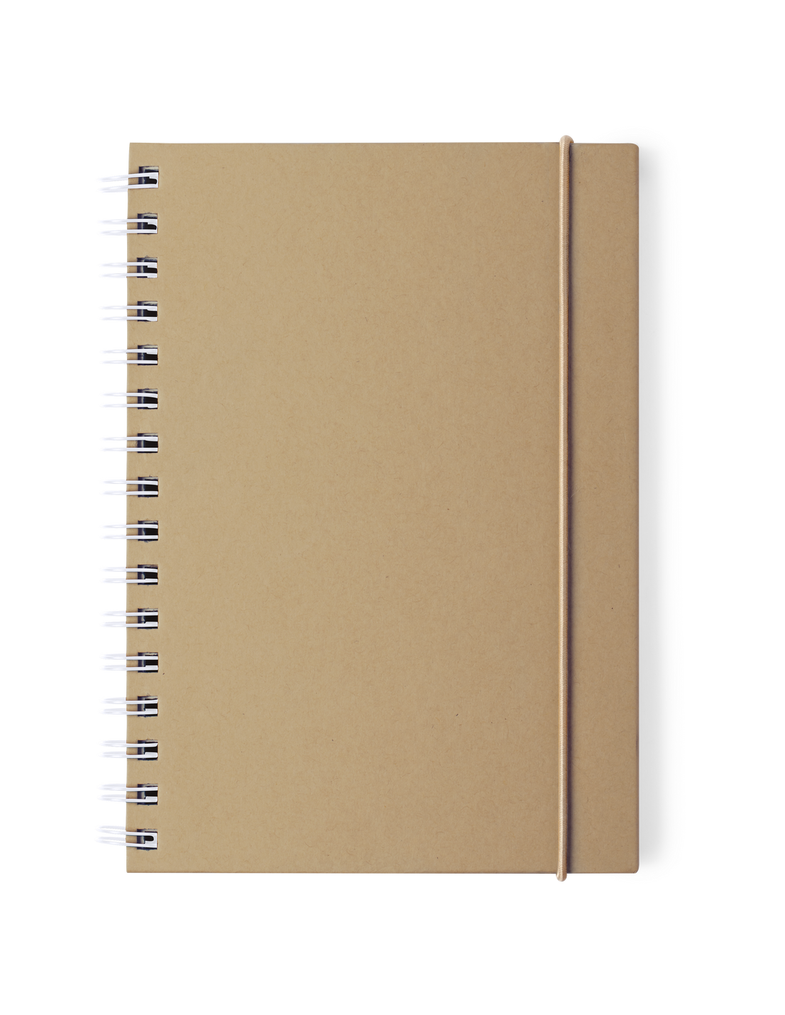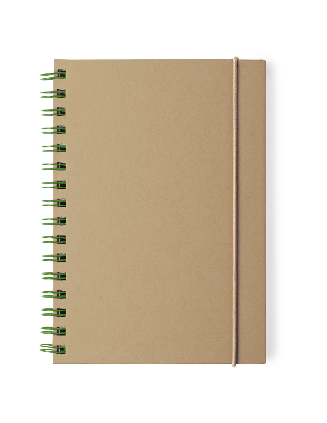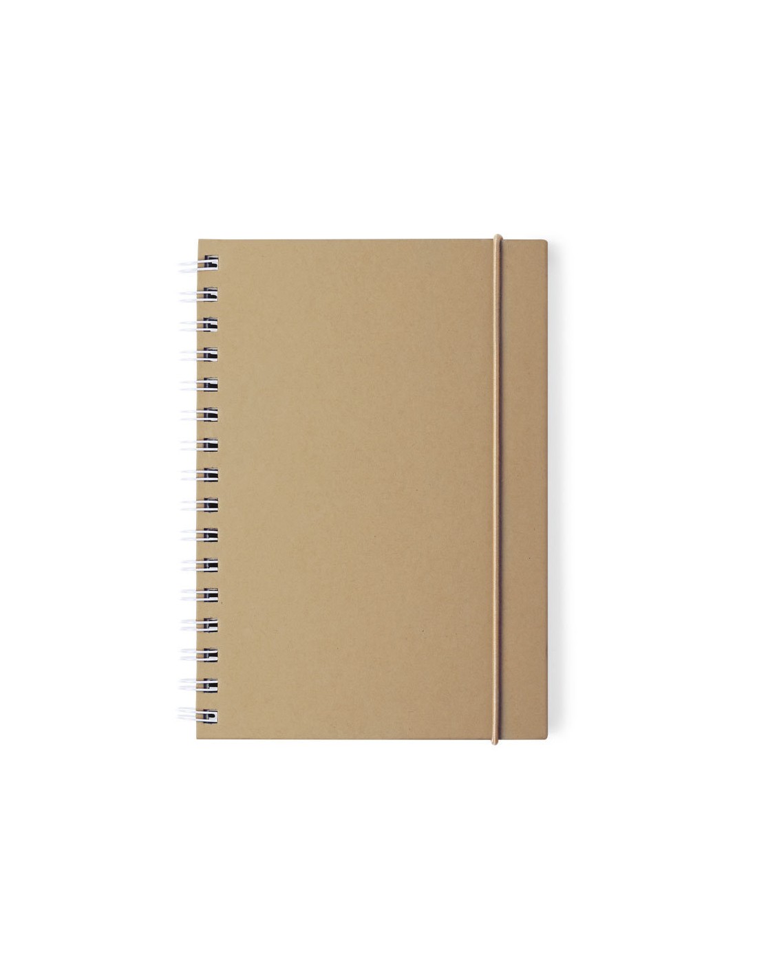 Libreta con anillas de color en línea nature. Con tapas rígidas en cartón reciclado y elástico de cierre en colores naturales. Con 80 hojas de disposición a una raya y diseño eco.