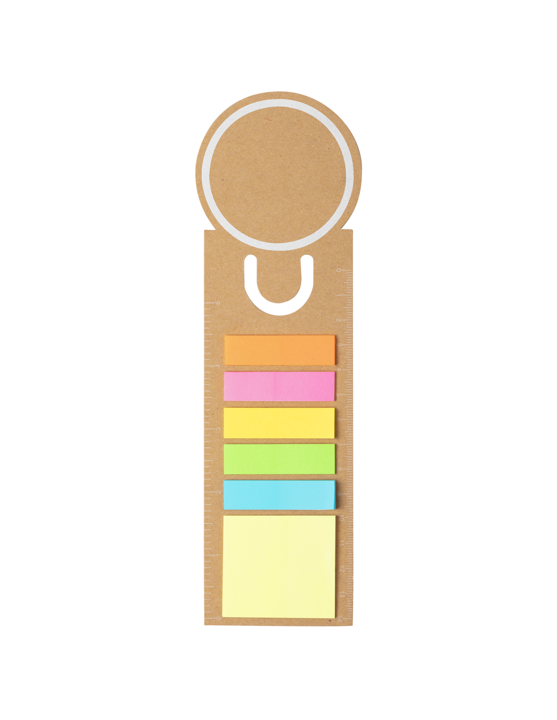 Regla marcapáginas de línea nature. En cartón reciclado y con amplia superficie de marcaje. Incluye 15 notas adhesivas medianas y 75 mini notas ahesivas