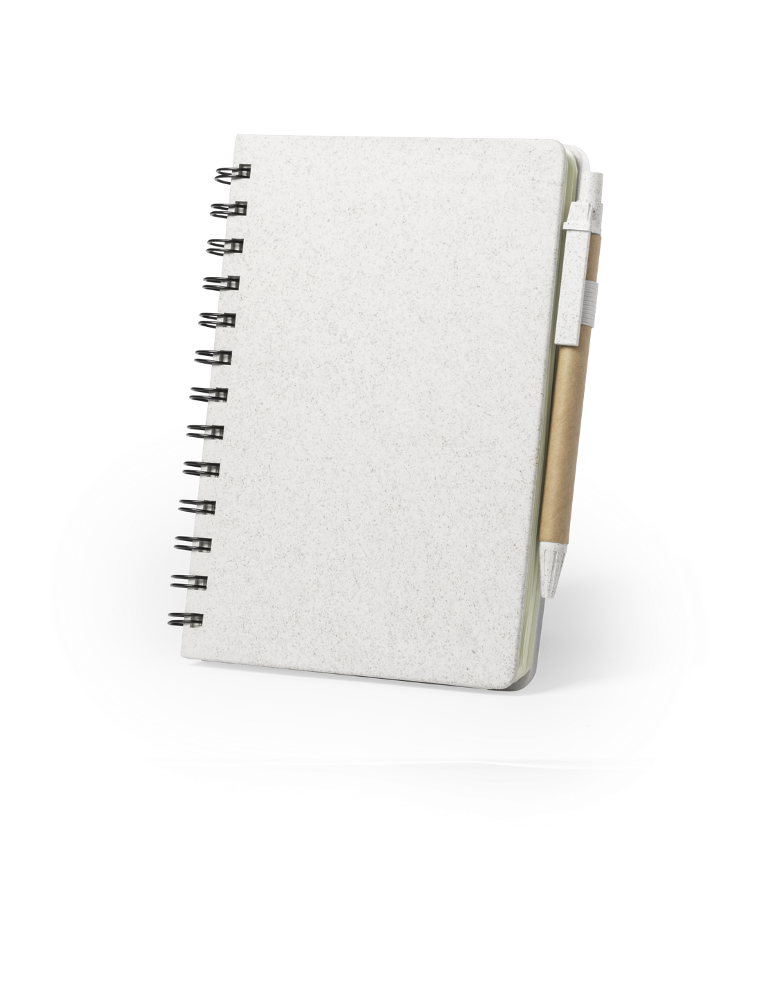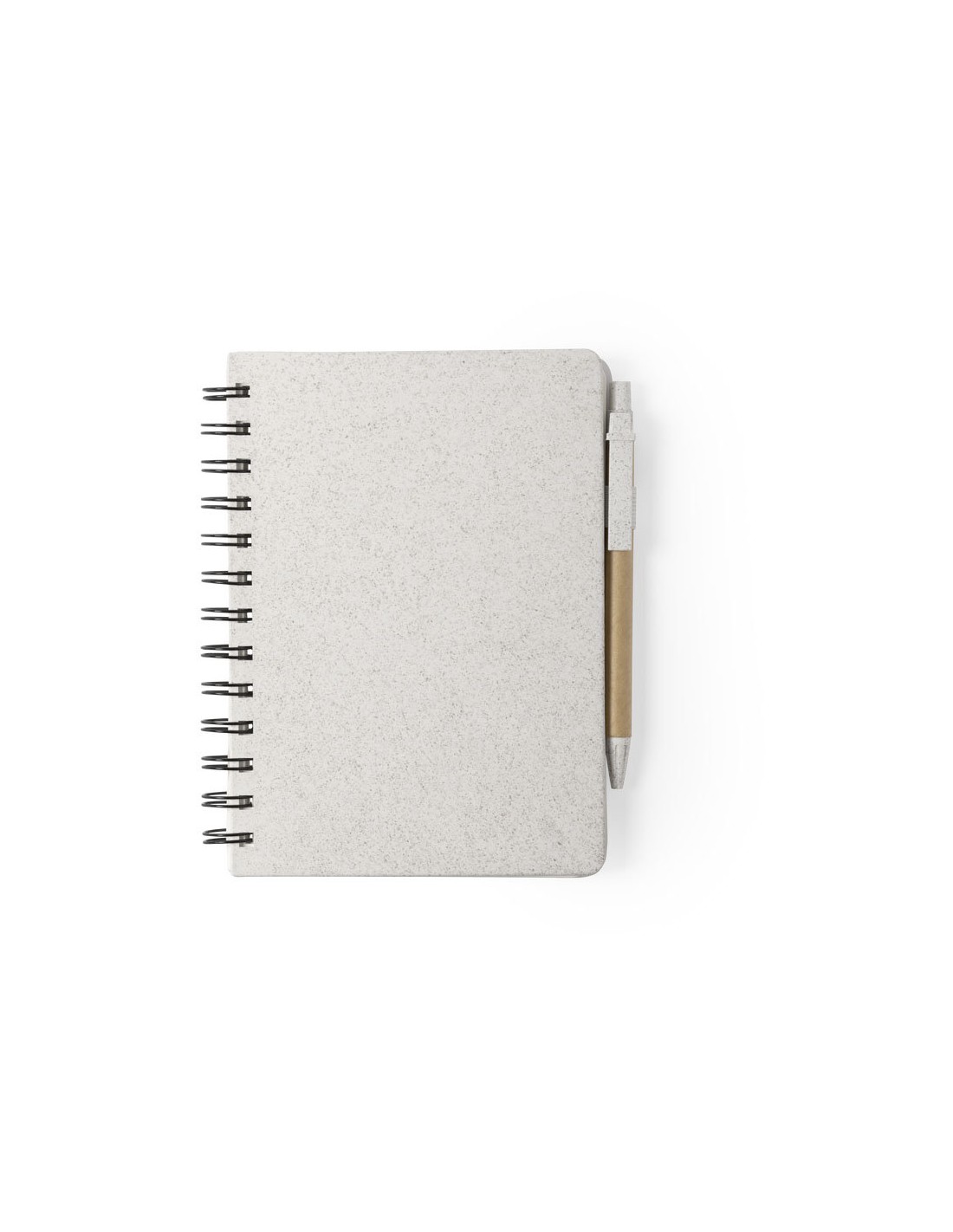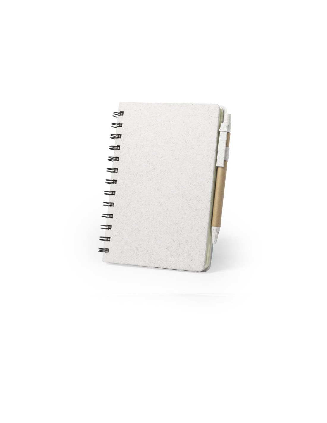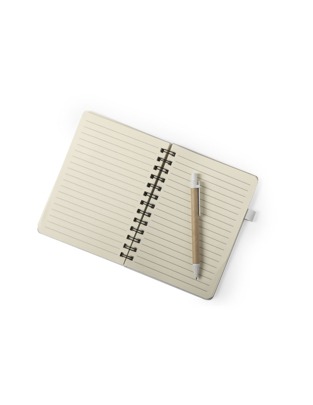 Set de libreta y bolígrafo de línea nature. Libreta de anillas con tapas rígidas en caña de trigo, para así fomentar la utilización de materias primas naturales y reducir las emisiones contaminantes y con soporte para el bolígrafo. De 80 hojas con diseño eco y disposición a una raya. Bolígrafo de mecanismo pulsador, con cuerpo en cartón reciclado y accesorios en caña de trigo, en tinta azul.