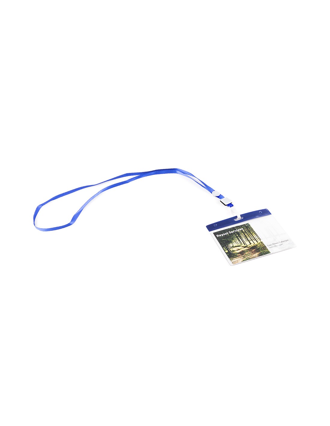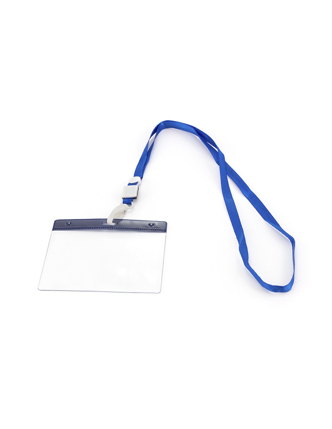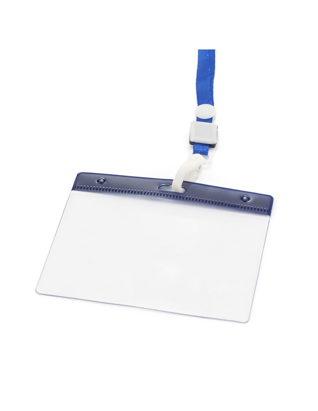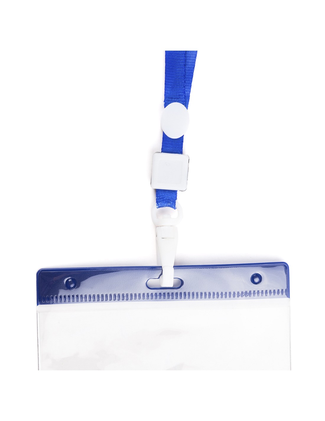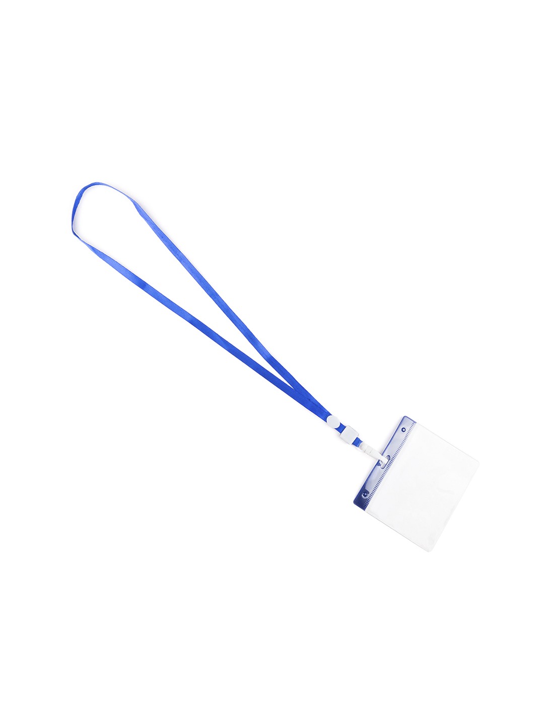 Identificador en PVC con lanyard a juego en vivos colores y con cierre de mosquetón. Pastilla circular para marcaje.