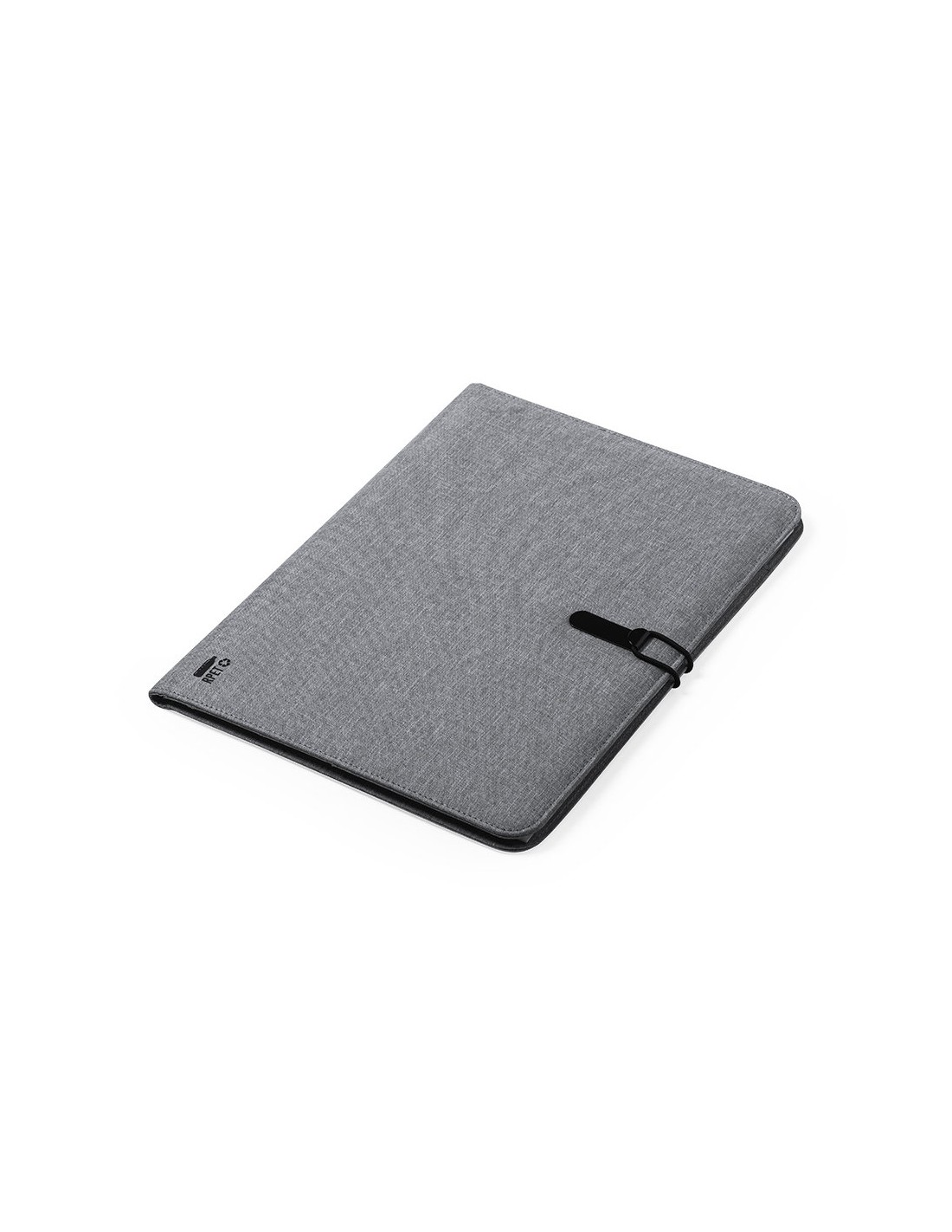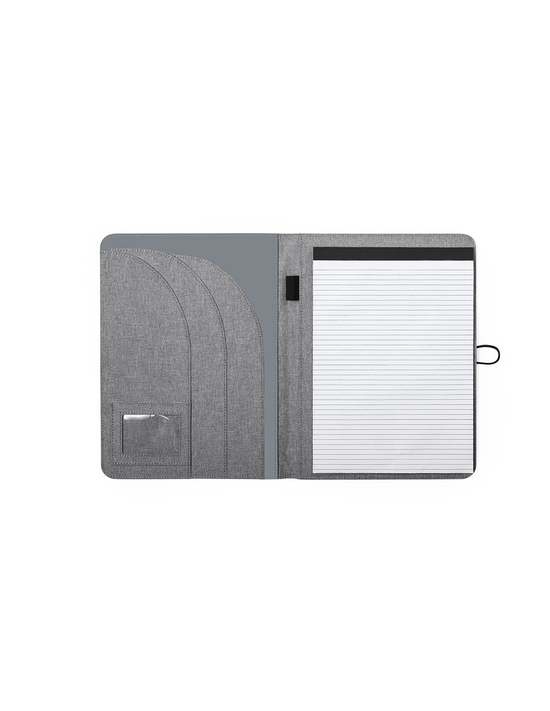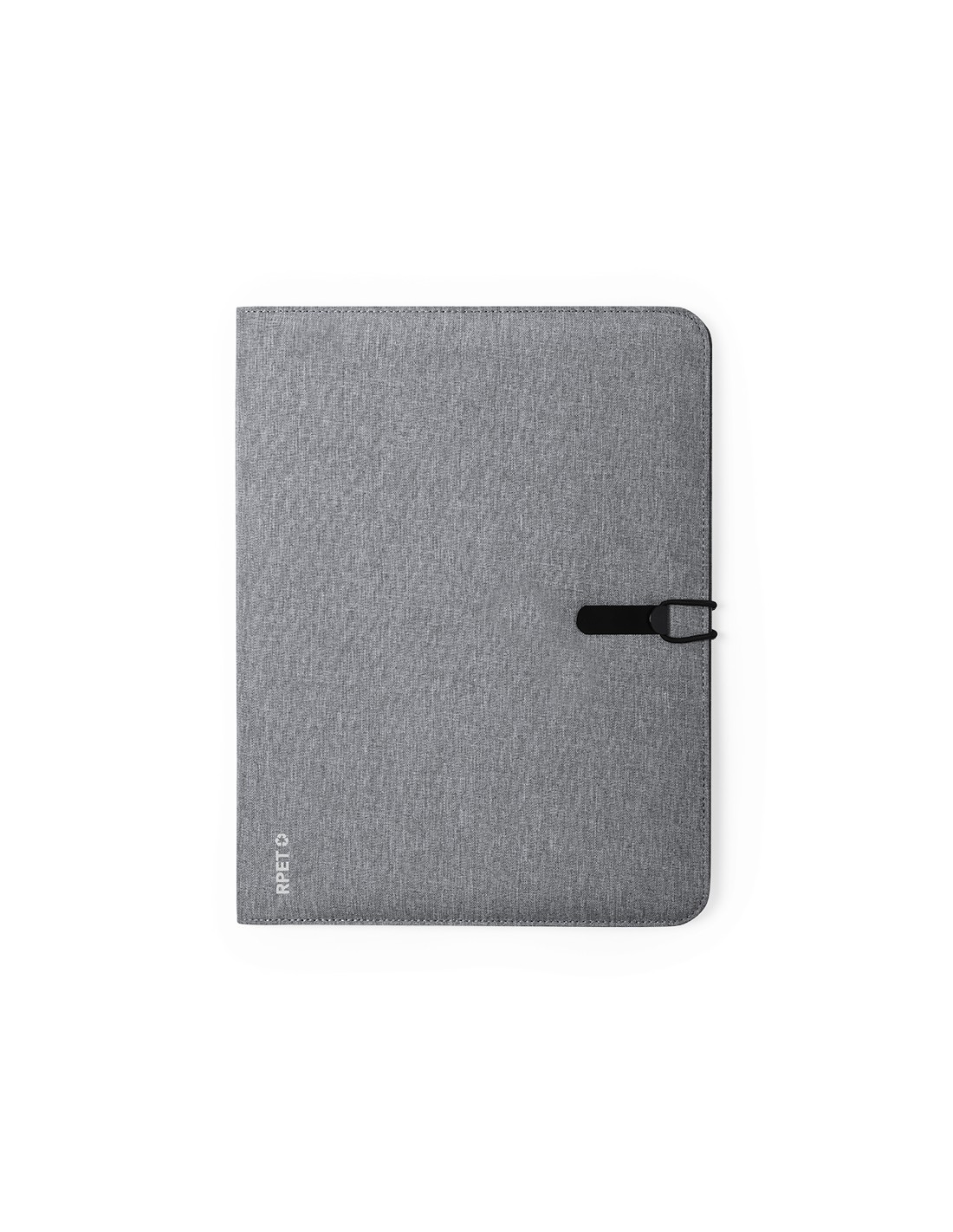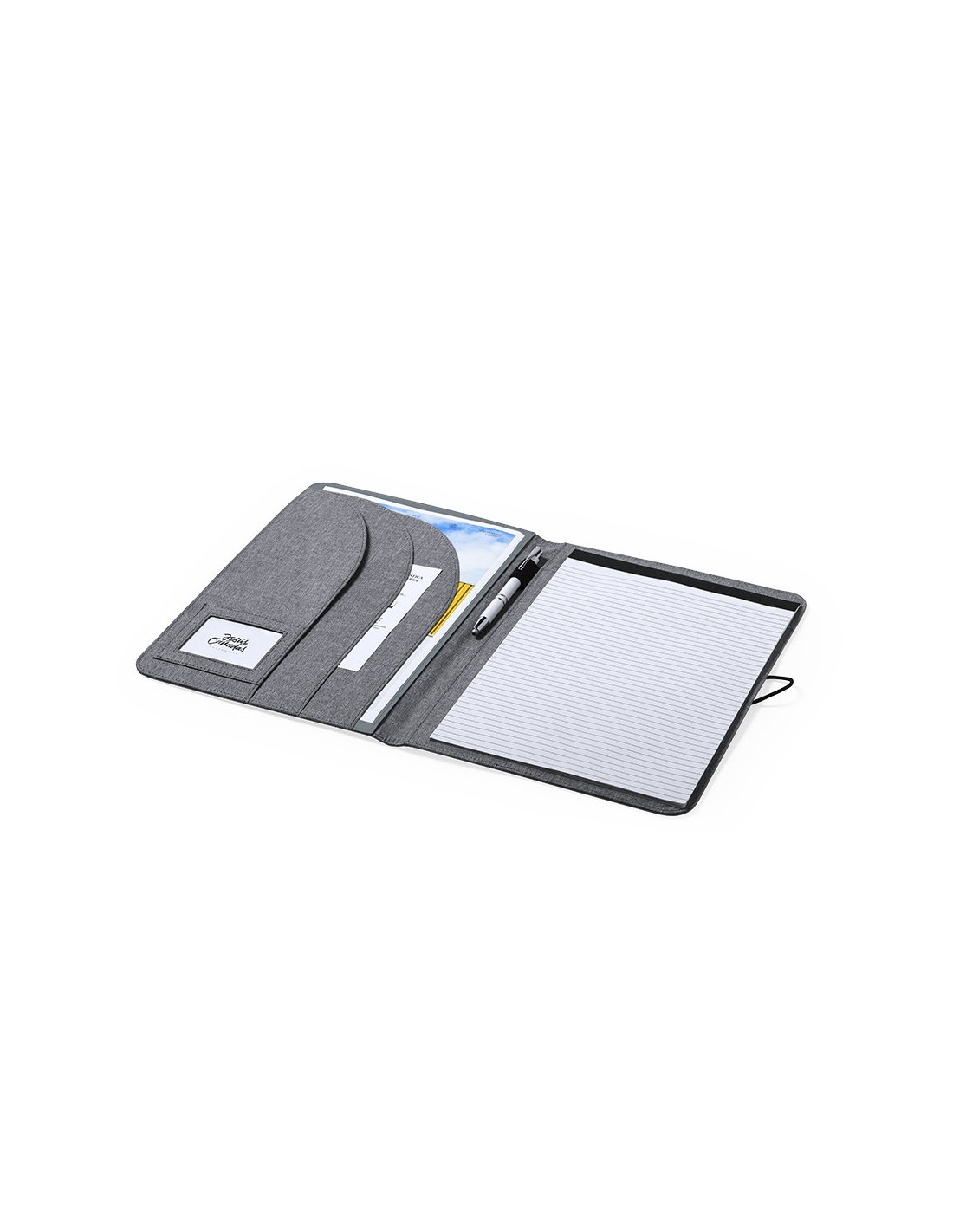 Elegante carpeta de línea nature tamaño A4. Fabricada en resistente 600D RPET efecto melange, elaborado a partir de plástico reciclado para así fomentar la reutilización de residuos plásticos y contribuir a la sostenibilidad del planeta. Detalles en negro y cierre metálico con cinta elástica especialmente diseñado para marcaje en láser. Interior con bloc extraíble de 20 hojas con disposición a una raya, 3 bolsillos de solapa, tarjeteros y soporte para bolígrafo. Distintivo RPET en esquina.